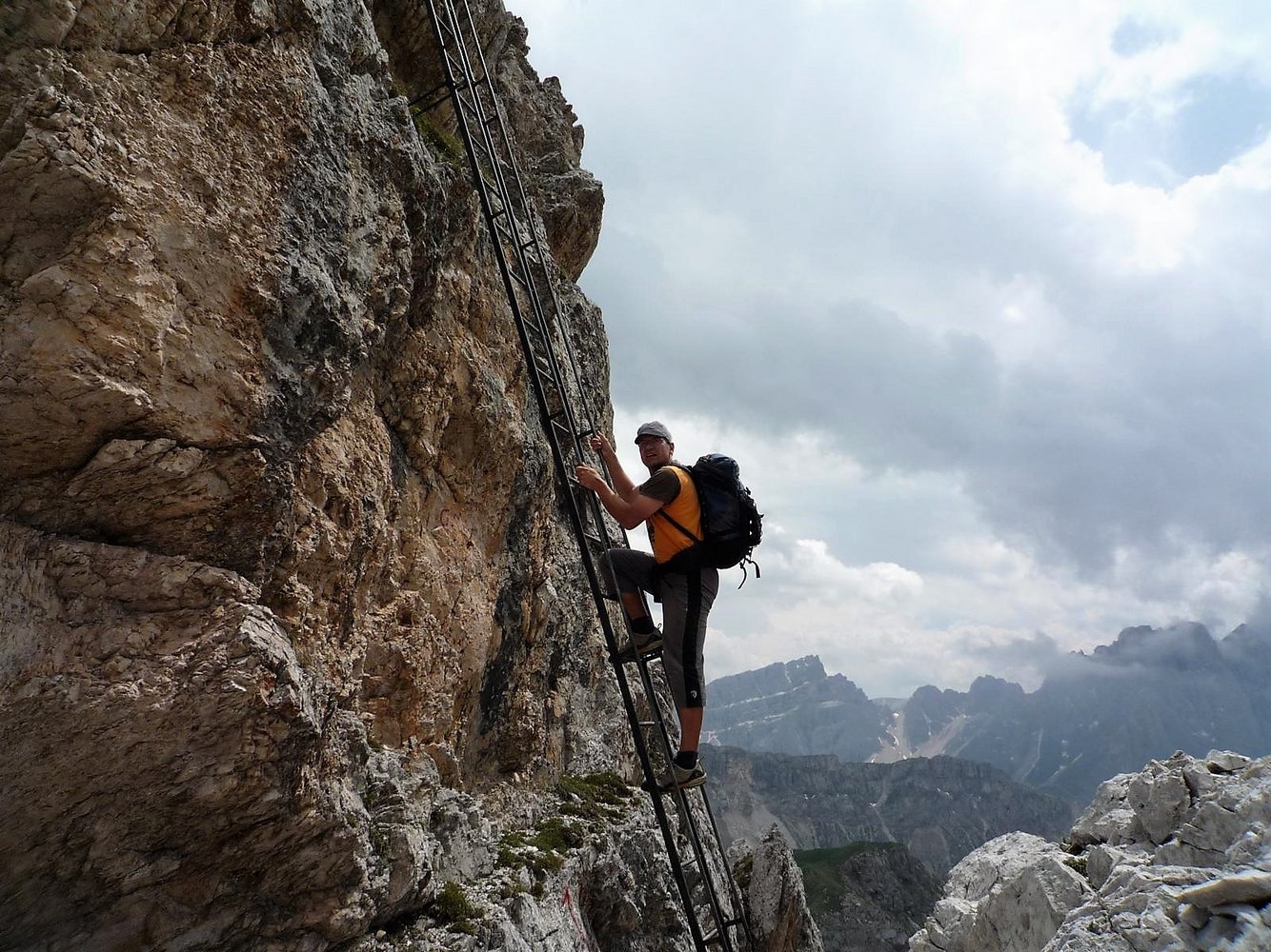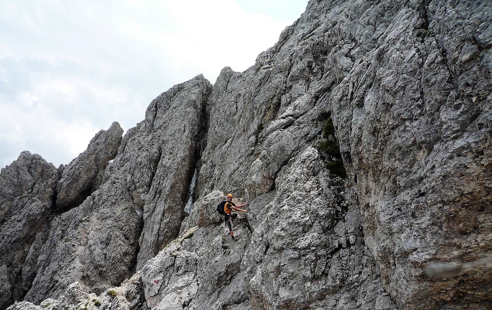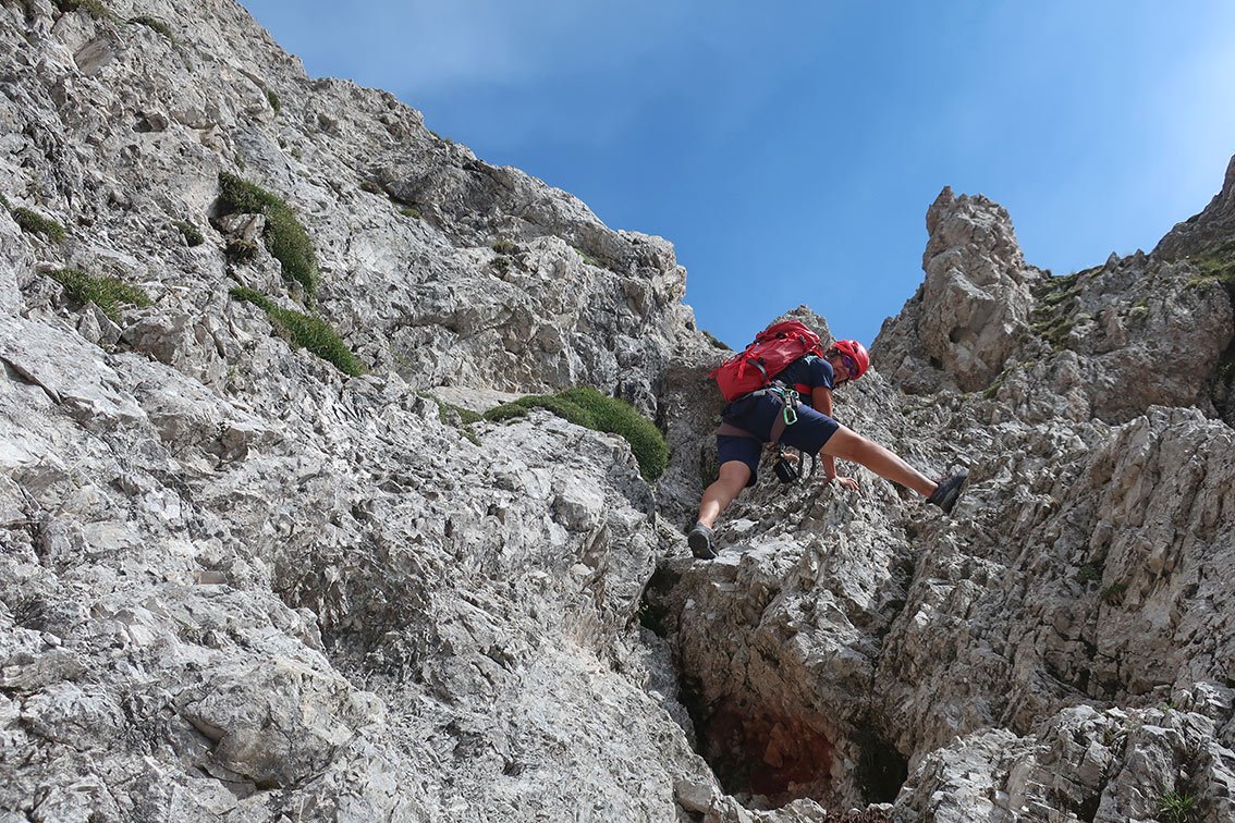 Siehe Topo. Durch die Rinne (A), dann an einer Kante (A/B) auf dem Grat zu einer markanten Scharte. Dort auf der Nordseite entweder direkt an einer Platte (C) oder links daneben (A/B) auf den nächsten Felsaufschwung. Weiter im Gehgelände bis zu einer erdigen Rinne (A/B) nach einer Scharte. Neuerliches Gehgelände (zu Beginn eine 1- Kletterpassage, rot markiert, danach ein längerer Gehabschnitt) führt zu einem Felsaufschwung mit einer 15-m Leiter (A/B). Anschließend nach Osten (kurz A) über einen Rücken zum Weg 4 Schlüterhütte - Peitlerscharte.