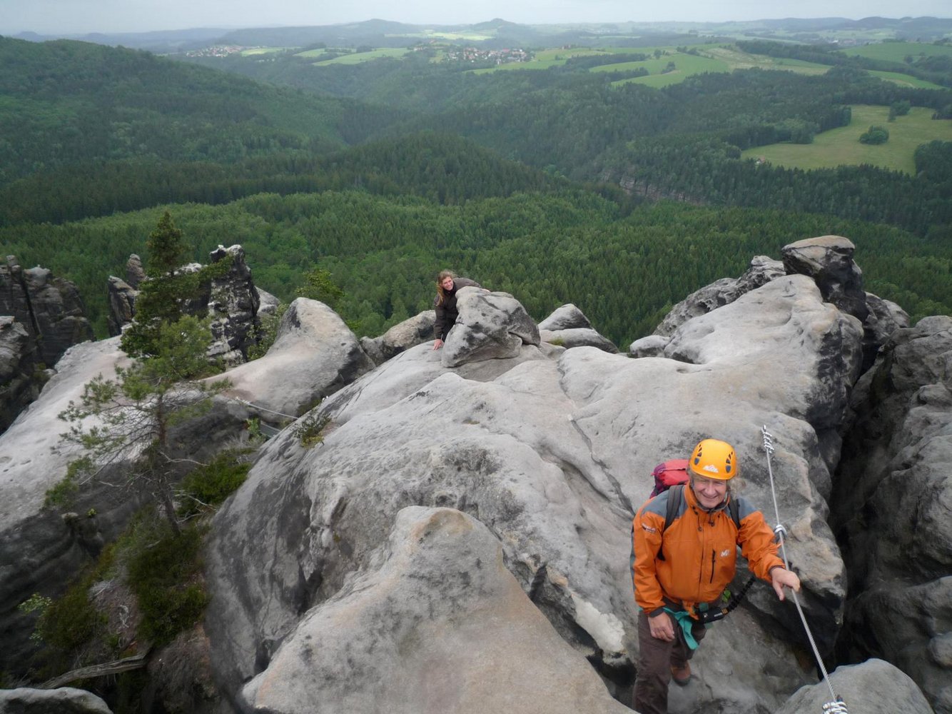 Vom Gipfel folgt man dem Weg über das lange Horn zur Abzweigung Reitsteig/Zurücksteig (Tafel) und steigt rechts über den Reitsteig zur Oberen Affensteinpromenade (Tafel) ab. Bei der Tafel geradeaus durch die Wilde Hölle (eine Stelle kurz A) und hinunter zur Unteren Affensteinpromenade. Dann rechts zurück zum Dietrichsgrund und dort links zum Parkplatz.