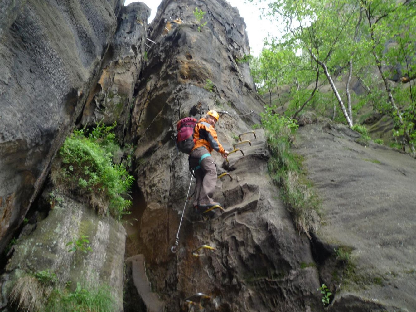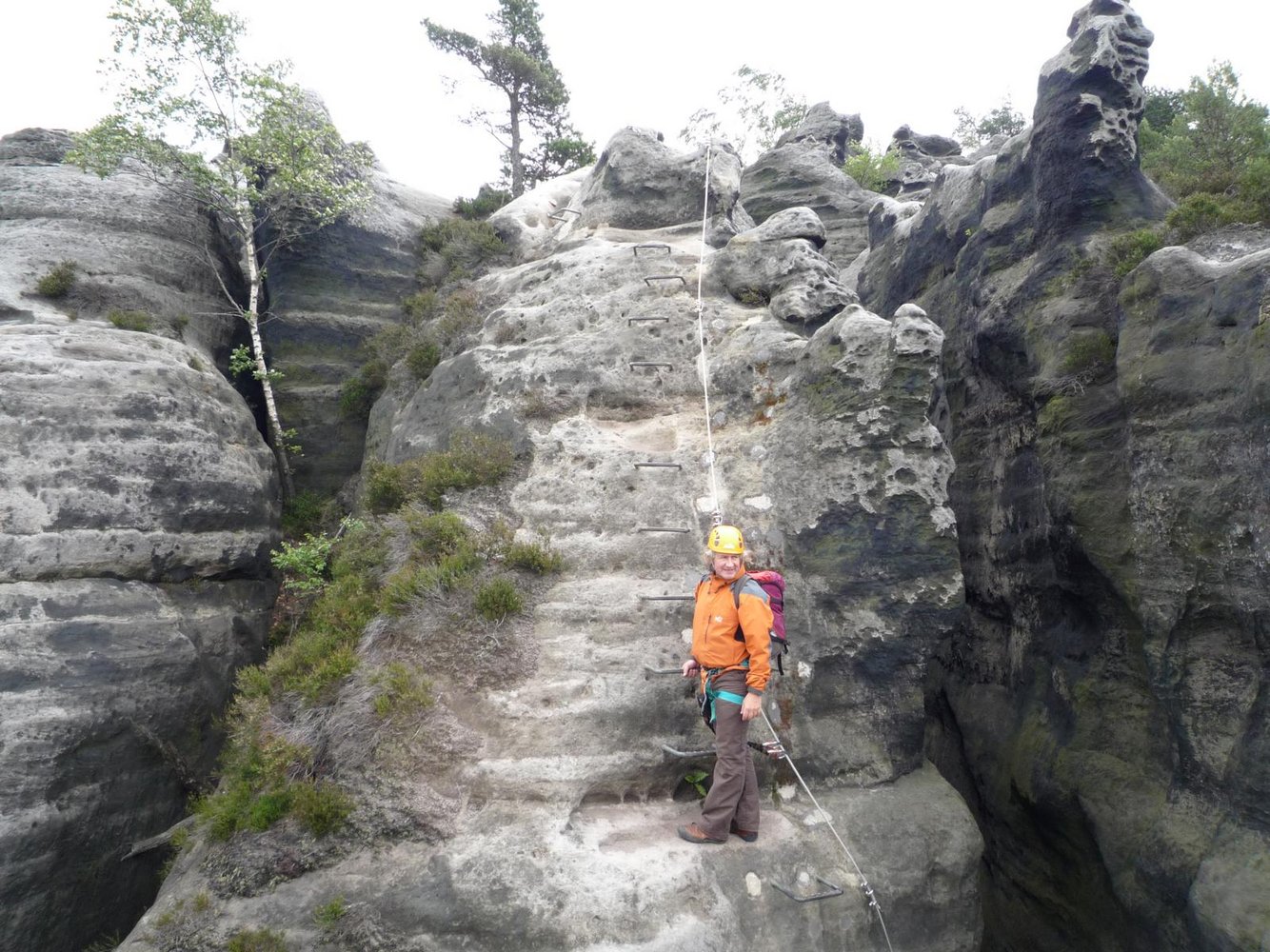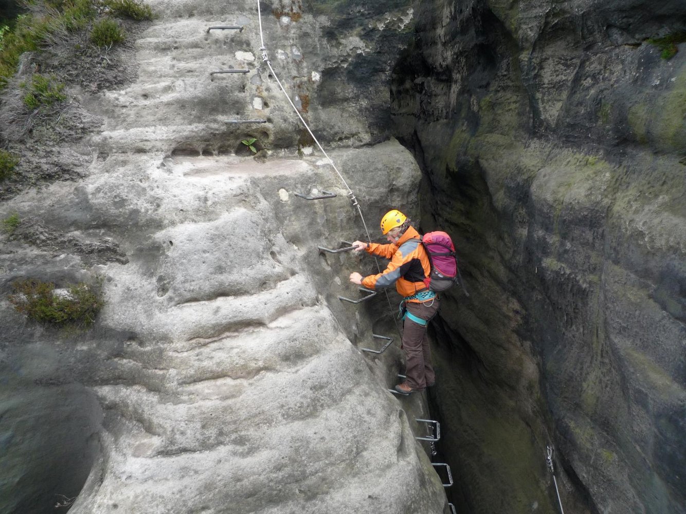 Der Erbauer, Rudi Häntzschel, hat in den Sechzigerjahren, als er Invaliditätspensionist war, die Häntzschelstiege ohne (Bohr-)Maschinenunterstützung illegal errichtet und im Jahr 1998 offi ziell saniert und ausgebaut. Einer der wenigen echten Klettersteig in der Sächsischen Schweiz besteht aus zwei ausgezeichneten, mit vielen Trittstiften, Griffeisen und stellenweise mit einem Sicherungsstahlseil ausgerüsteten Teilabschnitten. Der Aufstieg auf das Horn verläuft im oberen Teil durch einen tiefen Spalt (Kluft). Der Klettersteig ist bei schönem Wetter an den Wochenenden zwar ziemlich überlaufen, sollte allerdings, schon alleine aufgrund der wunderbaren Landschaft, in keinem Tourenbuch fehlen.