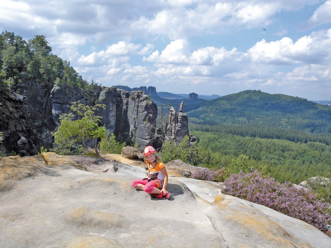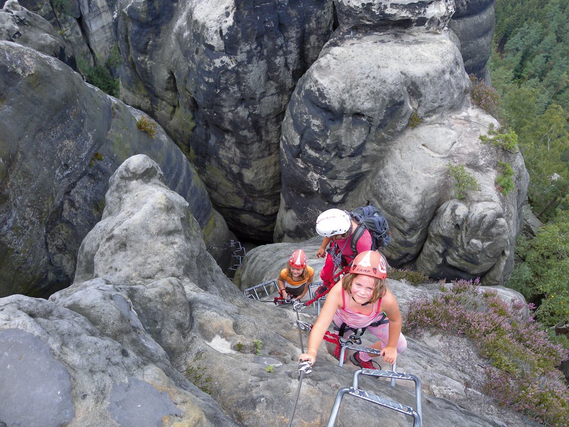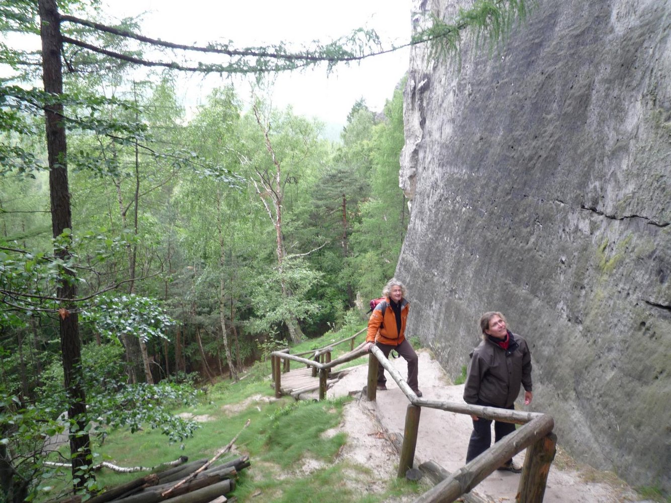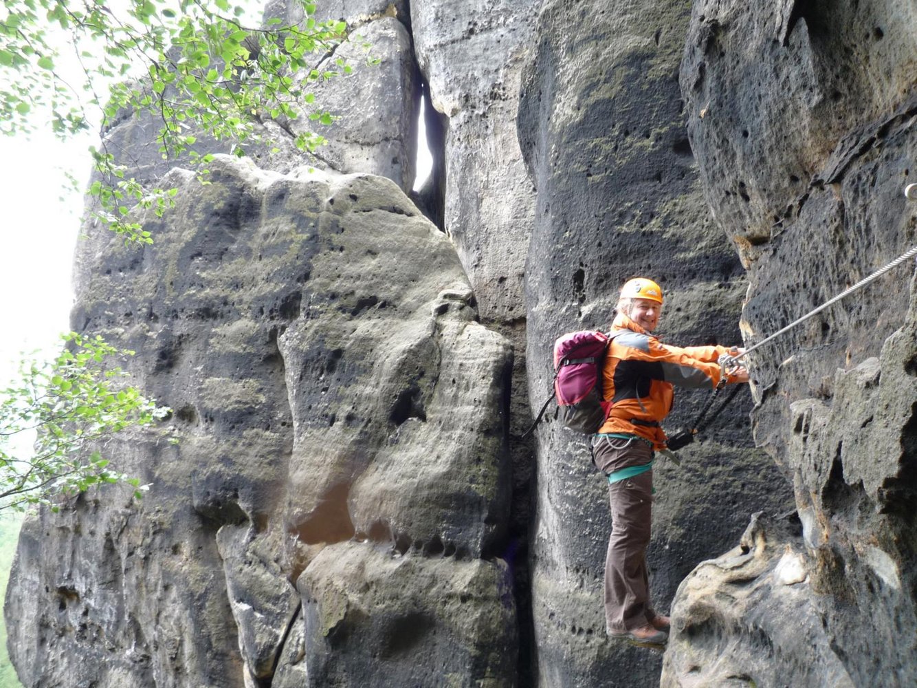 Der Erbauer, Rudi Häntzschel, hat in den Sechzigerjahren, als er Invaliditätspensionist war, die Häntzschelstiege ohne (Bohr-)Maschinenunterstützung illegal errichtet und im Jahr 1998 offi ziell saniert und ausgebaut. Einer der wenigen echten Klettersteig in der Sächsischen Schweiz besteht aus zwei ausgezeichneten, mit vielen Trittstiften, Griffeisen und stellenweise mit einem Sicherungsstahlseil ausgerüsteten Teilabschnitten. Der Aufstieg auf das Horn verläuft im oberen Teil durch einen tiefen Spalt (Kluft). Der Klettersteig ist bei schönem Wetter an den Wochenenden zwar ziemlich überlaufen, sollte allerdings, schon alleine aufgrund der wunderbaren Landschaft, in keinem Tourenbuch fehlen.