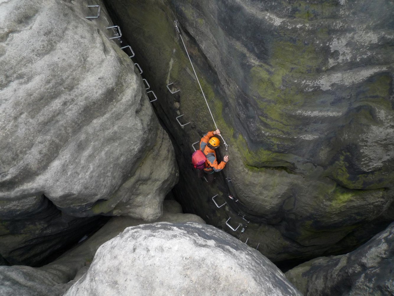 Siehe Topo: Nach ein paar Klettermetern (1-) erreicht man an der Einstiegswand die ersten Klammern und das Seil (B). Es folgen eine Rampe (A) und eine exponierte Linksquerung (B) in die Schlucht. In der Schlucht über eine Holzleiter und Klammern (B) hinauf auf einen Absatz mit Aussichtsplattform. Dort führt rechts eine Eisenleiter auf die Obere Affensteinpromenade. Bei einer Tafel gerade hinauf zu einem engen Spalt mit Trittstiften und einer Leiter (B). Nach der Leiter und weiteren Trittstiften (B) wechselt man mit einem Übertritt die Spaltseite und gelangt zur luftigen, aber leichten (A/B) Ausstiegswand. Es folgen noch eine kurze Brücke und ein Übertritt (A).