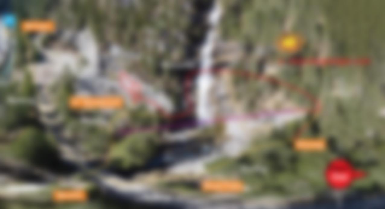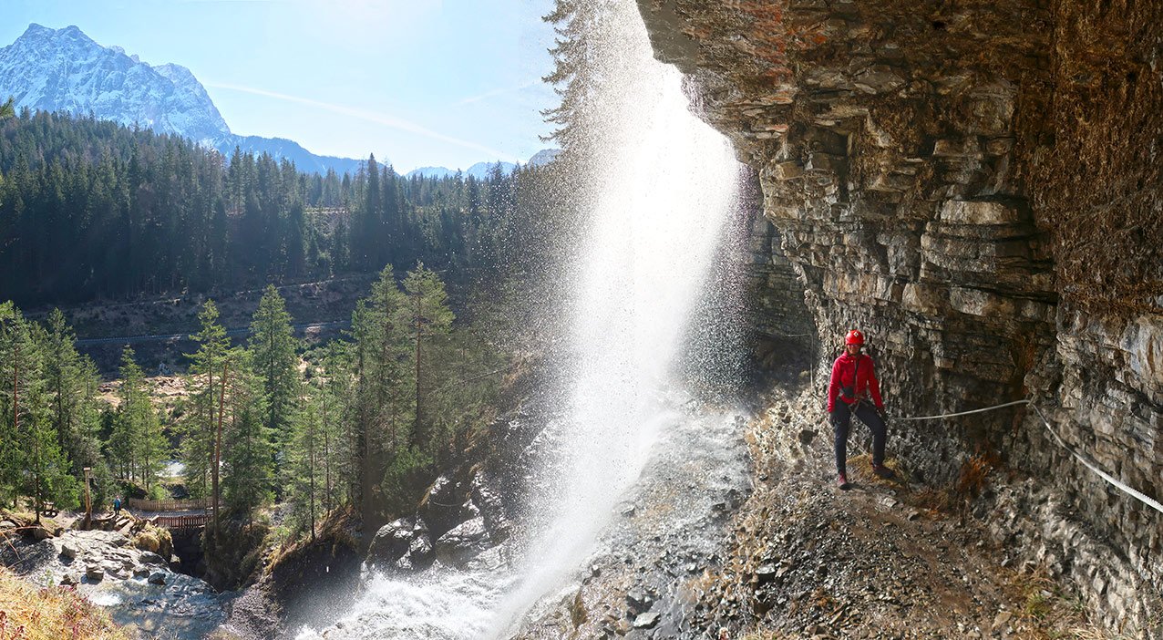 Vom Parkplatz etwas der Straße in Richtung Garmisch bis zur Brücke folgen, über den Bach, dann auf dem Radweg wieder in Richtung Norden bis zu einer Brücke (dort sieht man den Wasserfall). Dort entweder links zum kleinen Steinbruch oder rechts zur Rastbank und zur Wasserfall-Klettersteigrunde.