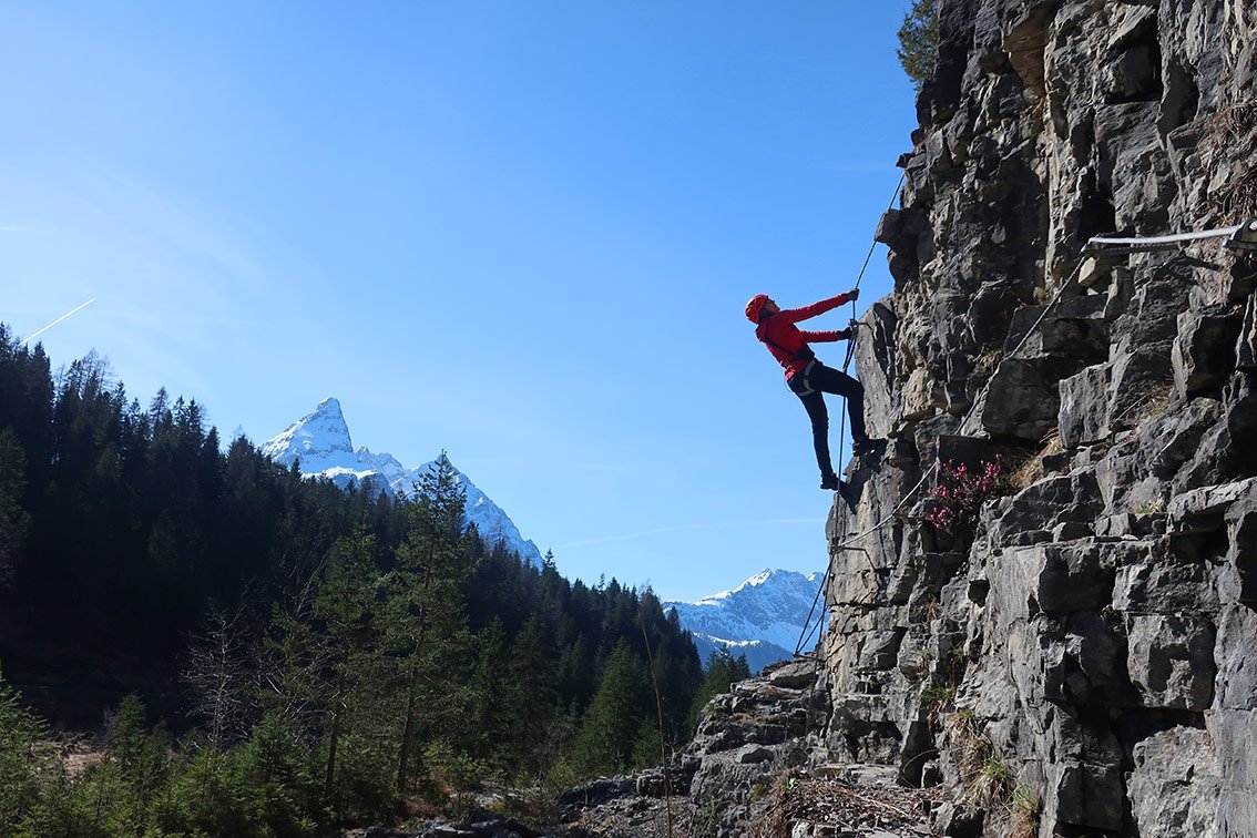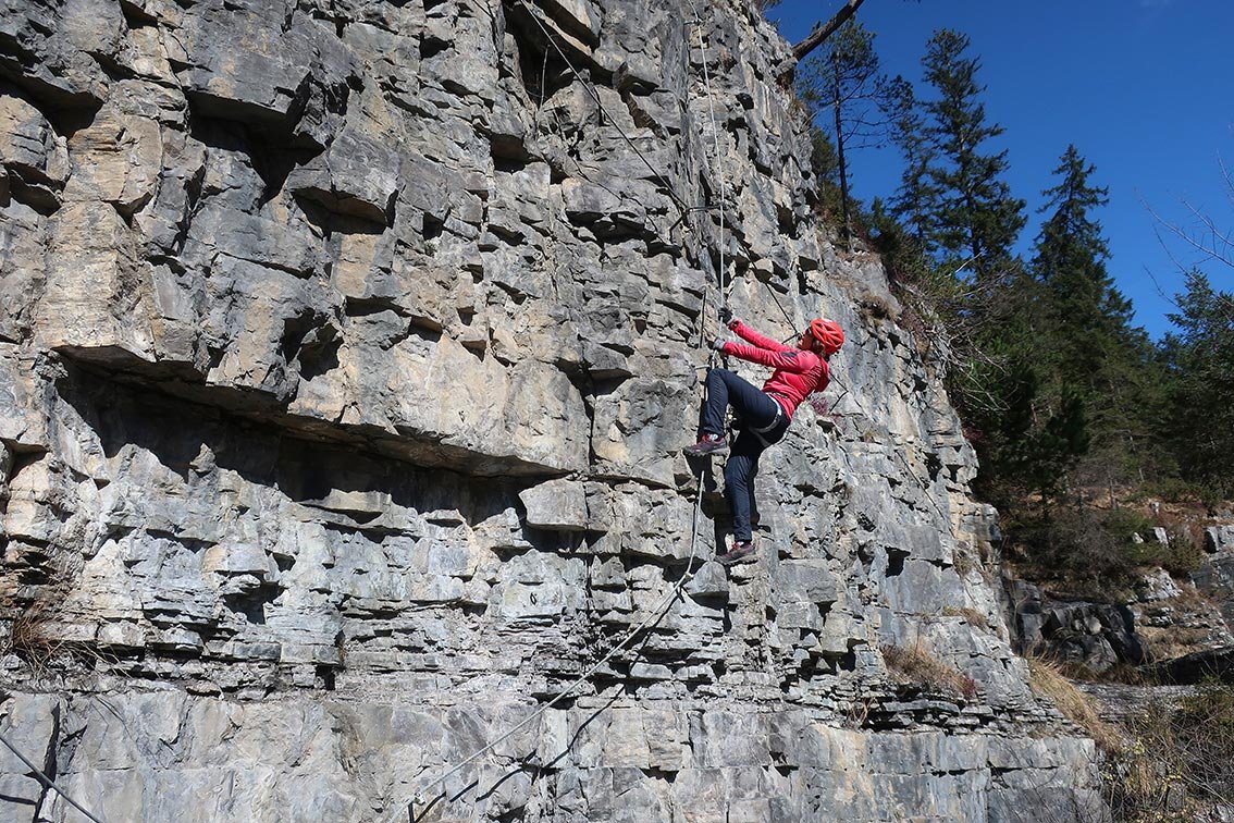 Idealerweise fängt man rechts mit der Wasserfall-Klettersteig Runde an und kommt so aufgewärmt zu den steilen Varianten im kleinen Steinbruch.