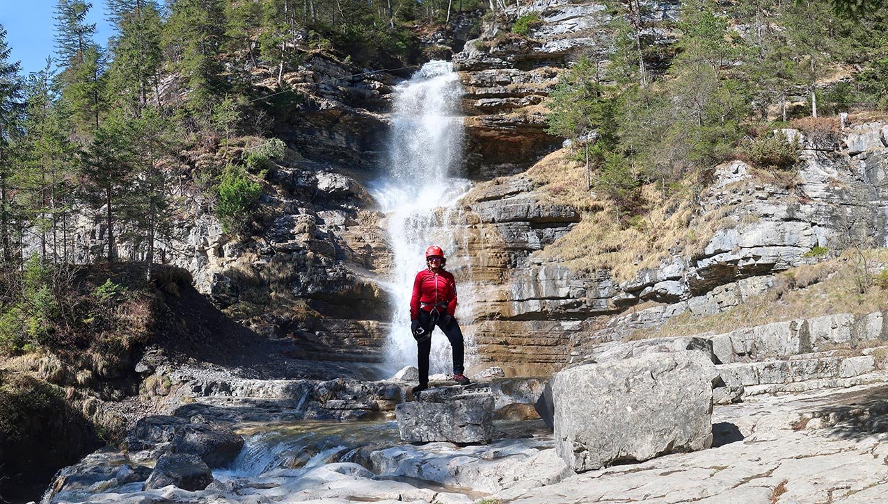Siehe Topo, dieses gibt es vorab für Besitzer der TourenApp bei den Klettersteigführern Österreich bzw. Deutschland. Die Route unter dem Wasserfall ist B, nur die nicht verpflichtenden vertikalen Passagen im kleinen Steinbruch sind C bzw. C/D.