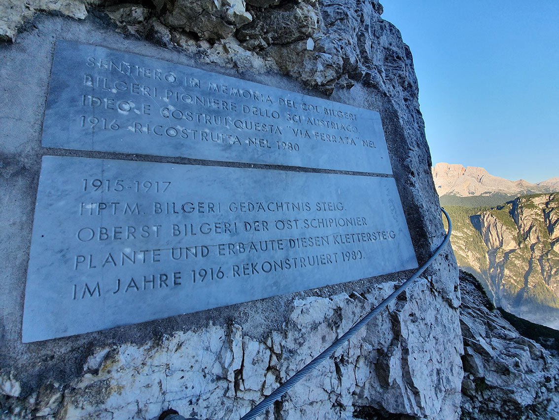 Der Hauptmann Bilgeri Klettersteig ist am Nordrand der Wiesenhochfläche des Monte Piano, der Gipfelbereich war im Ersten Weltkrieg eine heftig umkämpfte Region. Der Nordgipfel war von den Österreichern und der Südgipfel von den Italienern besetzt. Auf zahlreichen, teilweise gut erhaltenen und liebevoll restaurierten Steigen (Historischer Rundweg) kann man sich ein Bild von den damaligen Kriegshandlungen machen. Eine der beliebtesten Kurz-Ferratas ist der Hauptmann-Bilgeri-Steig unterhalb des Monte Piano Gipfels.