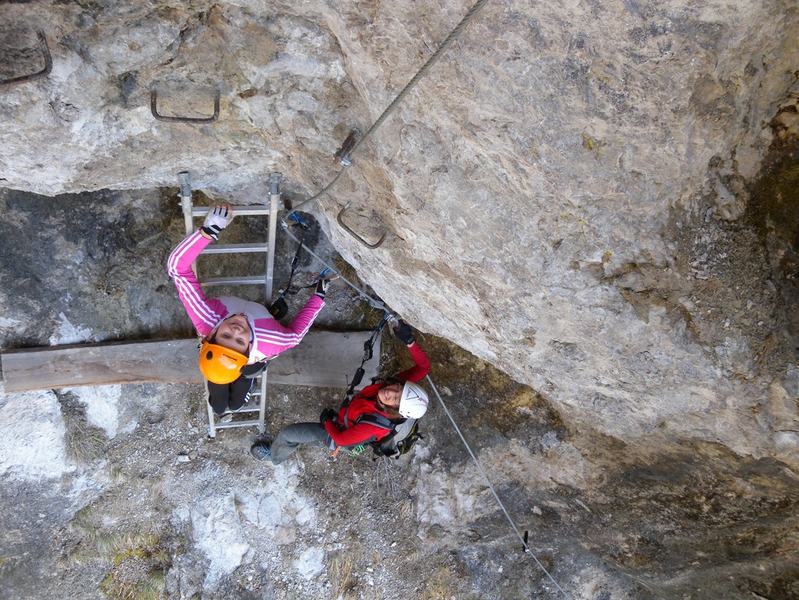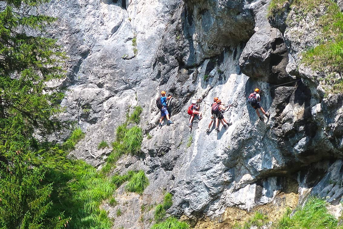 Komplette Klettersteigausrüstung und Helm. Für Kinder evtl. ein Sicherungsseil.