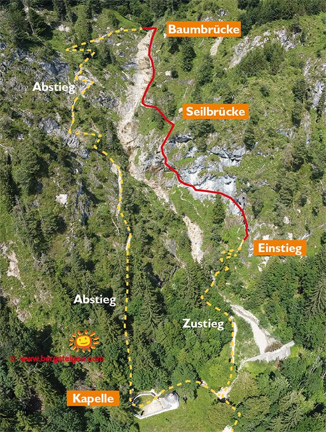 Details siehe Topo. Immer an der rechten Seite der Klamm turnt man über eine Leiter und Baumstämme steil nach oben (Stellen bis C). In der Mitte der Steiganlage wird es leichter, nach einer 3-Seilbrücke folgt eine plattige und gestufte Querung (A/B und B). Am Ende (dort wieder kurz C) über eine Baumstammbrücke auf die andere Bachseite balancieren und zum Abstiegsweg.