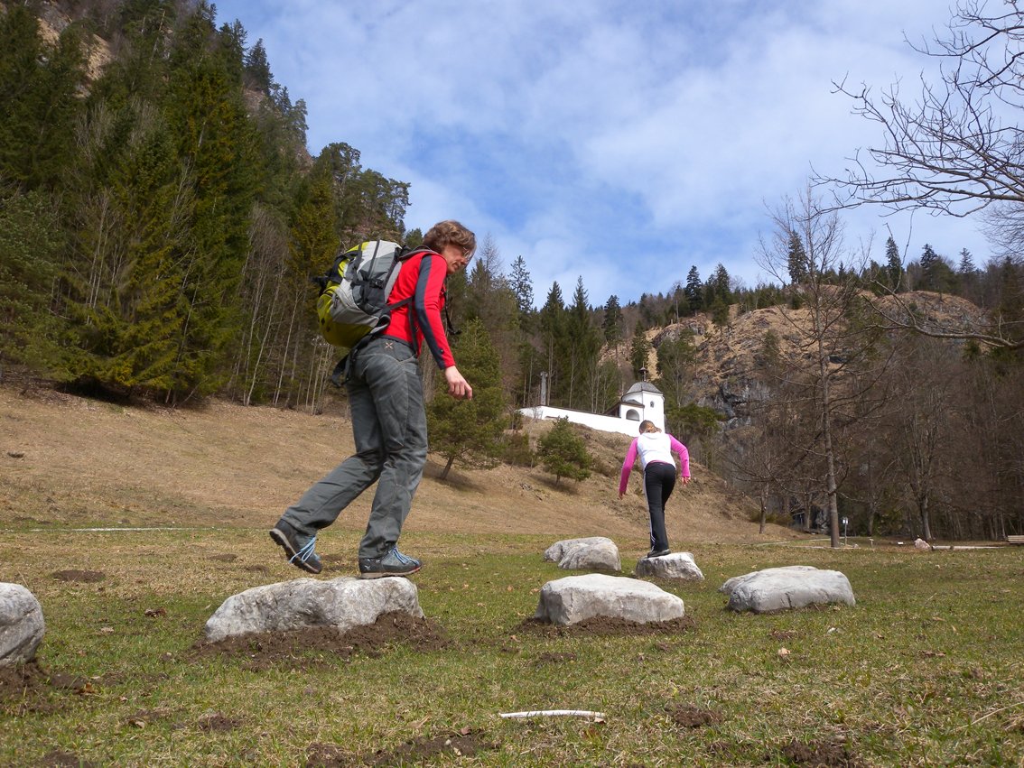 Vom Festsaal zur Kirche und von dort in Richtung der schon sichtbaren Klamm. Beim Barfußpark zum Bach und über die Brücke auf die andere Bachseite. Gleicht hinter der Brücke zweigt ein Steig ab, über eine steile Wiese erreicht man den Einstieg.
