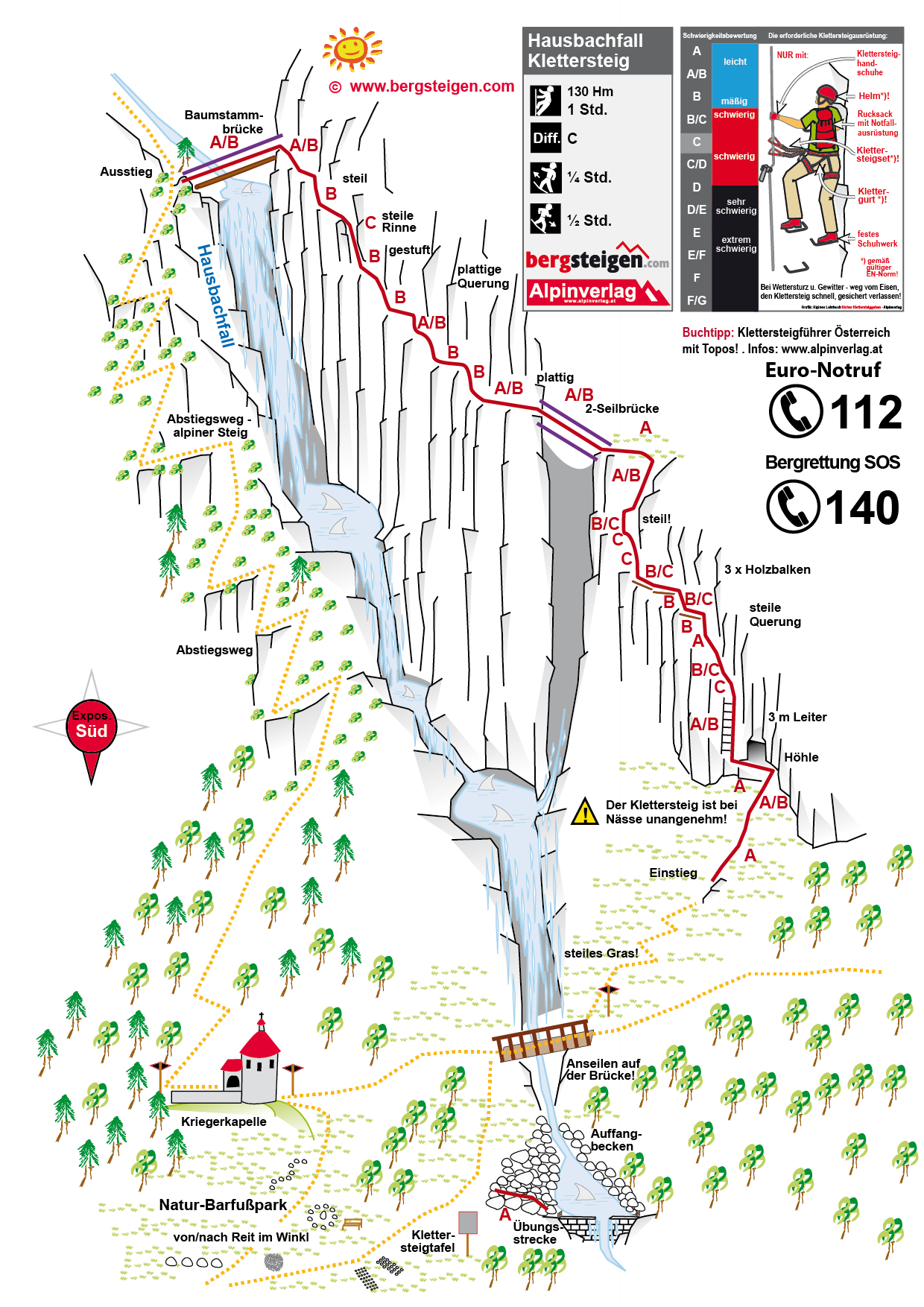 Achtung: Bei Nässe ist der Hausbachfall-Klettersteig sehr unangenehm. Für eine Begehung sollten unbedingt trockene Bedingungen herrschen. Für Kinder und kleine Personen ist der Steig wegen des teilweise etwas zu hohen Seils mit C/D zu bewerten. Man kann die Tour auch mit einer Wanderung hinauf zum Wetterkreuz verbinden. Nach dem Hausbachfall zur Glapfalm, dort links hinauf zum Wetterkreuz. Absteigen kann man den gleichen Weg oder man geht die Schleife hinunter nach Birnbach.