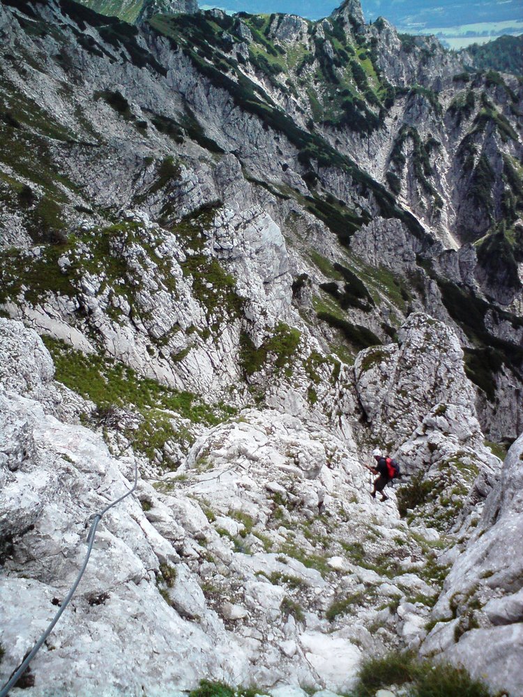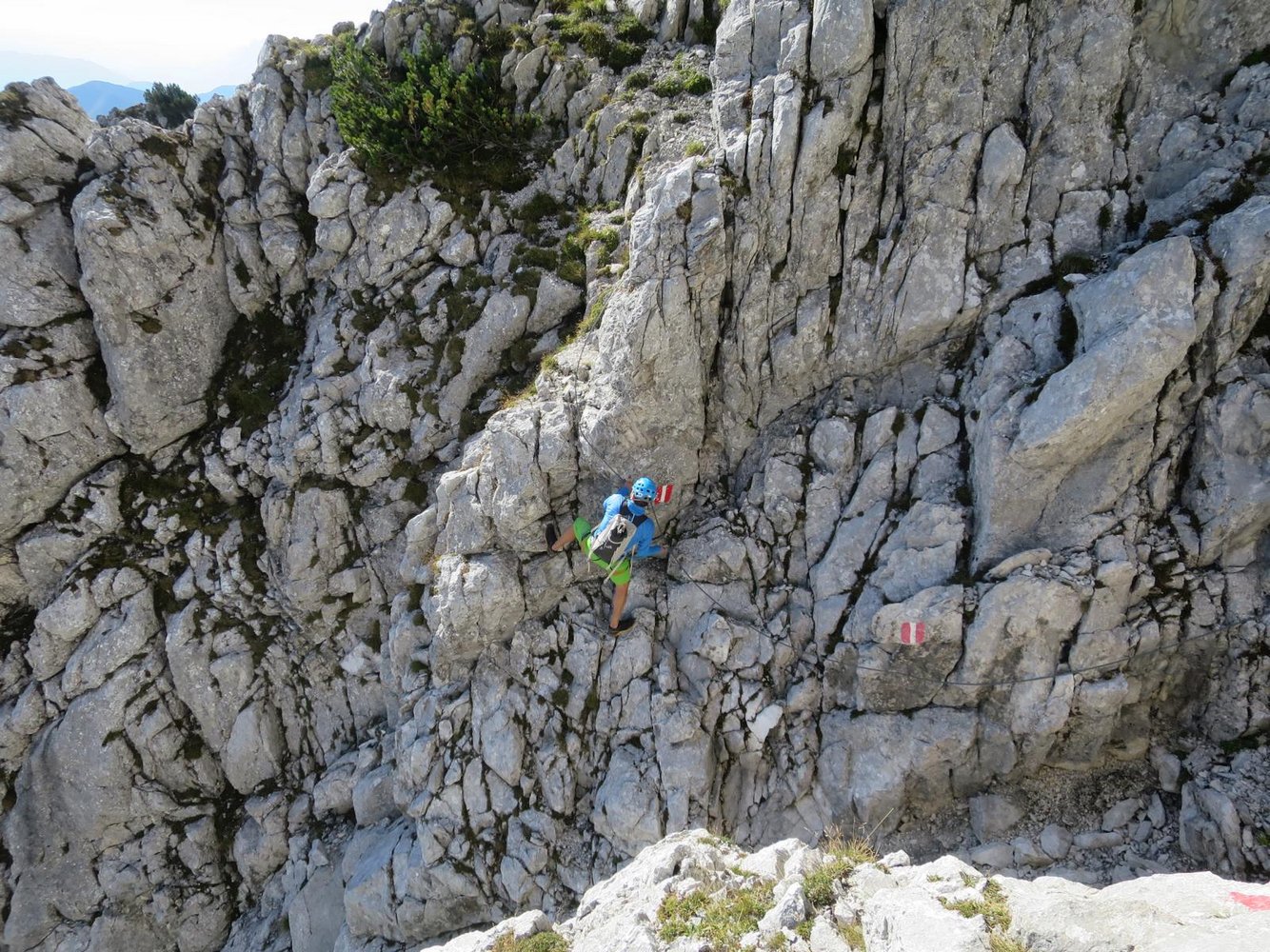 Es empfiehlt sich der Abstieg über den Klettersteig, alternativ ab der Abzweigung über Weg 634 ins oberste Roßkar absteigen und anschließend in die Natterriegelscharte aufsteigen (schattig, im Frühjahr und Herbst feucht und länger). Von dort am Aufstiegsweg zurück ins Tal.