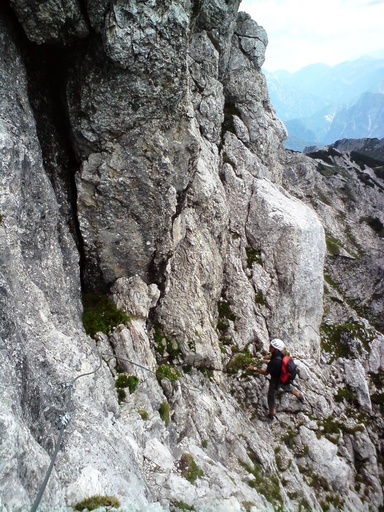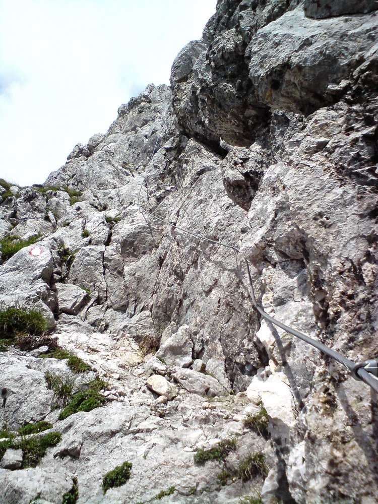 Vom Einstieg 50 m nordseitig entlang der ersten Versicherungen (A) auf den Hauptgrat. Weiter über die steile Felskante absteigend (zuerst B, dann 1-) auf einen Rasenkamm, diesen leicht links ansteigend (1-) zum Fuße des großen Turmaufbaues. Südseitig über eine Rampe (A) aufsteigen und anschließend kurz abklettern (A/B, Steigbuch). Über die Schlüsselstelle (B/C) in die markante Schlucht einsteigen. Leichter (zuerst A, dann B) etwa 60 m in die Turmscharte aufsteigen. Weiter leicht rechts haltend über den Kammrücken und über leichten Felsgrat (1-) zur Rosskarscharte abklettern. Hier Ausstieg und Einmündung in den Normalweg.
