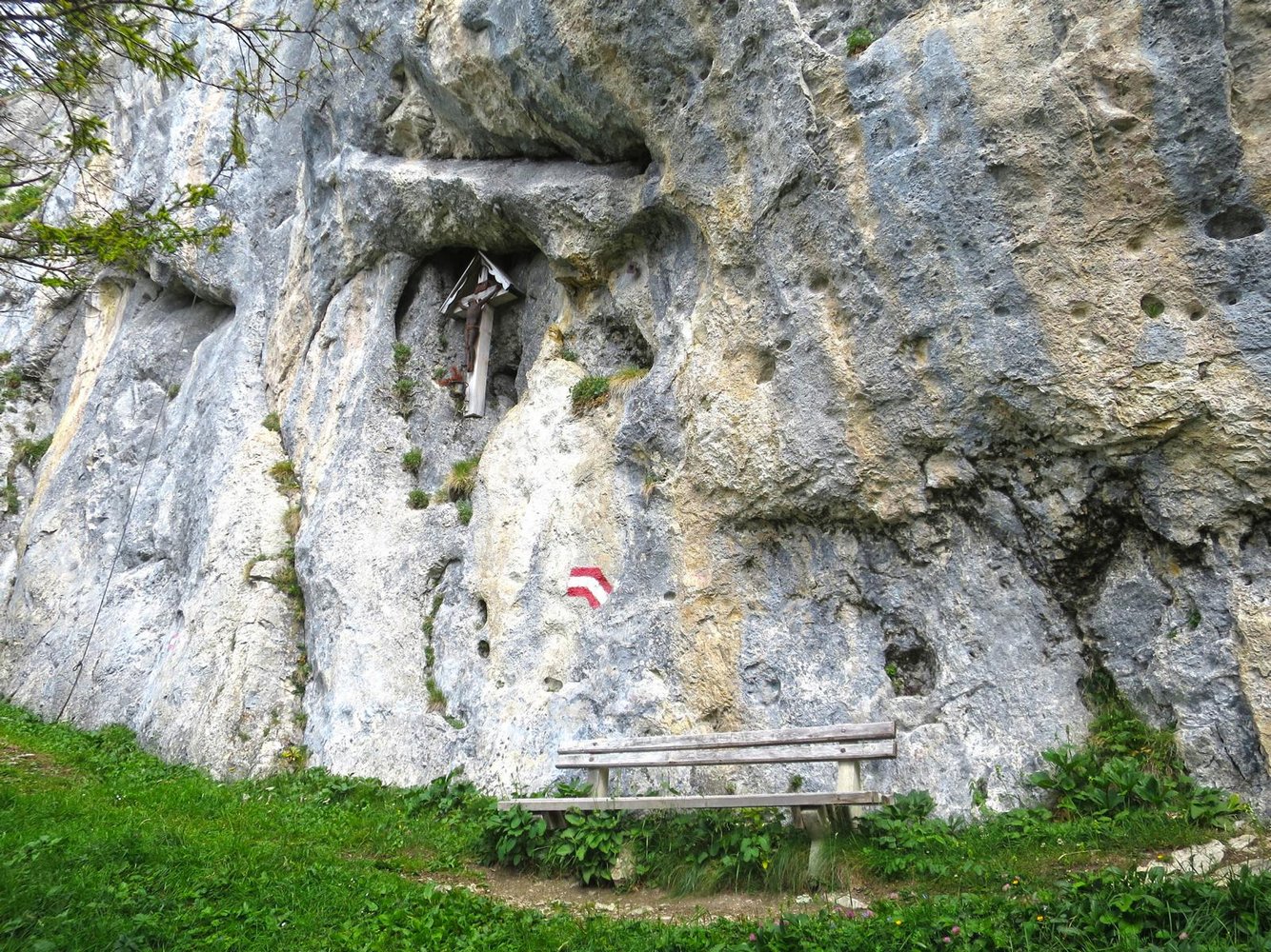 Vom großen Parkplatz bei der Rosemie Alm vorbei an der Alm und über die Skipiste nach rechts in den Wald, wo man in einer Kehre auf den Horstigweg trifft, NICHT links zum Friedenskircherl (Tafel am Baum in der Kehre) sondern rechts absteigen, später die Straße bei einer Kehre queren bis zum Verlobungskreuz (Holzkreuz an der Felswand bei beim gleichnahmigen Klettergarten Verlobungskreuz). Vom Kreuz dem Weg noch wenige Meter abwertis zu einer Forststarße - die nach recht zur Stoder-Mautstraße führt. Dieser Straße bei einer Holzhütte nach LINKS (Osten) folgen kurz aufsteigned bis vor einem Hochsitz, Hier führt der Zustiegstgweg nach links (Steinmänner) kurz durch den Wald und später über einen Geröllhalde zum Einstieg.