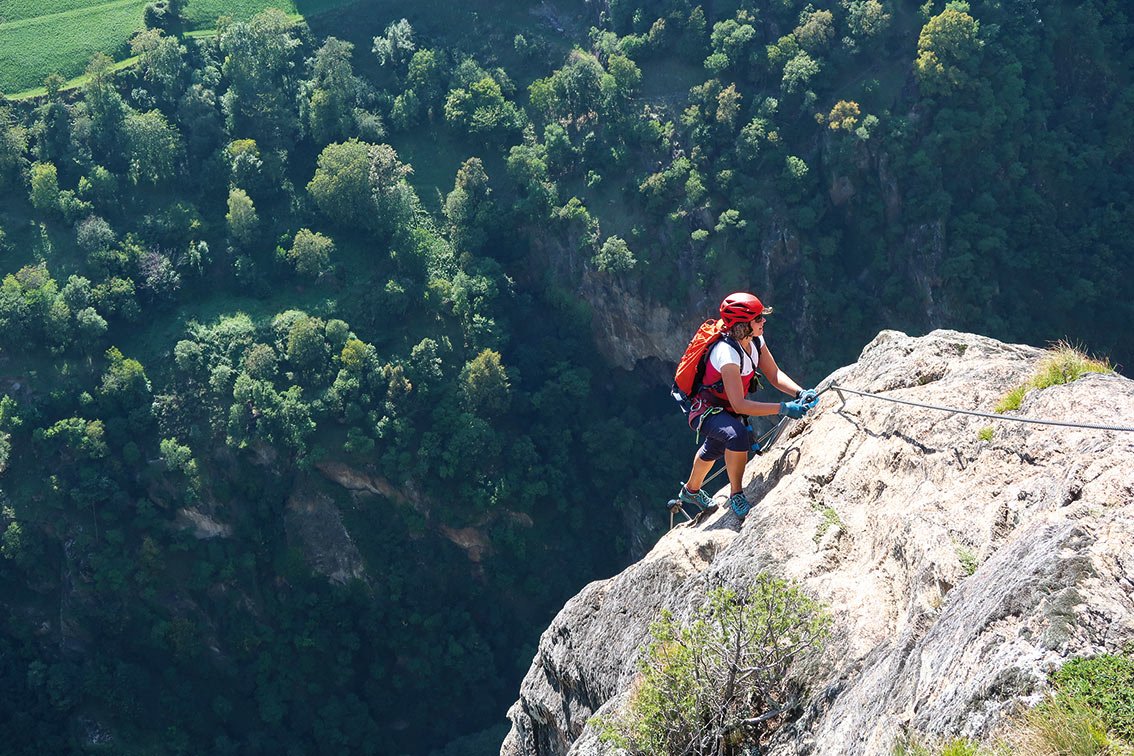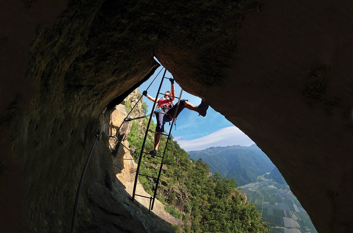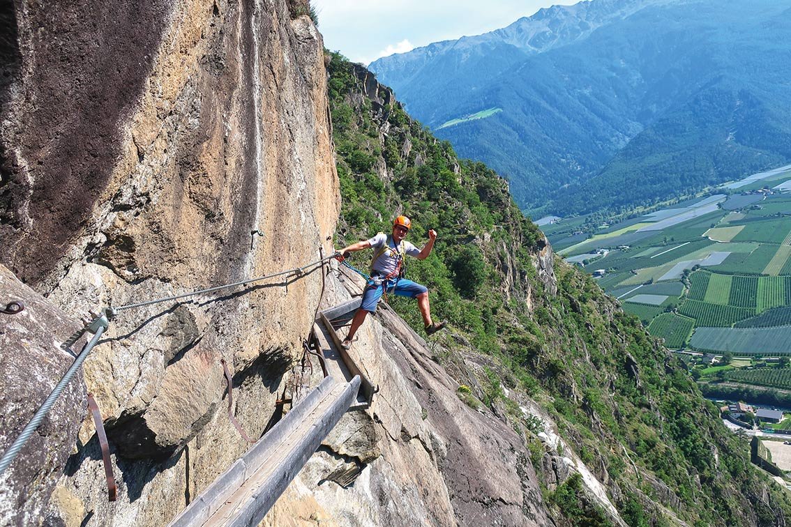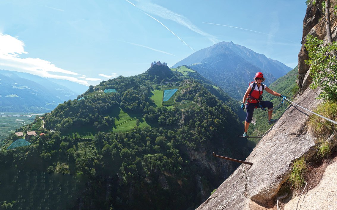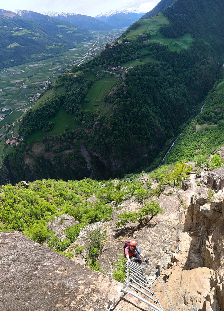 Einen gewaltigen Klettersteig haben die Verantwortlichen am Beginn des Schnalstales - genau gegenüber der Reinhold Messner Burg Juval - erschaffen. Obwohl "nur" ein Talklettersteig, erfordert diese Tour viel Durchhaltevermögen, ähnlich wie an einem 8000er kommt die Schwierigkeit erst kurz vor dem Ziel. Der lange Klettersteig quert im Mittelteil auf einem alten Waal (Wasserleitung zur Bewässerung der Landwirtschaft im Tal). Auf einem kurzen Stück wurde das alte Holz-Kanalsystem sogar nachgebildet. Auf den alten Eisenstreben war die Jahreszahl 1855 zu lesen, es dürfte sich somit um eine sehr alte Waalanlage gehandelt haben. Im oberen Teil gibt es eine knackige D/E-Variante und eine ausgesetzte Riesenleiter (auch als Varianten C/D) zu bezwingen. Den Klettersteig sollte man als Bergsteiger unbedingt mit einem Besuch des Schlosses Juval verbinden. Das Schloss ist das erste Messner Museum und wurde eindrucksvoll gestaltet - ein guter Mix aus alter Burgruine und dem "Mythos Berg" - vom Expeditionskeller bis hin zu eindrucksvollen Kunstwerken, man taucht in die Welt von Reinhold Messner ein.