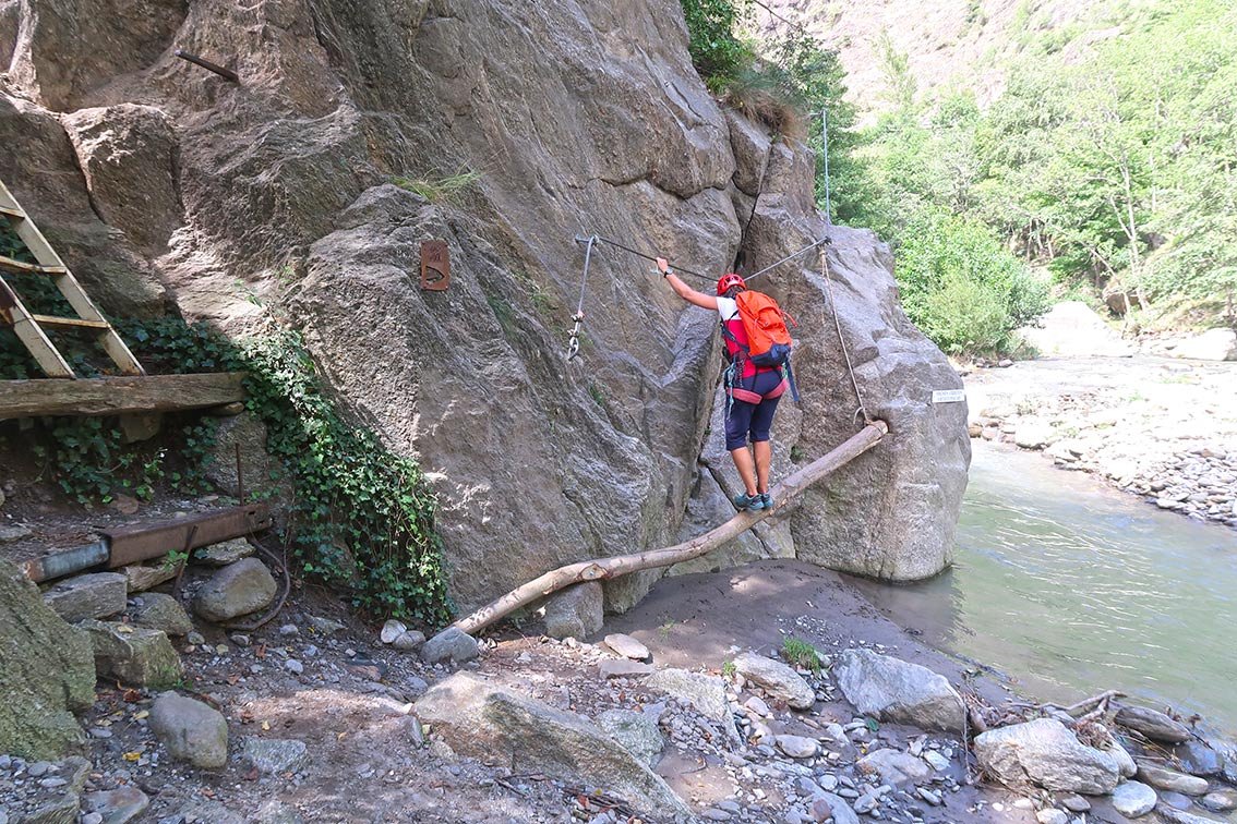 Siehe Topo. Im ersten Teil, bis zur alten Straße nach der Seilbrücke, kurze Passagen bis C/D, meist ist das Gelände aber leichter (B) - zu Beginn sehr viele Gehpassagen. Bei der langen Seilbrücke (B/C) kann man auf der alten Talstraße die Ferrata verlassen. Der zweite Teil beginnt steil (C/D), danach folgt eine lange Plattenpassage (bis B/C), welche zur Waalquerung (B und B/C) führt. Dann kommt eine sehr steile Wandpassage (D) vor einem Rastplatz. Man folgt links einem Pfad (tlw. absteigend, rot markiert) und erreicht nach einer kurzen Stufe (C/D) die Rampe (C). Vor der Rampe zweigt beim Steigbuch links die Plattenpanzervariante ab (D/E; direkt E/F), oben rechts gibt es die Varianten Riesenleiter (C/D - siehe Topo). Nach der C-Rampe steil (D) zur kleinen Leiter, danach kommt eine Linksquerung mit Steilstufen (bis D). Eine lange Wandpassage führt hinauf zum Gehgelände mit Buschwerk. Man folgt dem Pfad zum letzten Pfeiler und erreicht sehr steil (C/D) den Ausstieg.