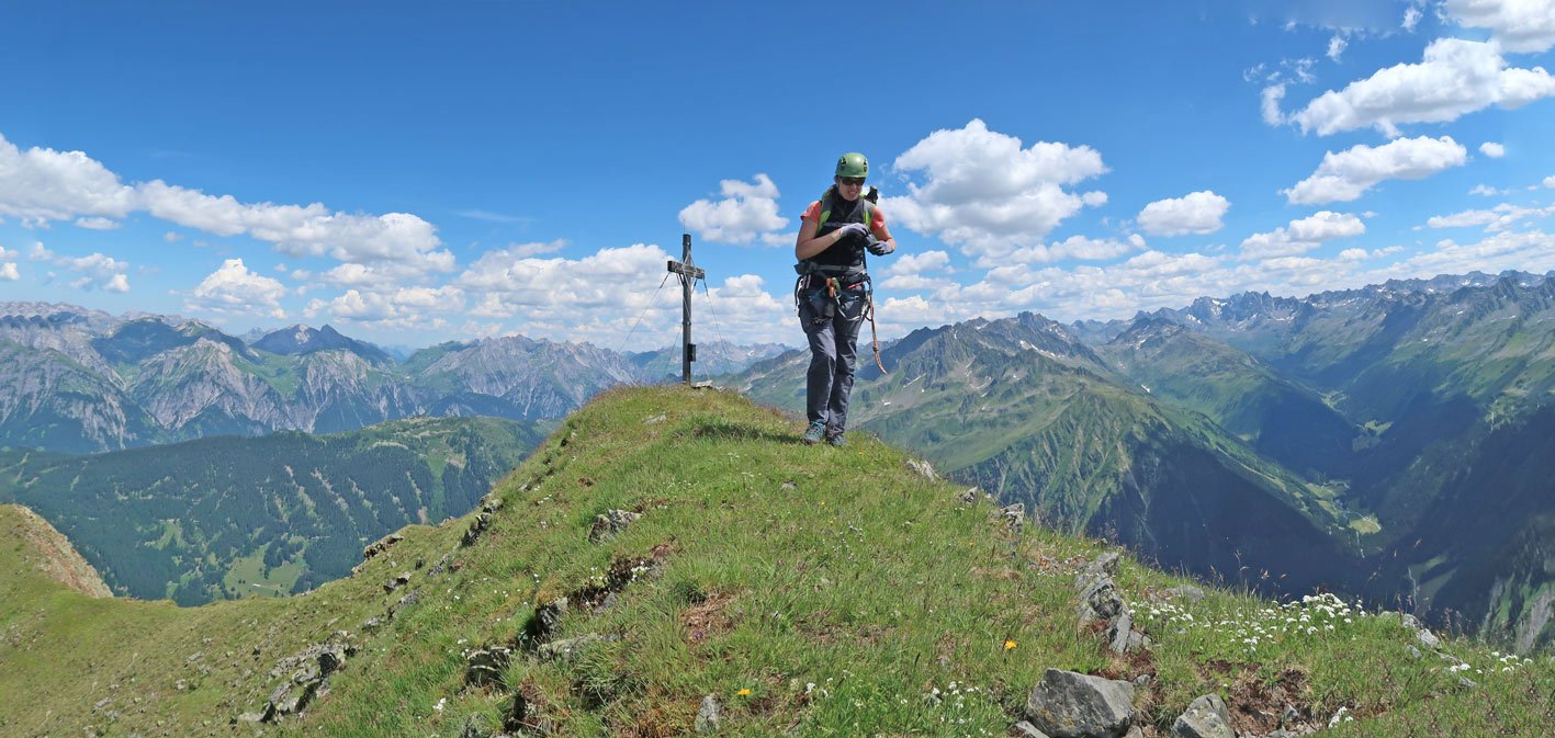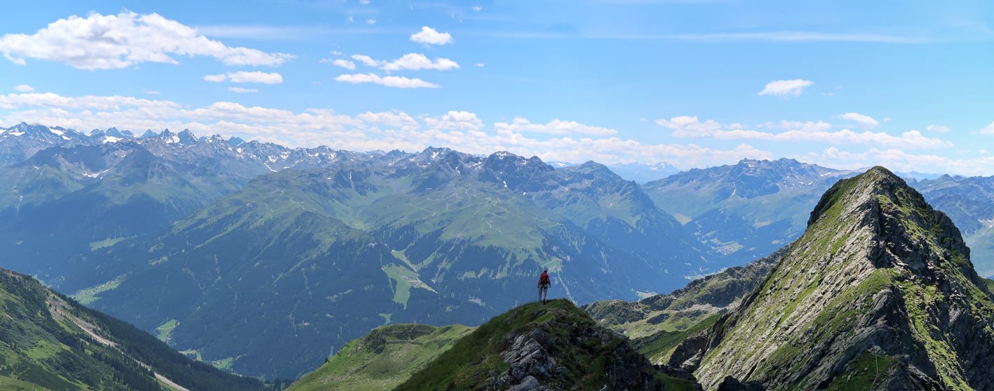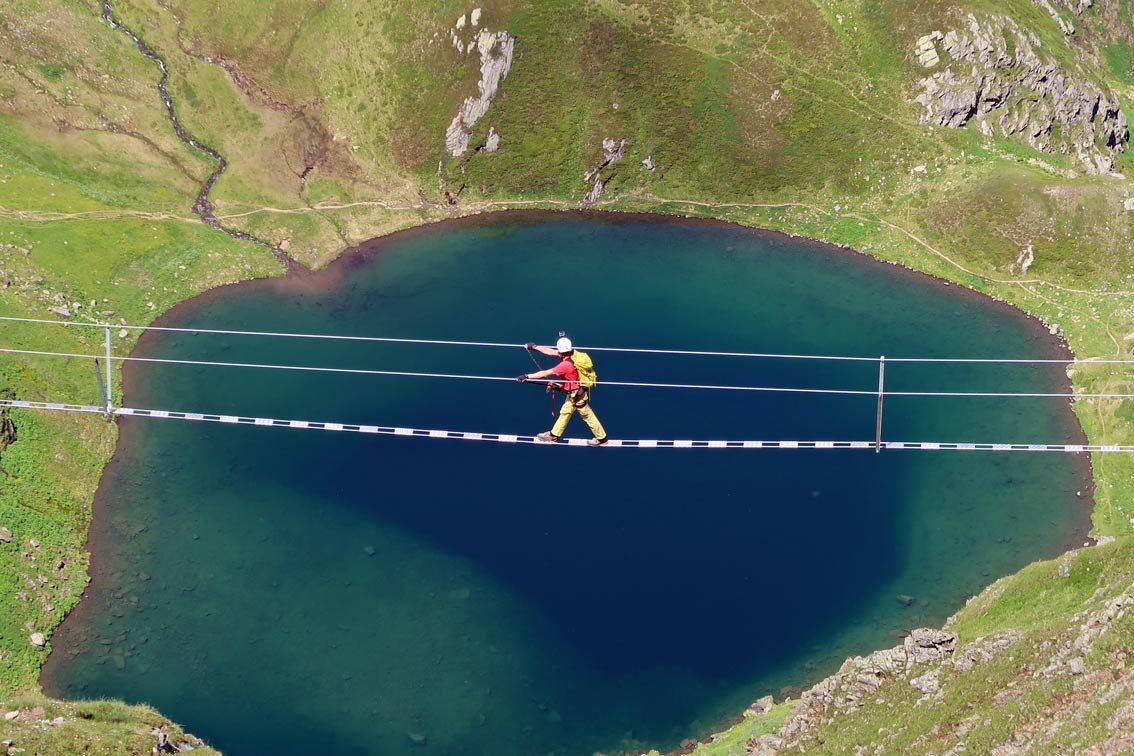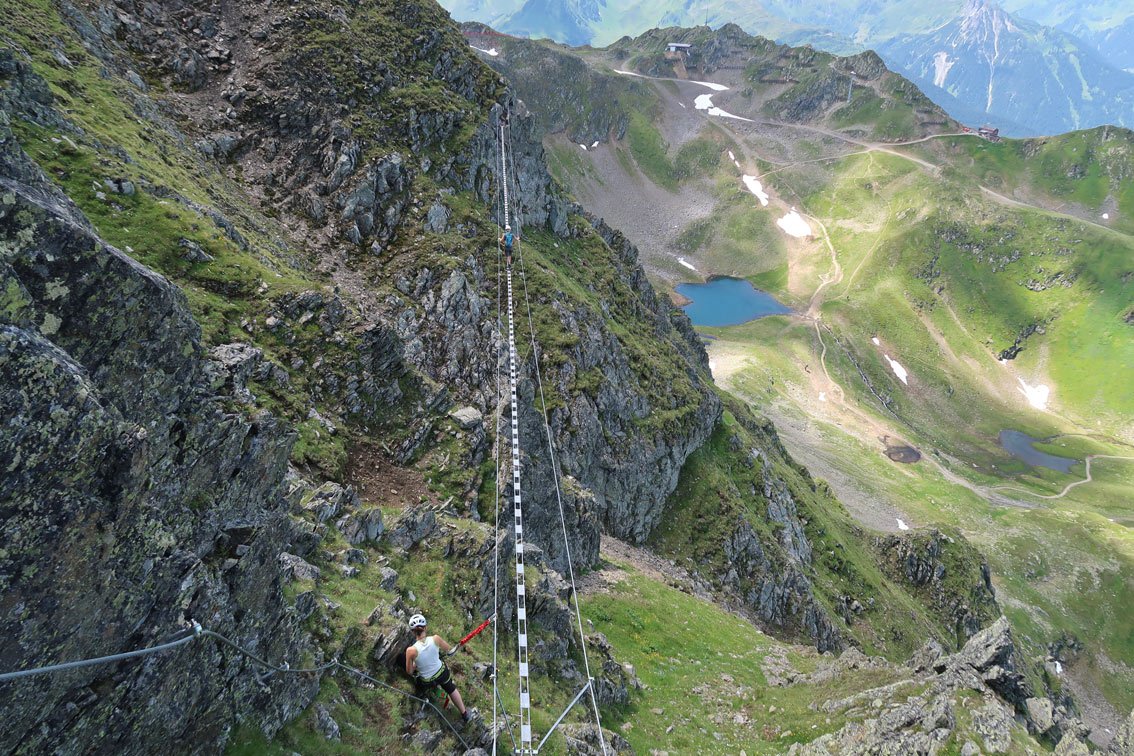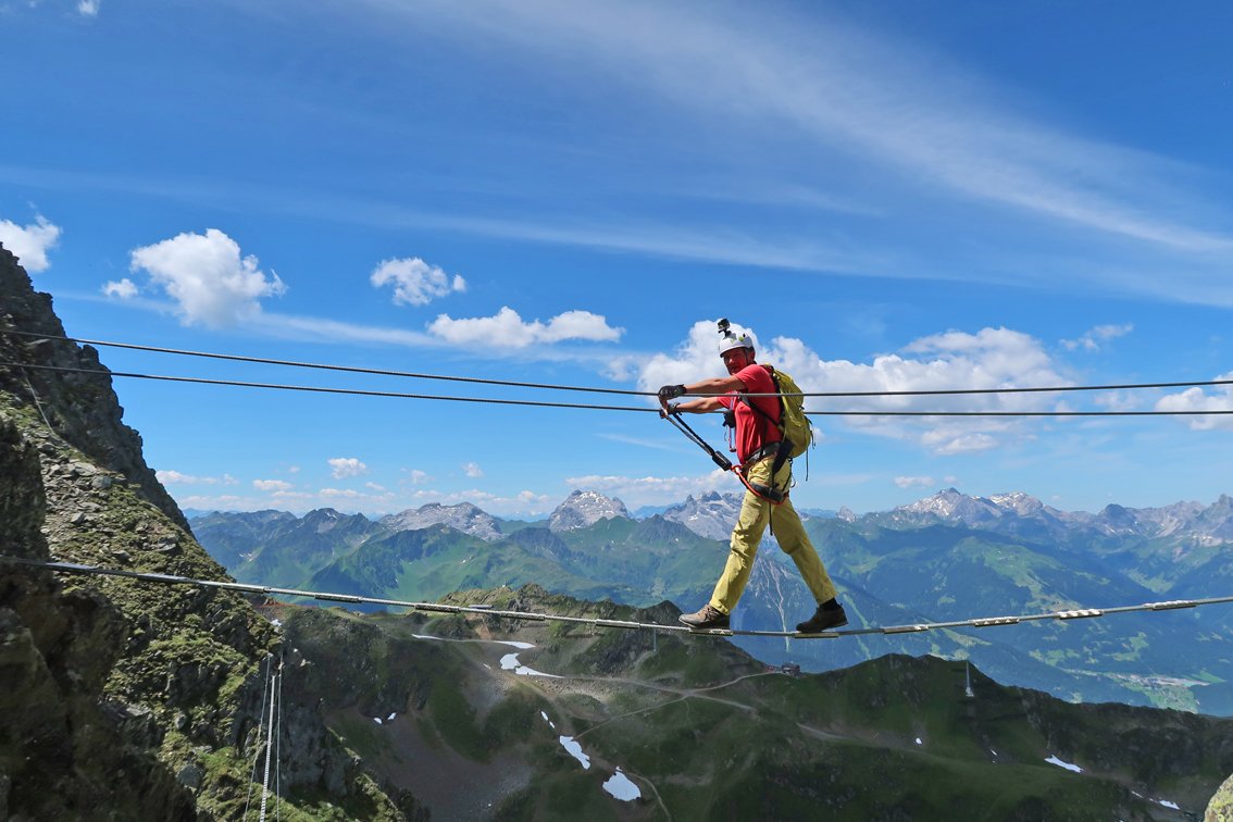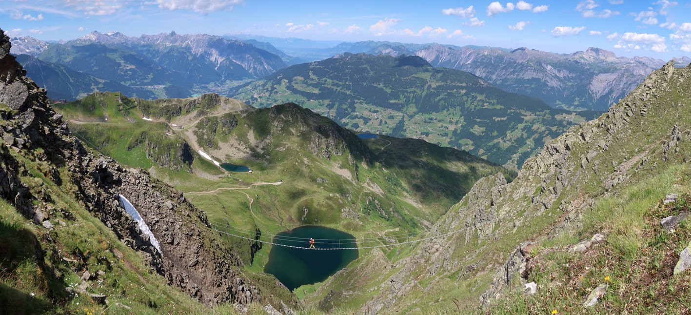 Eine gewaltige Seilhängebrücke mit Rätikon-Panorama - wo man das findet? Am Hochjoch oberhalb von Schruns ist ein konditionell fordernder Klettersteig angelegt worden, bei dem die Seilhängebrücke das „Grande Finale“ darstellt. Wer nicht so klettersteigversiert ist, kann den Hochjochgipfel auch über den zweiten Teil (Abstieg) des Klettersteiges erreichen und die 62 Meter lange Hängebrücke quasi als Gipfelrunde mit einbauen.