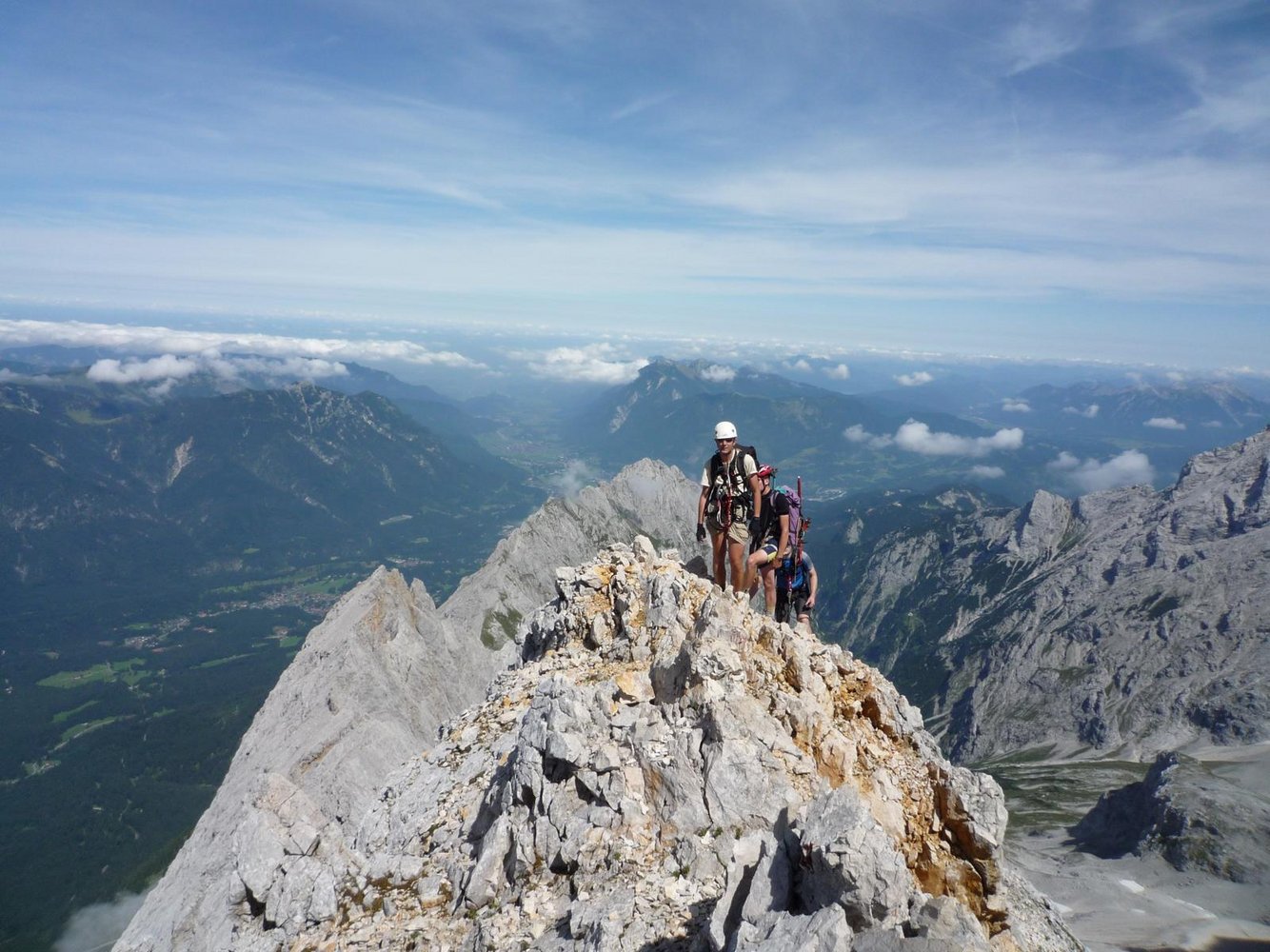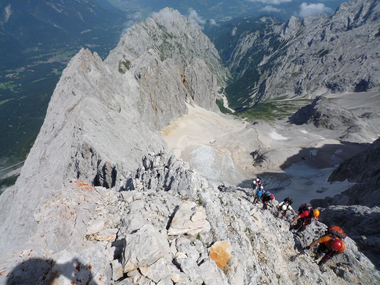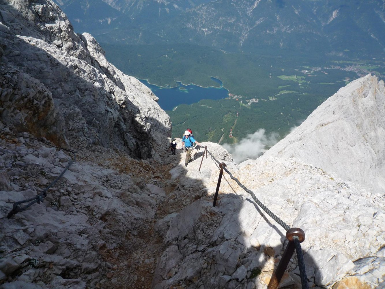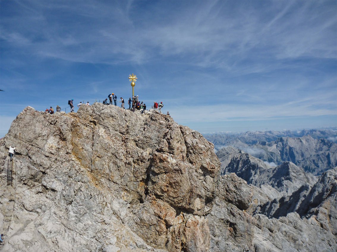 Der Klettersteig auf den höchsten Berg Deutschlands ist ein Abenteuer – und was für eines! Man taucht ein, in eine Mixtour aus landschaftlichem Hochgenuss beim Zustieg durch die „Wasserwelten“ der Höllentalklamm und vertikalem Drahtseilvergnügen, welches am sog. Brett seinen Anfang nimmt. Die Zugspitze hat wirklich alpines Flair zu bieten, das merkt man spätestens dann, wenn man an der Randspalte zum im Spätsommer recht weit entfernten Felsen hinüber muss. Dass man dem höchsten Punkt der Bundesrepublik recht nahe ist, spürt man dann an der recht mühsam laufenden „Pumpe“ auf den letzten Metern zum goldenen Gipfelkreuz. Schlussendlich bahnt man sich den Weg durch die an schönen Tagen erhebliche Touristenschar hinunter zur nahen Seilbahnstation, um dort an der höchsten Würstelbude Deutschlands den gewaltigen Tourentag mit Weißwurst und Bier würdevoll ausklingen zu lassen. Fazit: Imposante und sehr anspruchsvolle Klettersteigtour, die in keinem Tourenbuch fehlen darf.
