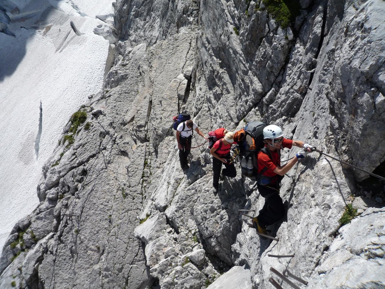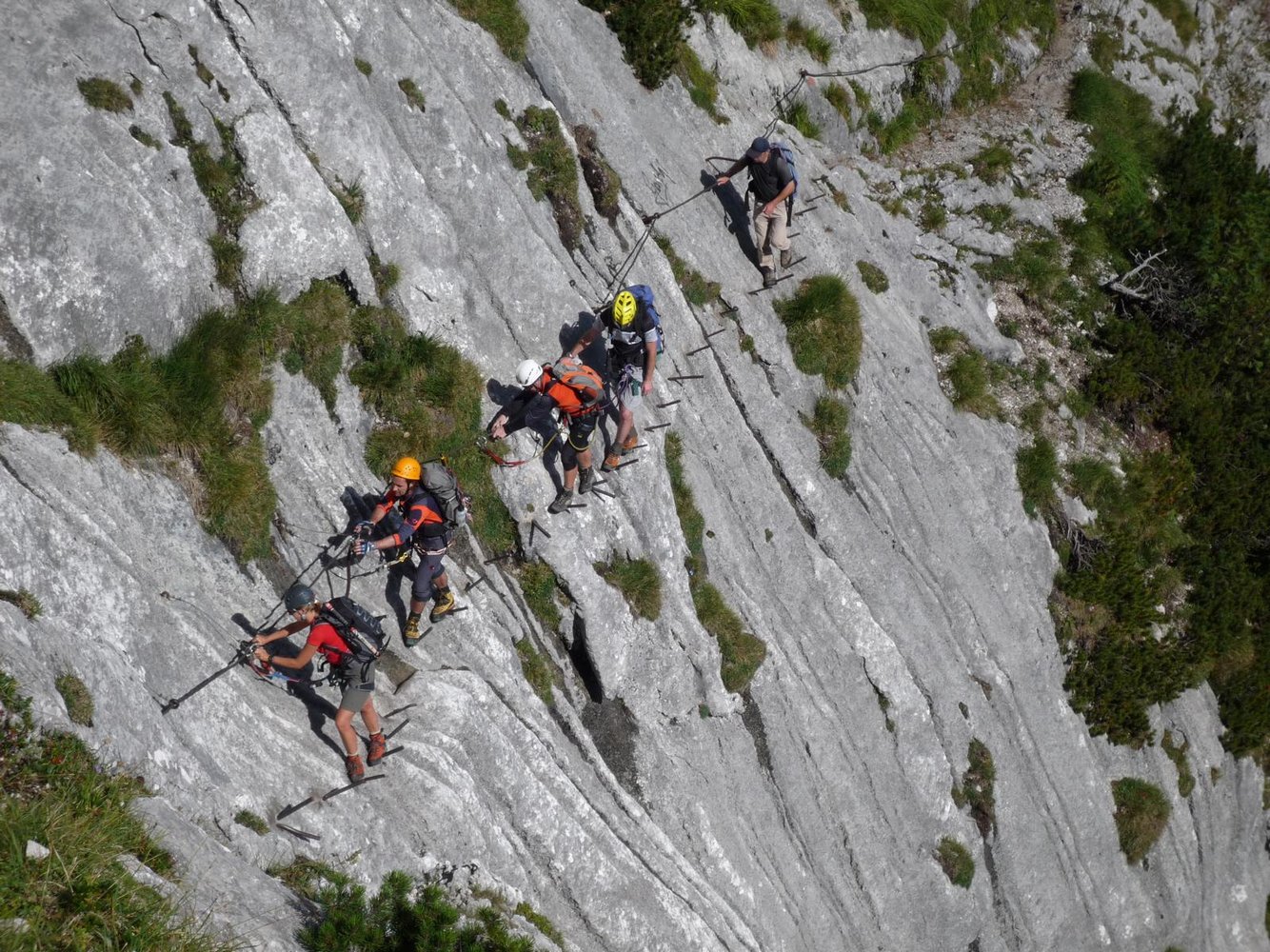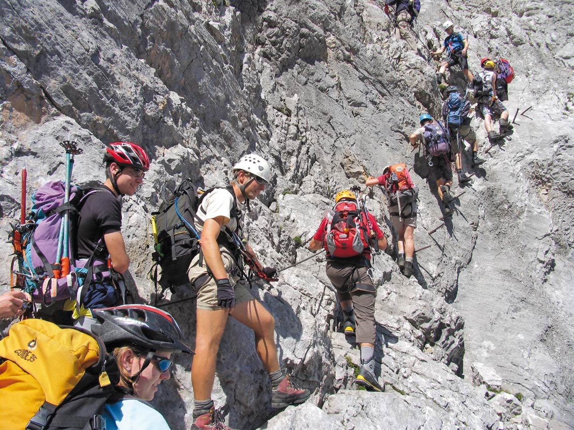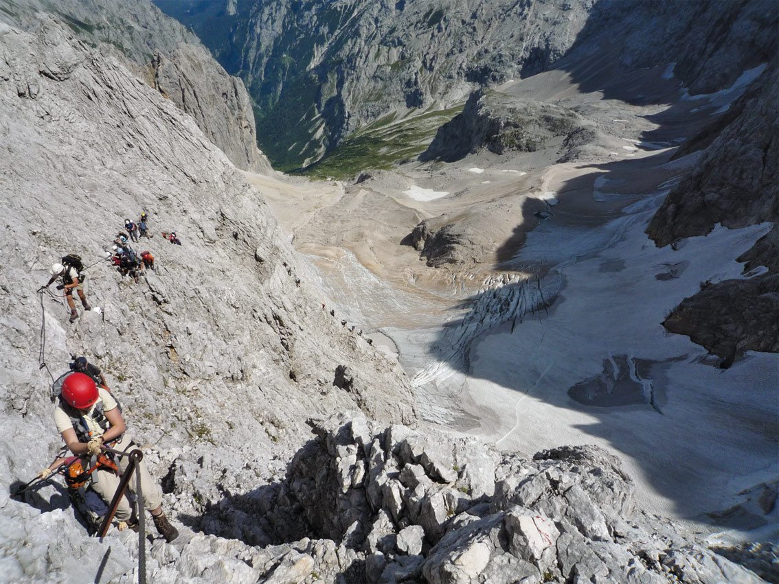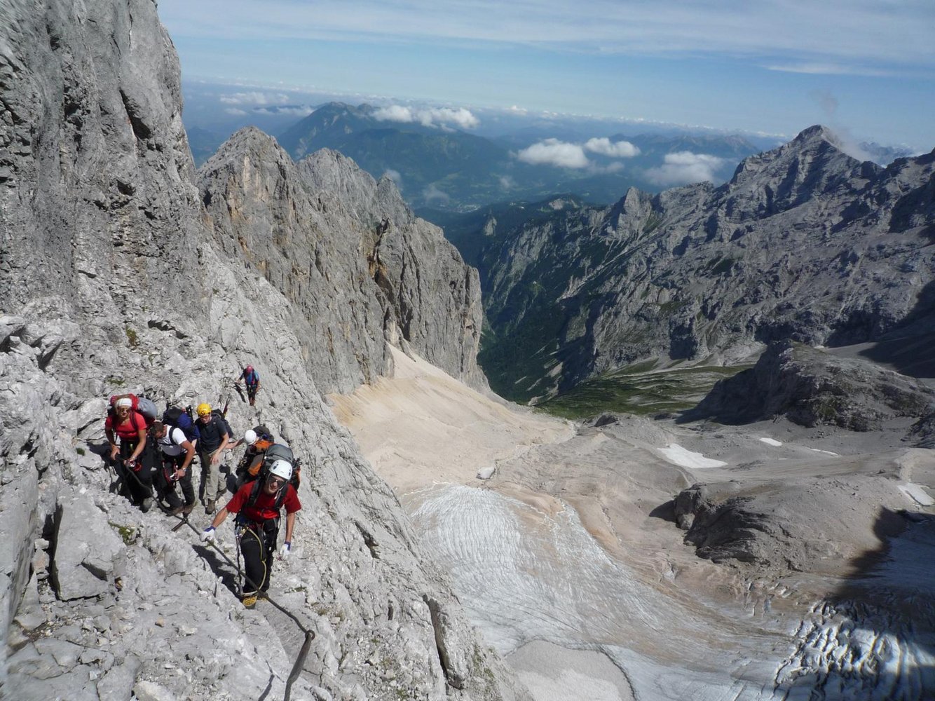 Der Klettersteig auf den höchsten Berg Deutschlands ist ein Abenteuer – und was für eines! Man taucht ein, in eine Mixtour aus landschaftlichem Hochgenuss beim Zustieg durch die „Wasserwelten“ der Höllentalklamm und vertikalem Drahtseilvergnügen, welches am sog. Brett seinen Anfang nimmt. Die Zugspitze hat wirklich alpines Flair zu bieten, das merkt man spätestens dann, wenn man an der Randspalte zum im Spätsommer recht weit entfernten Felsen hinüber muss. Dass man dem höchsten Punkt der Bundesrepublik recht nahe ist, spürt man dann an der recht mühsam laufenden „Pumpe“ auf den letzten Metern zum goldenen Gipfelkreuz. Schlussendlich bahnt man sich den Weg durch die an schönen Tagen erhebliche Touristenschar hinunter zur nahen Seilbahnstation, um dort an der höchsten Würstelbude Deutschlands den gewaltigen Tourentag mit Weißwurst und Bier würdevoll ausklingen zu lassen. Fazit: Imposante und sehr anspruchsvolle Klettersteigtour, die in keinem Tourenbuch fehlen darf.