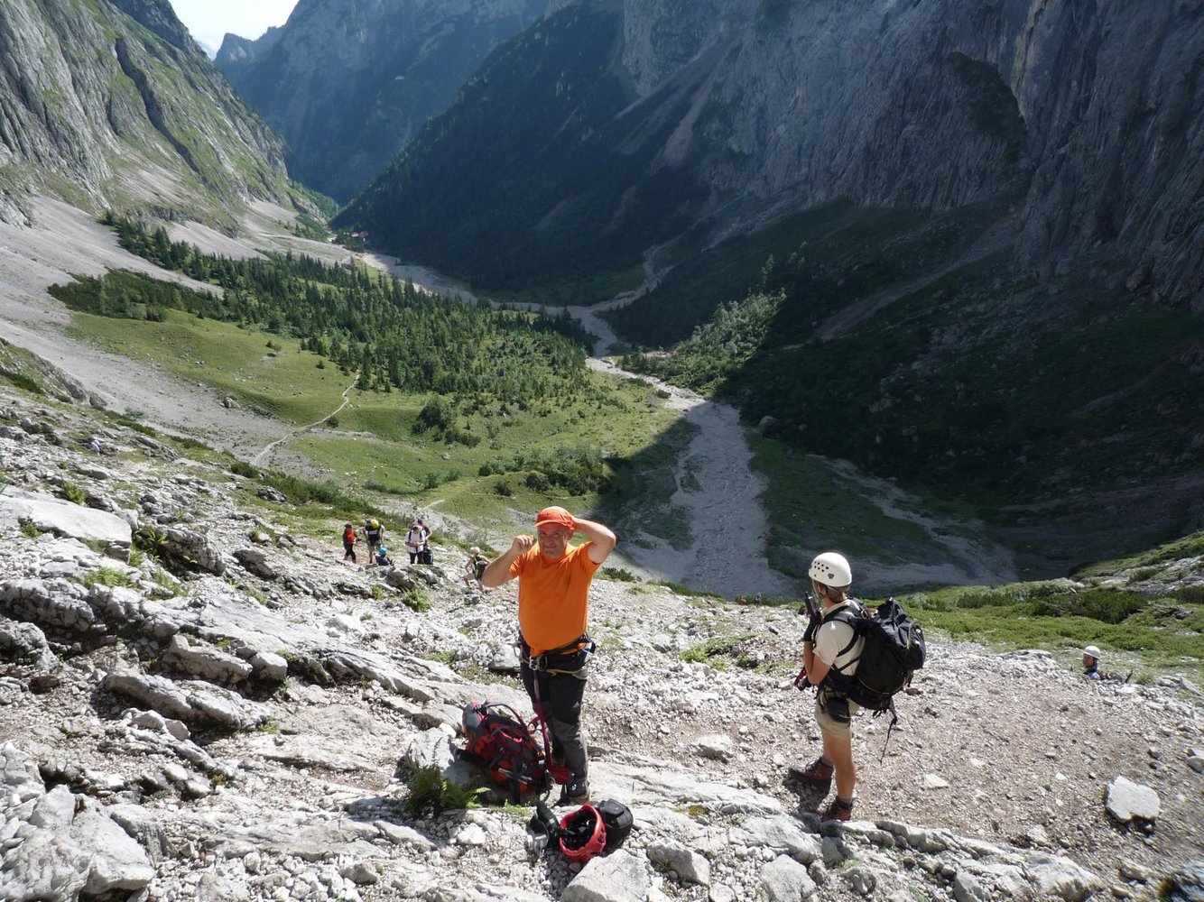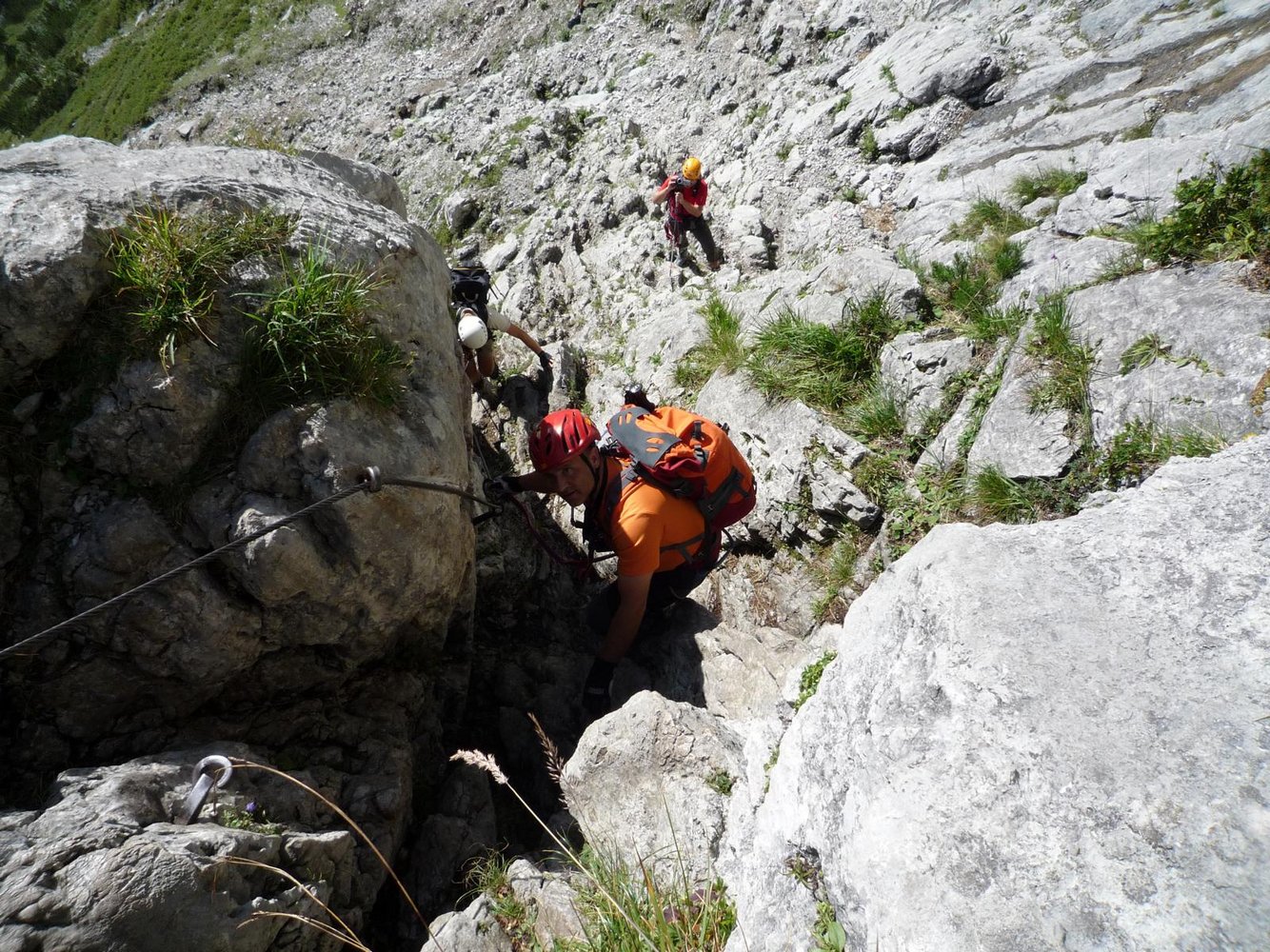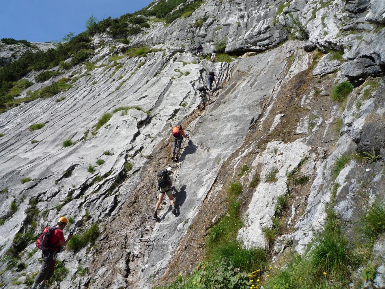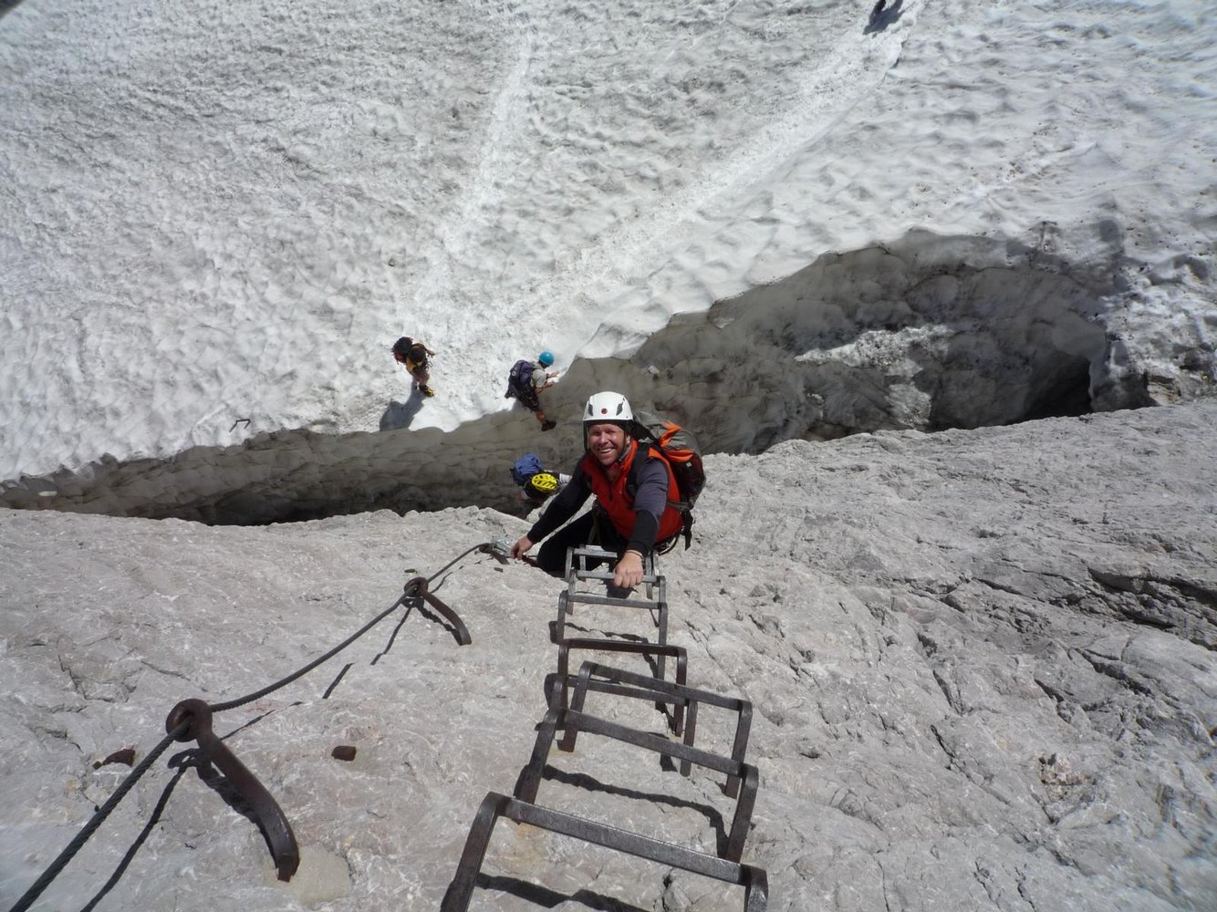 Der Klettersteig auf den höchsten Berg Deutschlands ist ein Abenteuer – und was für eines! Man taucht ein, in eine Mixtour aus landschaftlichem Hochgenuss beim Zustieg durch die „Wasserwelten“ der Höllentalklamm und vertikalem Drahtseilvergnügen, welches am sog. Brett seinen Anfang nimmt. Die Zugspitze hat wirklich alpines Flair zu bieten, das merkt man spätestens dann, wenn man an der Randspalte zum im Spätsommer recht weit entfernten Felsen hinüber muss. Dass man dem höchsten Punkt der Bundesrepublik recht nahe ist, spürt man dann an der recht mühsam laufenden „Pumpe“ auf den letzten Metern zum goldenen Gipfelkreuz. Schlussendlich bahnt man sich den Weg durch die an schönen Tagen erhebliche Touristenschar hinunter zur nahen Seilbahnstation, um dort an der höchsten Würstelbude Deutschlands den gewaltigen Tourentag mit Weißwurst und Bier würdevoll ausklingen zu lassen. Fazit: Imposante und sehr anspruchsvolle Klettersteigtour, die in keinem Tourenbuch fehlen darf.
