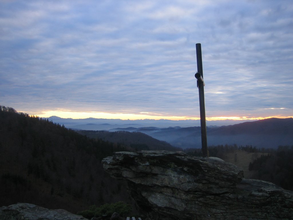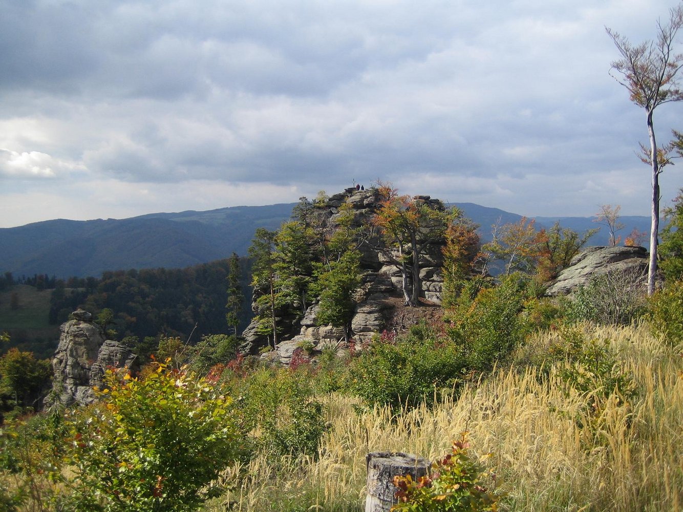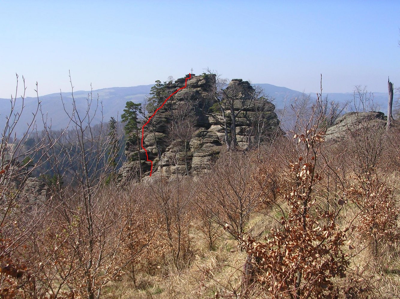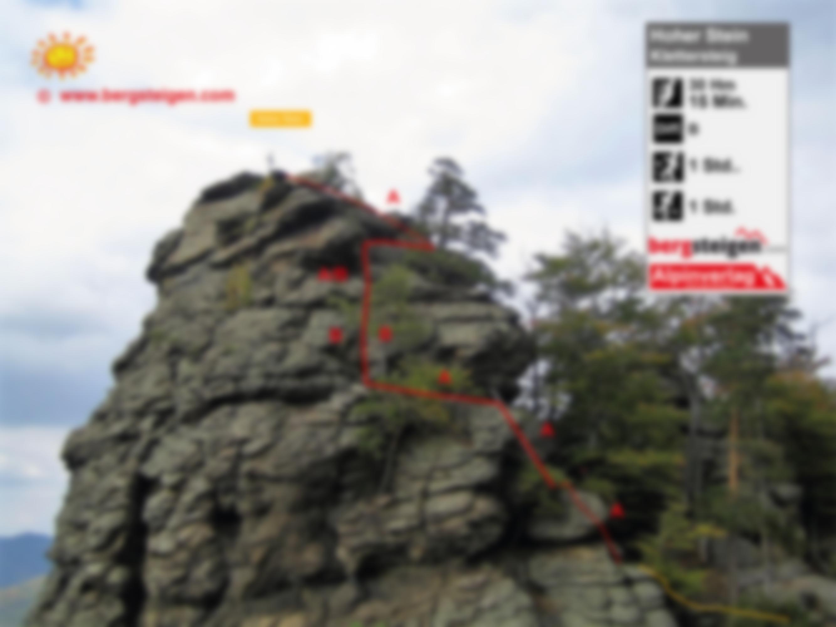 Zwischen zwei Felsaufbauten beginnt der Steig auf den Hohen Stein (Übersichtsfoto). Über zwei Aluleiter gelangt man zu einem kleinen Absatz. Durch eine seilversicherte steile Rinne kommt man zum Steigbuch und in Kürze zum Gipfelkreuz, von wo man eine schöne Aussicht genießen kann.