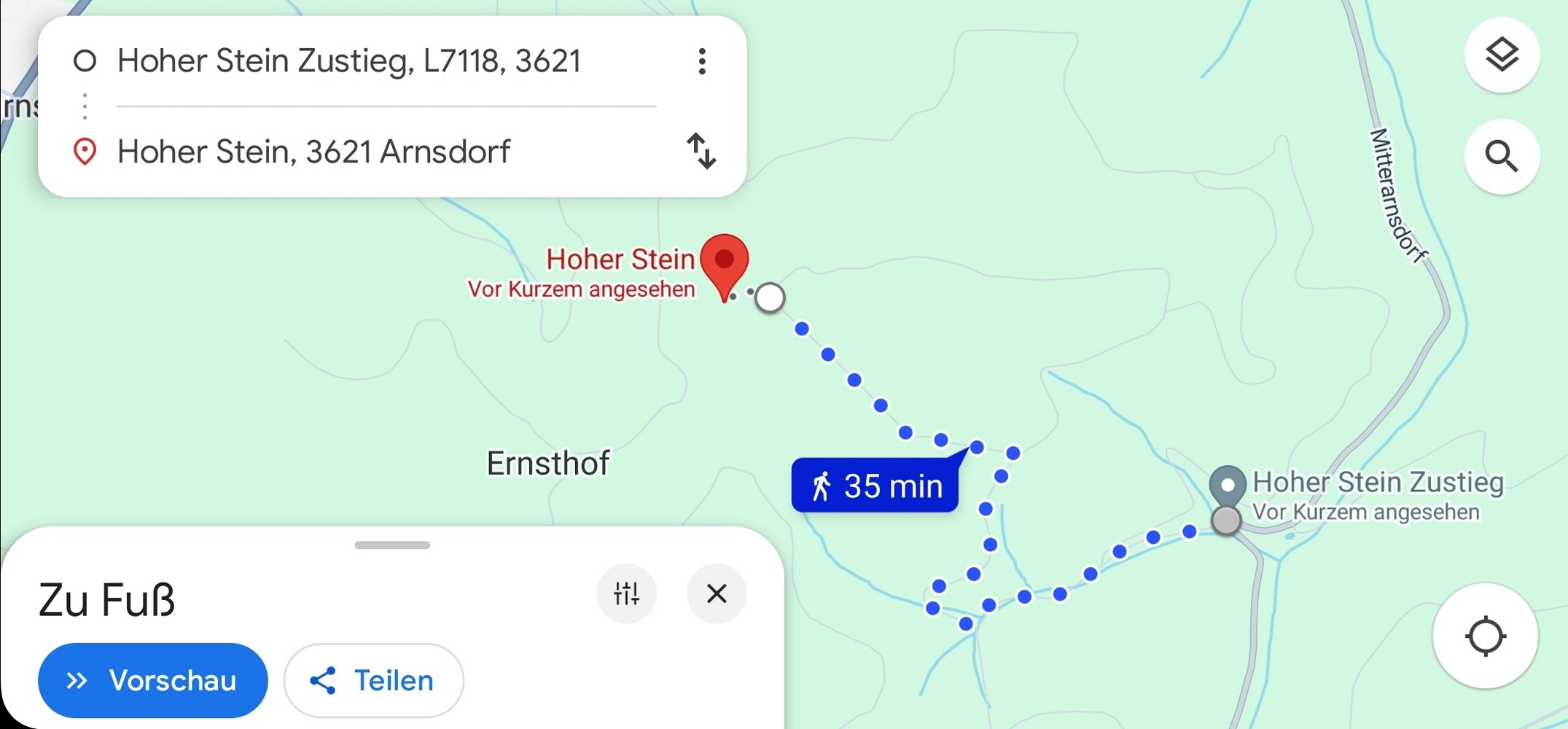 Bei der Brücke zweigt eine Forststraße nach Südwesten, Fahrverbotsschild und ÖBf ab. Dieser Forststraße zu Fuß 150 m zu einer Schranke folgen. Danach zur Forststraße rechts vom Graben wechseln, und dieser links weiter im Graben aufwärts nur auf der anderen Bachseite ca. 120 Meter folgen, dann geht rechts ein Weg (vereinzelt später Steinmänner) ab und führt wieder zu einer Straße. Nun den gelben Wanderschildern zum Hohen Stein folgen.