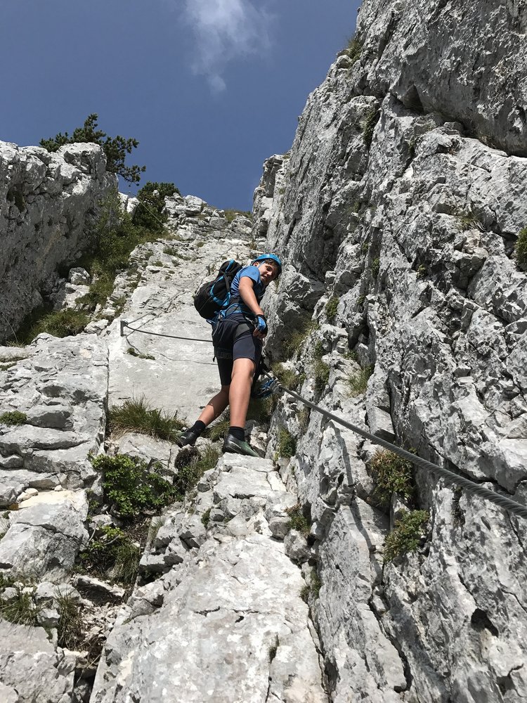 Sehr gut mit Stahlseil abgesichert, einige Trittstift.