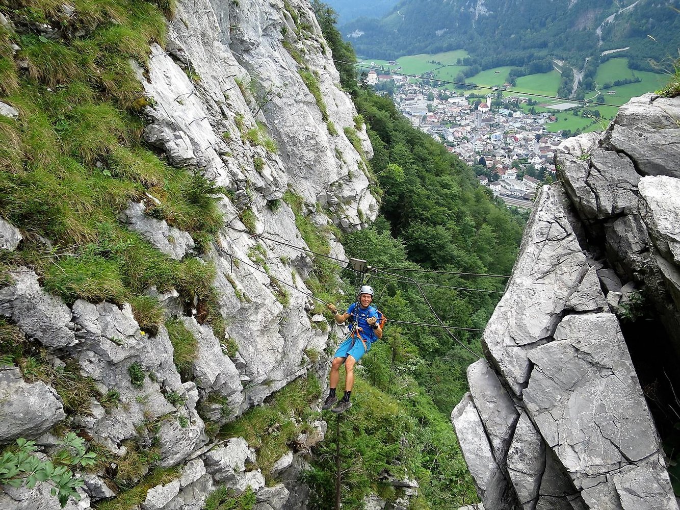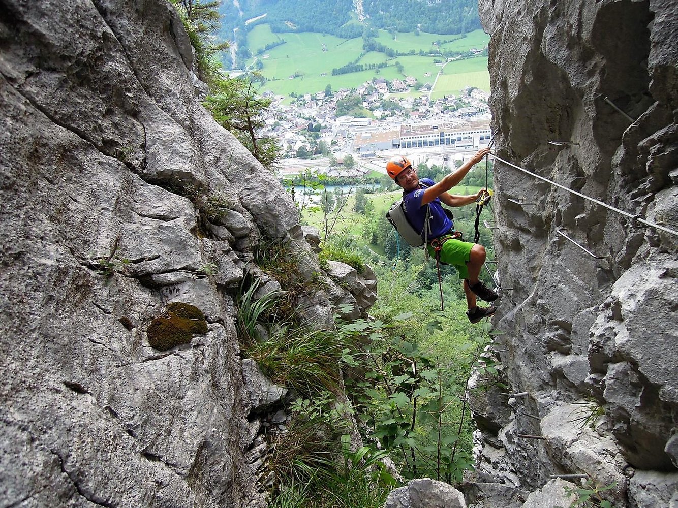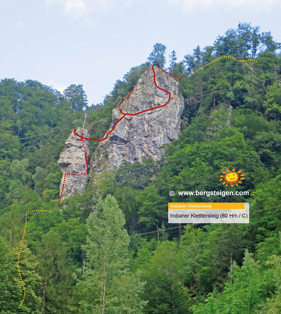Klein, aber fein, so könnte man den rd. 200 Meter langen Indianer Klettersteig über Netstal im Kanton Glarus zusammenfassen. Ein kurzer aber extrem abwechslungsreicher Steig mit Felsspalt, Turmfahne, Tyrolienne (mit Seilrolle) und einer steilen Schlusswand. Da passen die etwas eigenwilligen Versicherungen der Marke-Eigenbau perfekt dazu. Die Talnähe und der kurze Zu- und Abstieg machen diesen Klettersteig zu einer perfekten Tour für unsicheres Wetter oder als Nachmittagspaziergang.