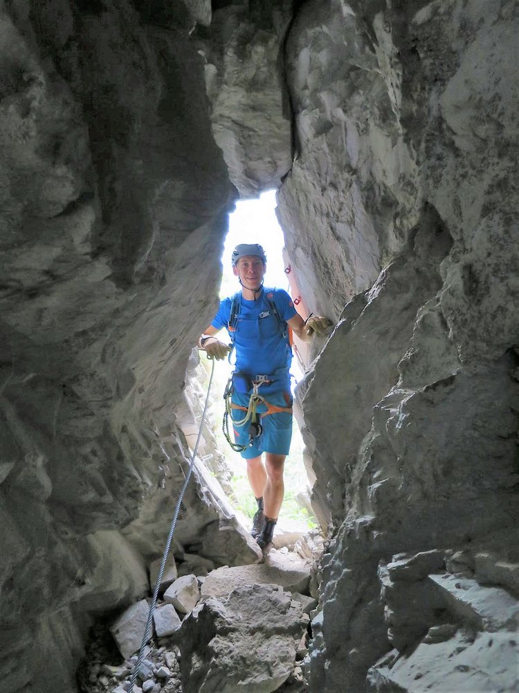 Siehe Topo! Im Mai 2024 wurde der erste Teil (bis zur Höhle) weiter nach rechts verlegt. Der Einstieg ist aber leicht zu finden. Auch der Ausstieg wurde angepasst und etwas verlängert. Dort führt die Route am Spreizschritt nach rechts an der Felswand entlang und durch ein Felsloch (am besten Rückwärts durch - mit Rucksack wird es eng) bis zum Ende der Route. Der Pfad zurück zum Wanderweg ist markiert.