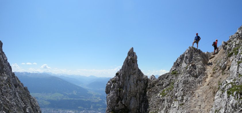 In zwei Teilen führt der Innsbrucker Klettersteig vom Hafelekar über den "Langen Sattel" zum Frau-Hitt-Sattel - wobei zahlreiche Gipfel bestiegen werden. Vor allem landschaftlich hat dieser Klettersteig viel zu bieten - neben grandiosen Blicken auf das fast 2000 Meter tiefer gelegene Innsbruck, kann man auch einen unglaublichen Fernblick auf die vergletscherten Berge des Alpenhauptkammes genießen. Klettertechnisch wartet dieser Klettersteig mit anspruchsvollen und originellen Passagen (Hängebrücke) auf. Abwechslung in der Routenführung ist garantiert, da der erste Teil hauptsächlich auf einem Grat entlang verläuft, der zweite Teil hingegen durch ein Labyrinth von Felstürmen, Scharten und sehr steilen Wandpassagen führt. Der Klettersteig ist ein Klassiker, den man gemacht haben sollte!