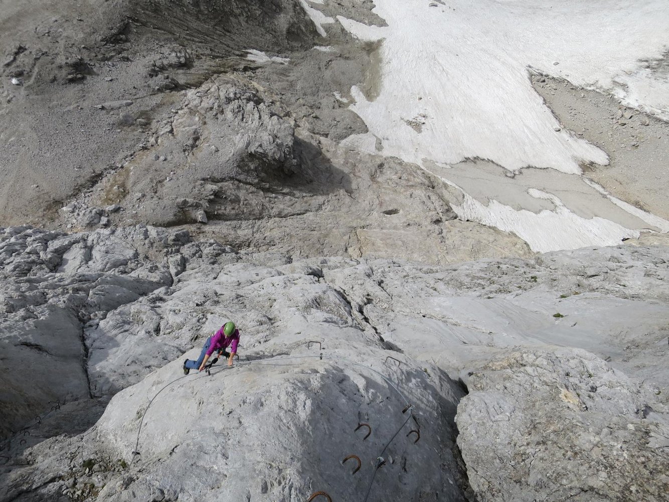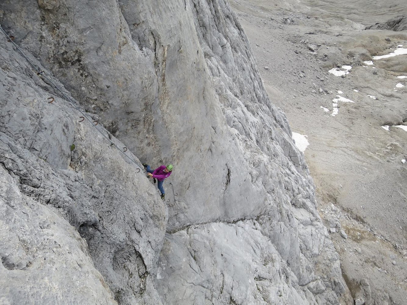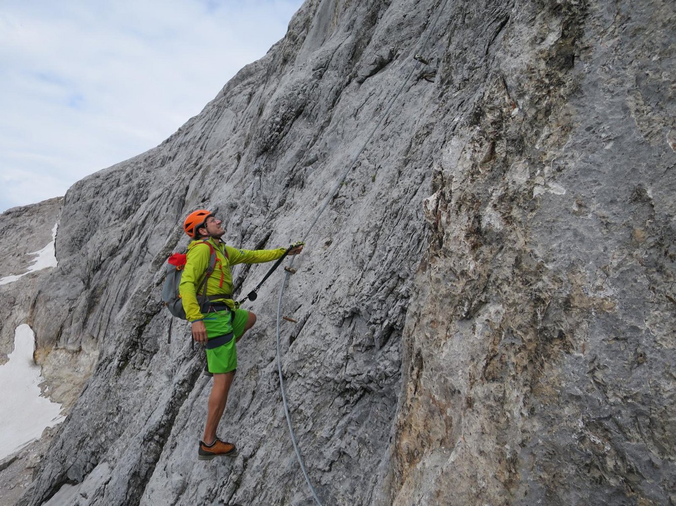 Das Ergebnis, ein klassischer Steig ohne wirkliche Höhepunkte, der gemeinsam mit dem ebenfalls gerinfügig verlegten Westgrat Klettersteig aber eine gute Klettersteigrunde bildet. Vom Gipfel des Koppenkarstein hat man einen perfekten Blick auf das touristische Treiben am Dachsteingletscher und bald merkt man, dass man als Klettersteiggeher längst selbst Teil davon geworden ist.