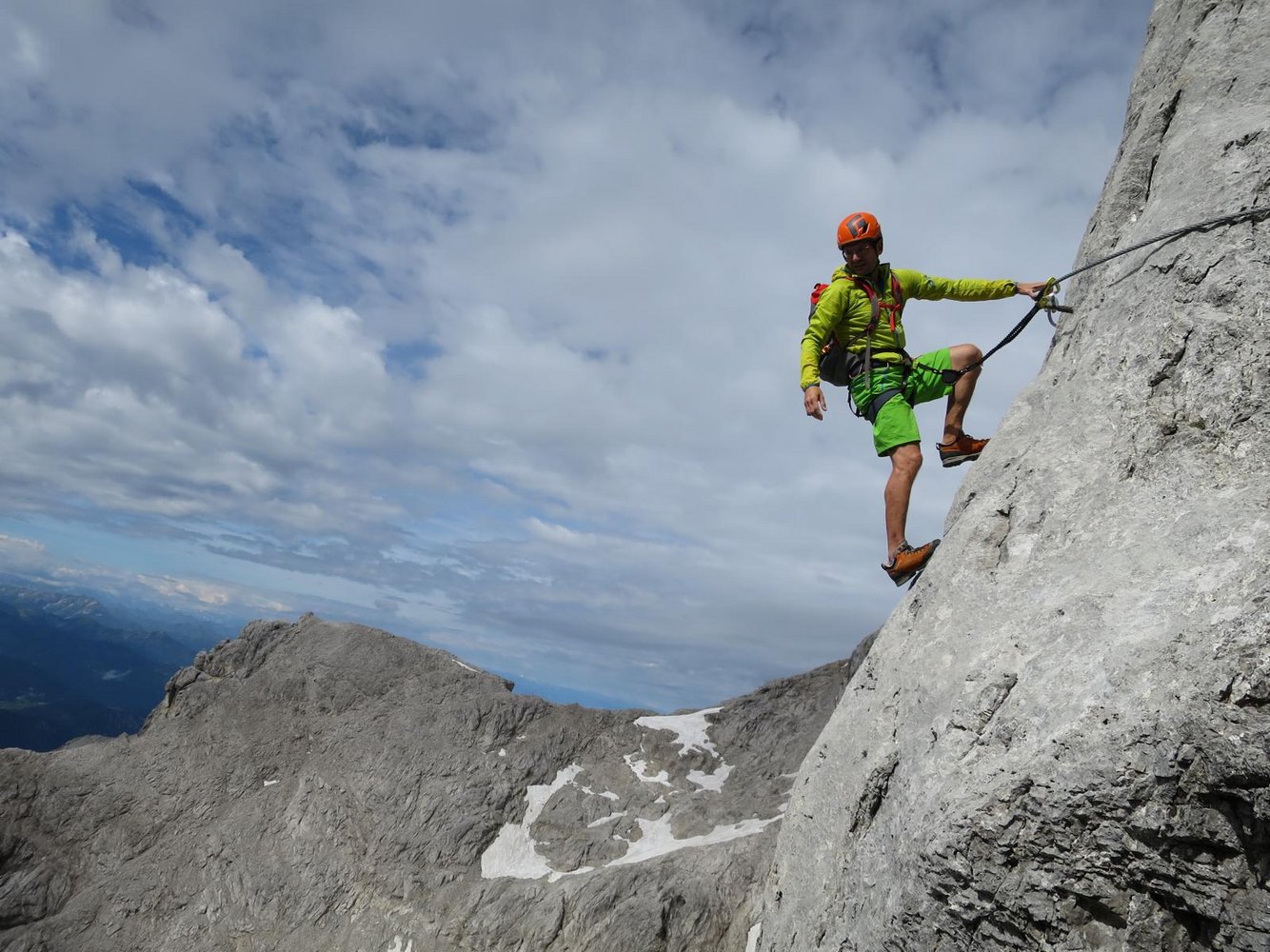 Kompl. Klettersteigausrüstung mit Handschuhen und Helm. Für schwächere Geher kurzes Sicherungsseil. Im Frühjahr evtl. Steigeisen für den Zustieg nötig!