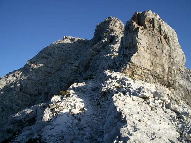 Über Bänder, Schrofen und kleine Wandstufen (A und 1) in ein Geröllfeld. Nach dem Geröll steil hinauf (bis B und 1) zu einem Band (A). Anschließend durch eine breite steile Rinne (A/B bis B, 1-) zum Gugelgrat. Kurz dem Grat folgen und in die linke Flanke. Auf ausgesetzten Bändern (A bis A/B) und später im Geröll (A bis A/B) zum Gipfel.