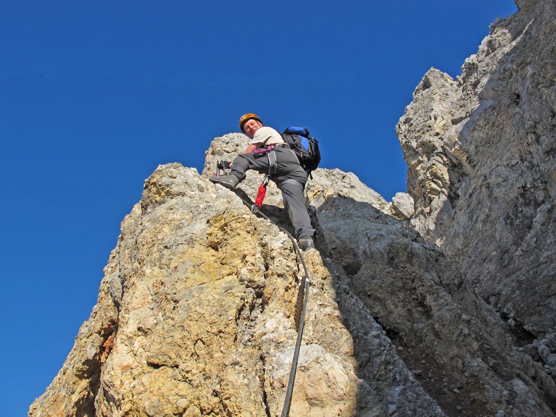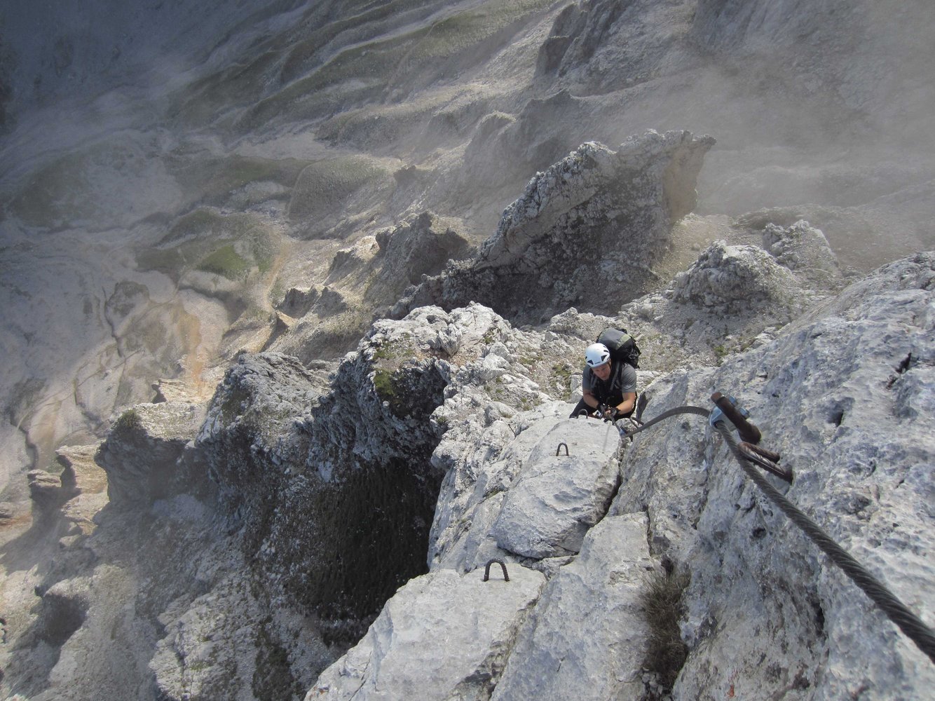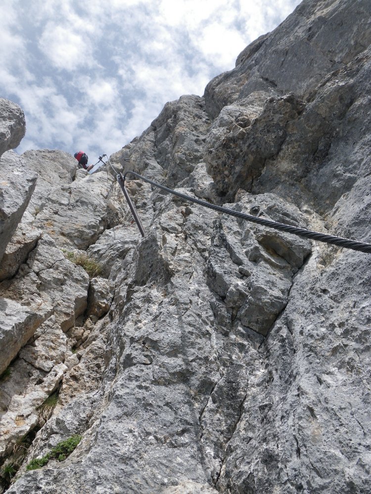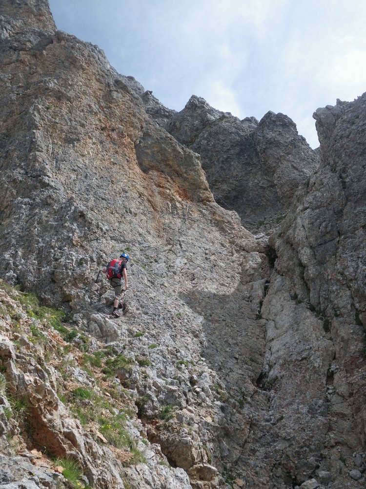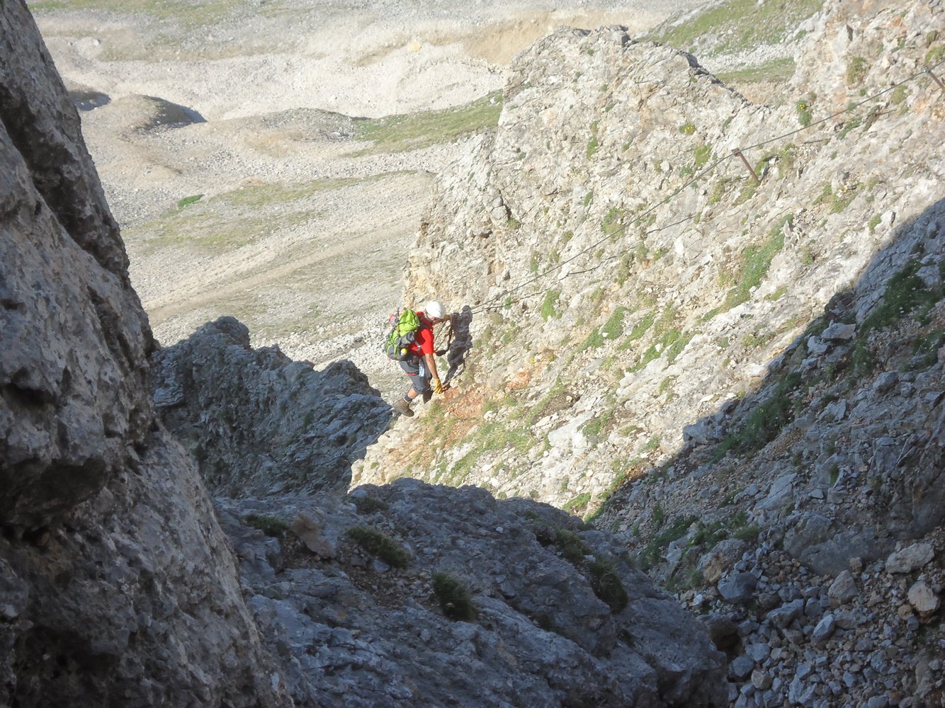 Kurzer, aber anstrengender Klettersteig, sehr ausgesetzte Passagen nahe der Vertikale, gesamt schwierig (C), eine Stelle sehr schwierig (D). Kinder und Anfänger sollten an ein Sicherungsseil genommen werden.