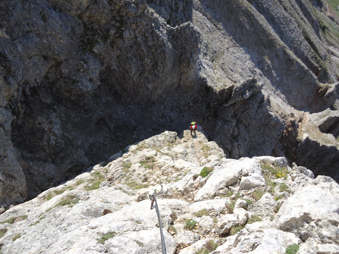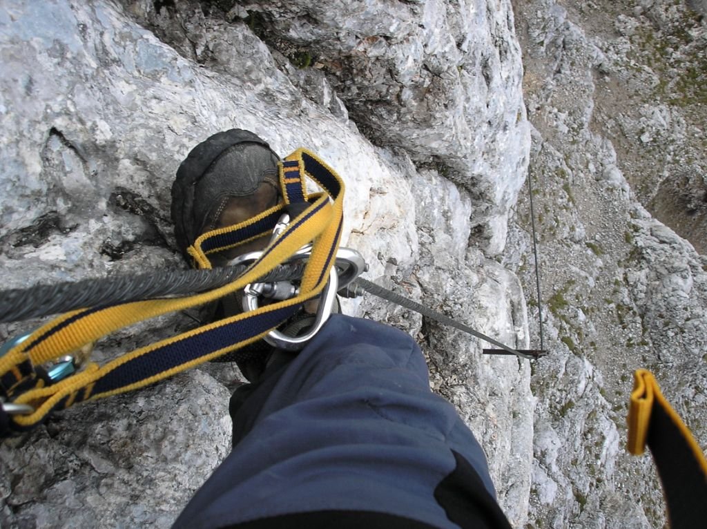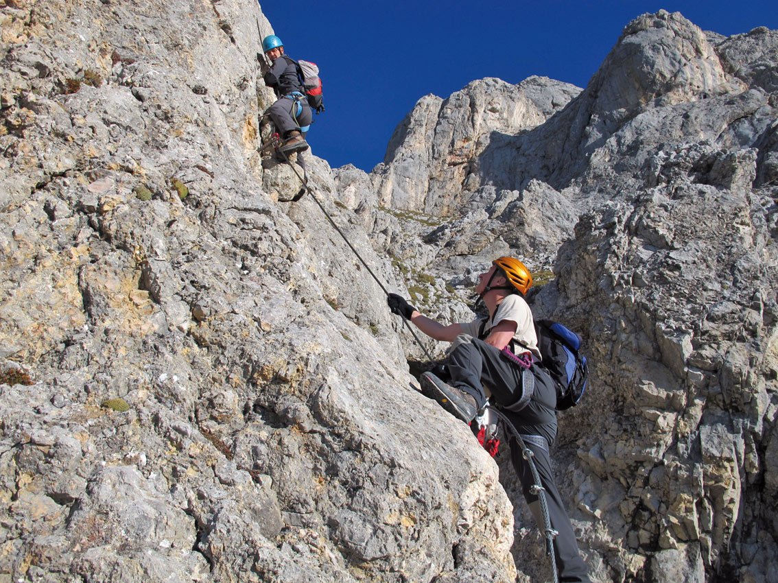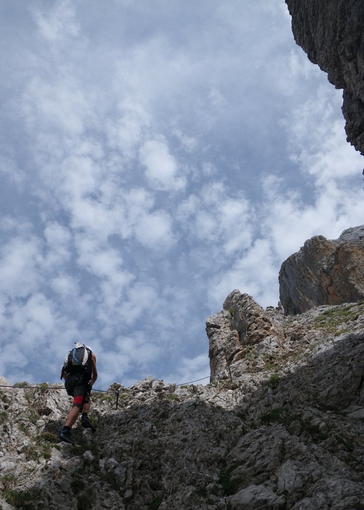Kurzer, aber anstrengender Klettersteig, sehr ausgesetzte Passagen nahe der Vertikale, gesamt schwierig (C), eine Stelle sehr schwierig (D). Kinder und Anfänger sollten an ein Sicherungsseil genommen werden.