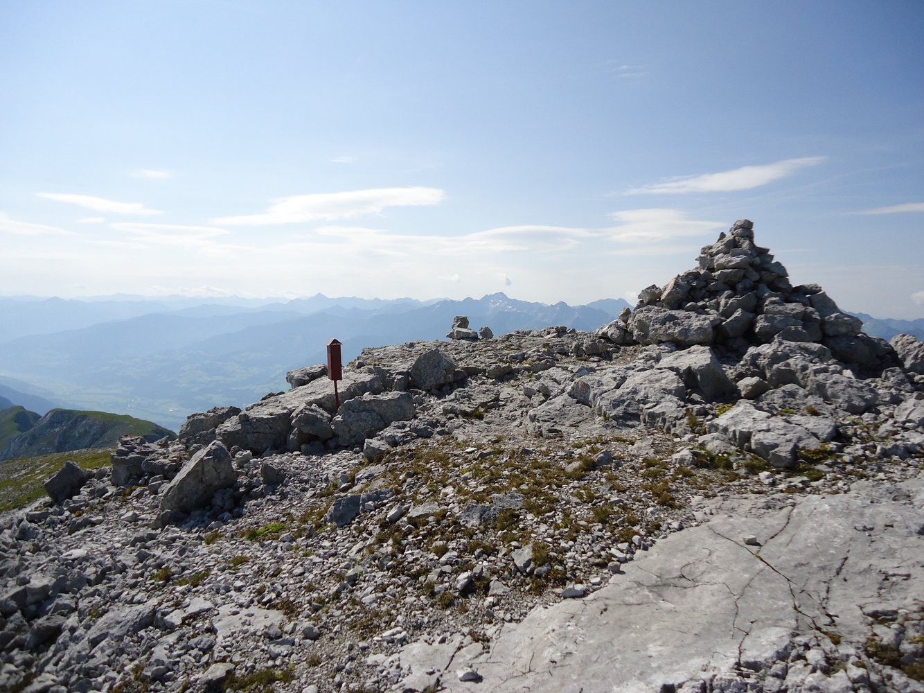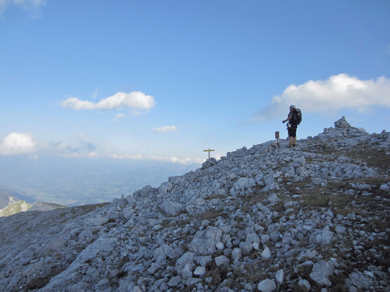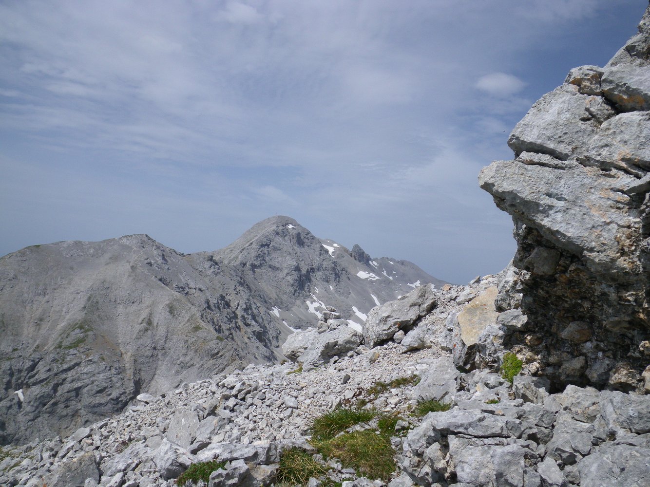 Links einer steinschlag gefährdeten Rinne hinauf (B), brüchige Querung nach rechts und über den ersten Grataufschwung(C/D) empor. Es kommt ein falches Gratstück, ein kurzer steiler Aufschwung (D) und ein kurzer Grat zu einen großen Turmaufbau. Über Platten linkshaltend (C/D) in die markante, steile Kaminverschn. (C) und zuletzt sehr ausgesetzt (D) auf den Turmgipfel. Über den flachen Grat (A) und den letzten steilen Aufschwung (C/D) zum Ausstieg. Linkshaltend über Steigspuren zum Westrücken und in Kürze auf den Gipfel