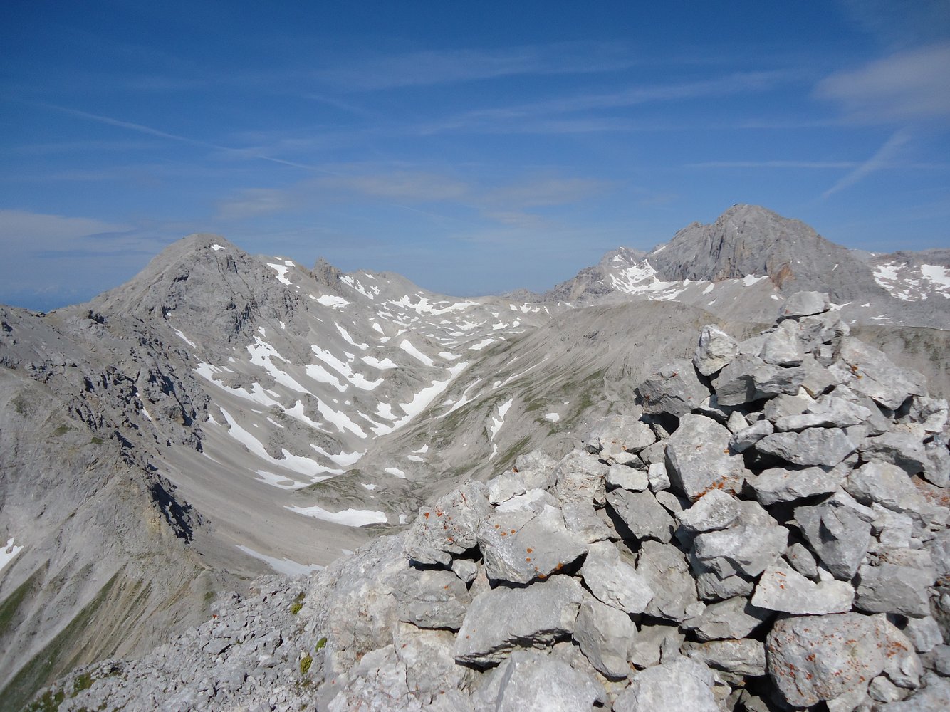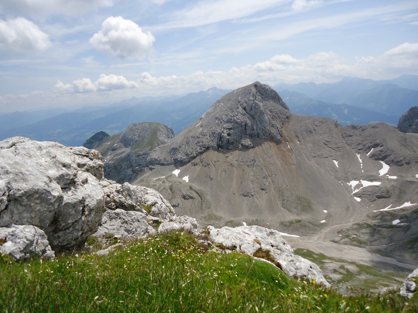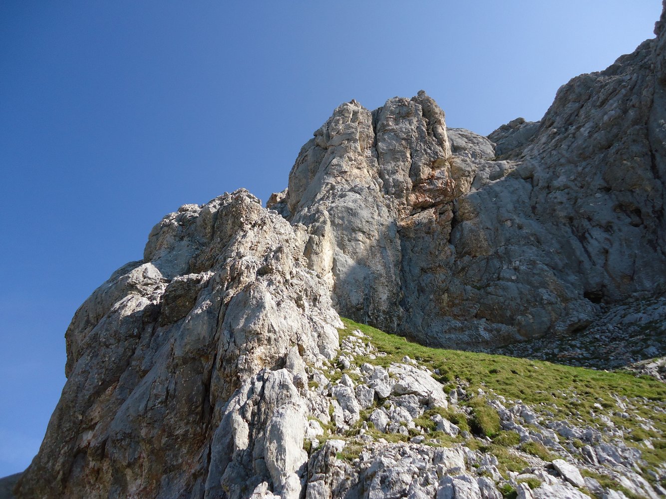 Links einer steinschlag gefährdeten Rinne hinauf (B), brüchige Querung nach rechts und über den ersten Grataufschwung(C/D) empor. Es kommt ein falches Gratstück, ein kurzer steiler Aufschwung (D) und ein kurzer Grat zu einen großen Turmaufbau. Über Platten linkshaltend (C/D) in die markante, steile Kaminverschn. (C) und zuletzt sehr ausgesetzt (D) auf den Turmgipfel. Über den flachen Grat (A) und den letzten steilen Aufschwung (C/D) zum Ausstieg. Linkshaltend über Steigspuren zum Westrücken und in Kürze auf den Gipfel