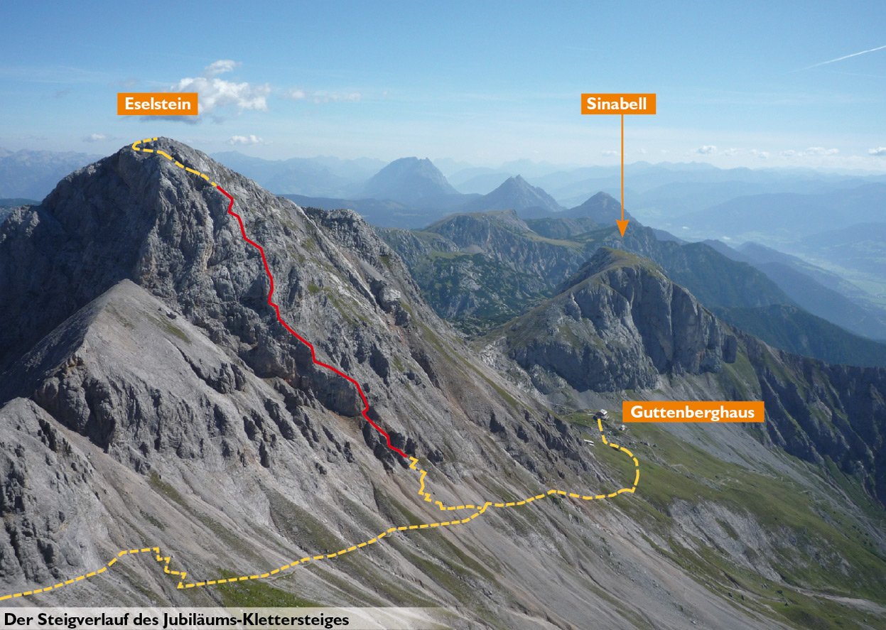 Dieser schöne Klettersteig im Nahbereich des Guttenberghauses stellt die perfekte Besteigungsmöglichkeit des Eselsteines dar. Der Klettersteig ist durchaus als anspruchsvoll zu bezeichnen, da das Drahtseil nicht durchgehend gespannt ist. Der kurze Zustieg von der Hütte und der problemlose Abstieg über die Ostflanke zeichnen diese Steiganlage aus.