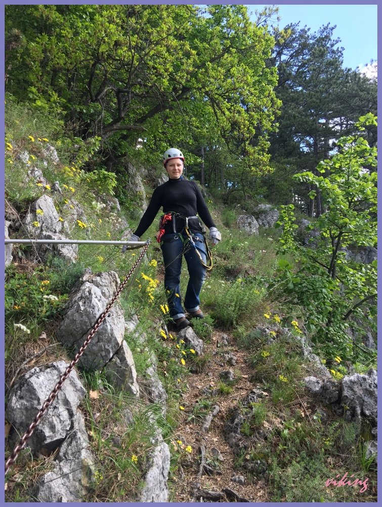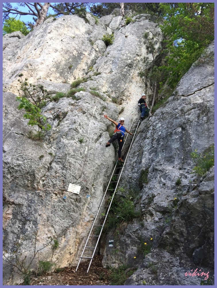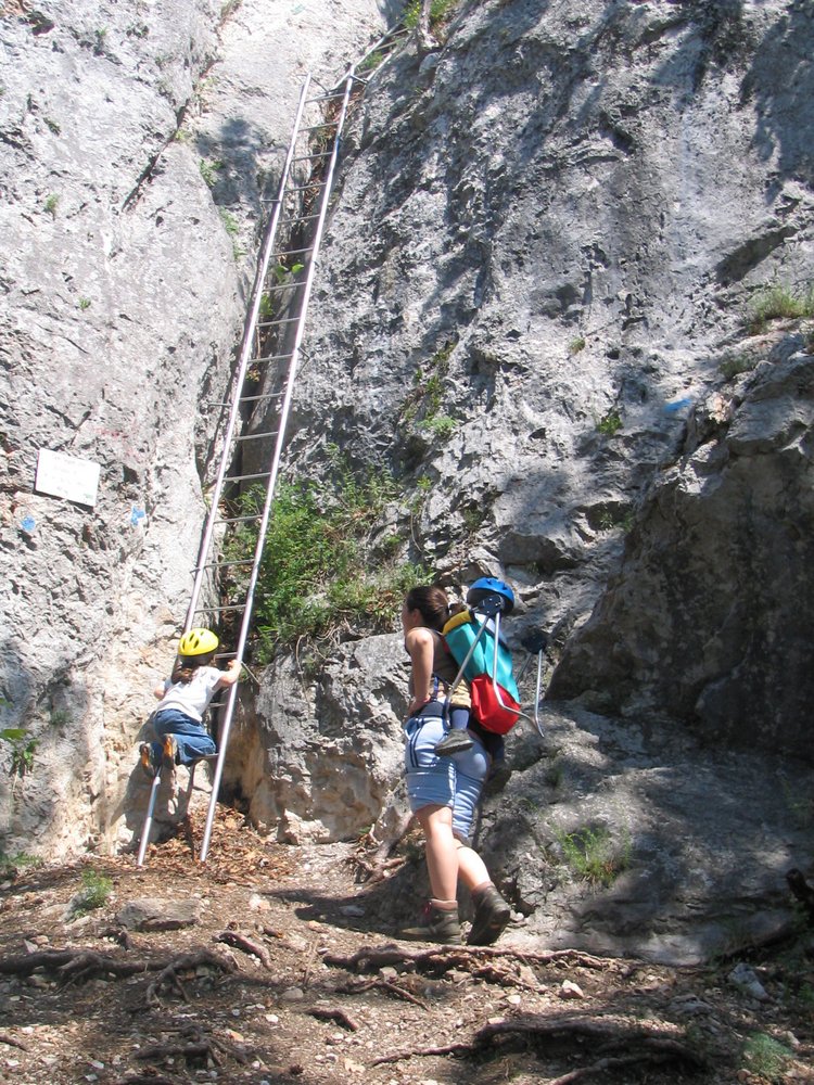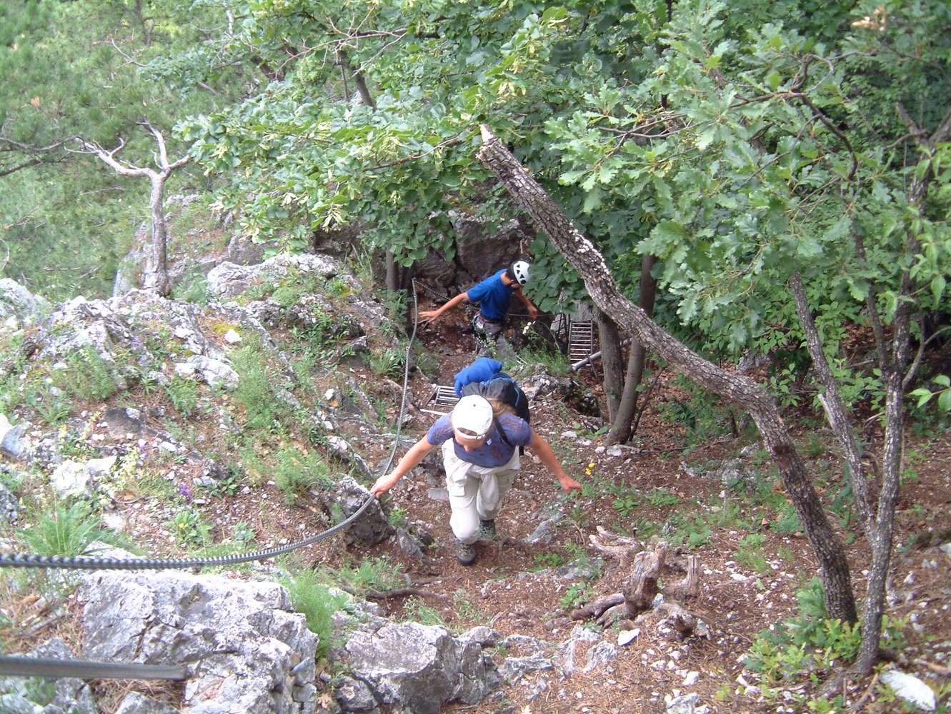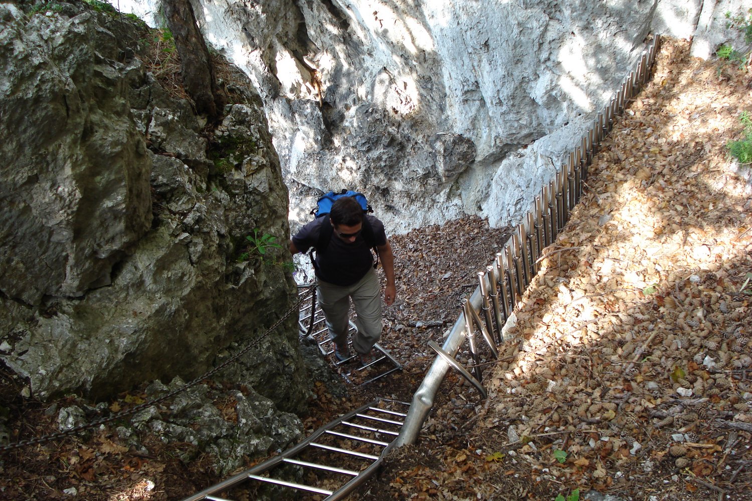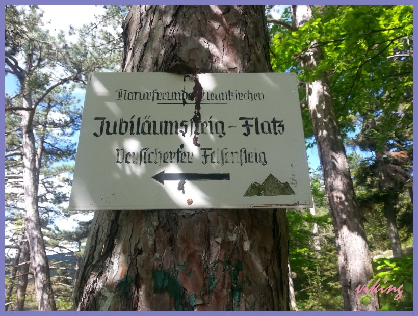Dieser 1983 zum 80jährigen Jubiläum der Neunkirchner Naturfreunde errichtete Steig ist "luxuriös" ausgestattet: Alle Leitern und Seile sind aus Aluminium und die Versicherungen sind mehr als ausreichend. Vom Parkplatz auf gelb markiertem Wanderweg bis zu einer Tafel "Zu den Klettersteigen", dann folgt man den Schildern bis zum Beginn des Steiges. Grüne Markierungen leiten durch den Wald zur langen Einstiegsleiter. Zwei weitere Leitern folgen, dann helfen Seile über ein aussichtsreiches Felsband hinweg zum Ende der Versicherungen.