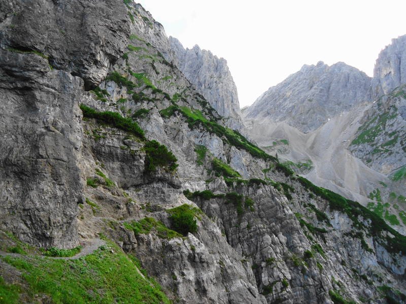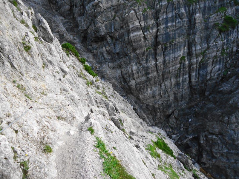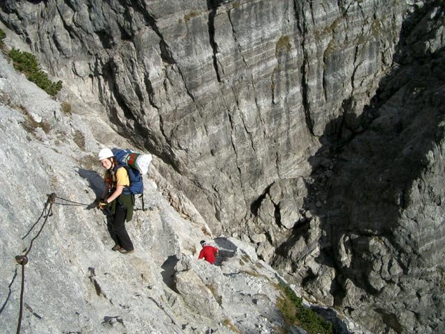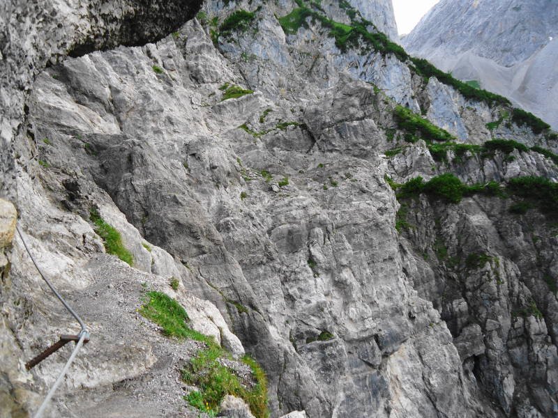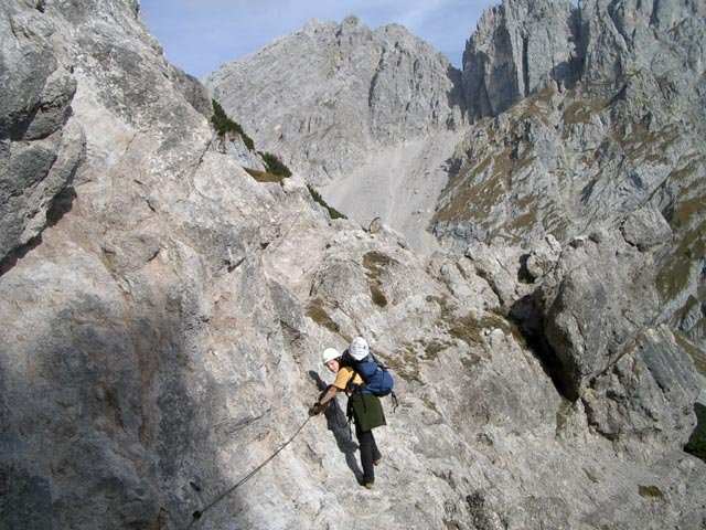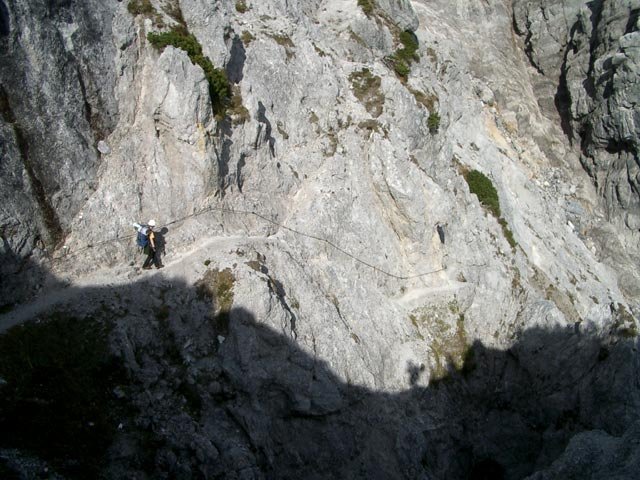 Der Steig führt zunächst über Platten und ein breites Band zu einem markanten Felsentor und dann in einer leicht auf- und absteigenden Querung zu einer Scharte. Von dieser steigt man über zwei eiserne Treppen und eine Leiter in einen Graben ab. Aus dem Graben folgt sogleich ein Aufstieg mit Drahtseilen und herausgeschlagenen Tritten, schließlich leitet eine letzte Querung zum Ausstieg.