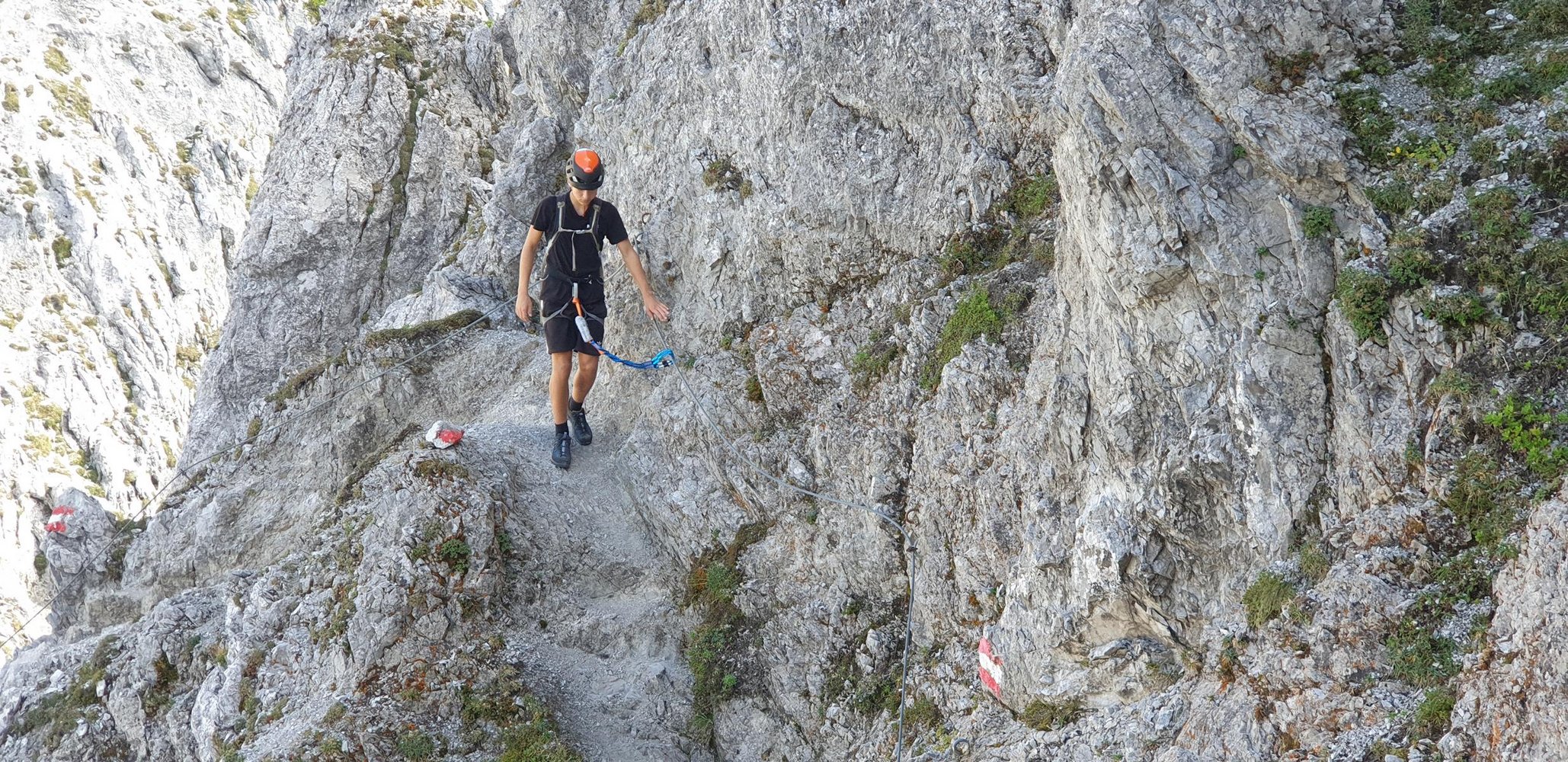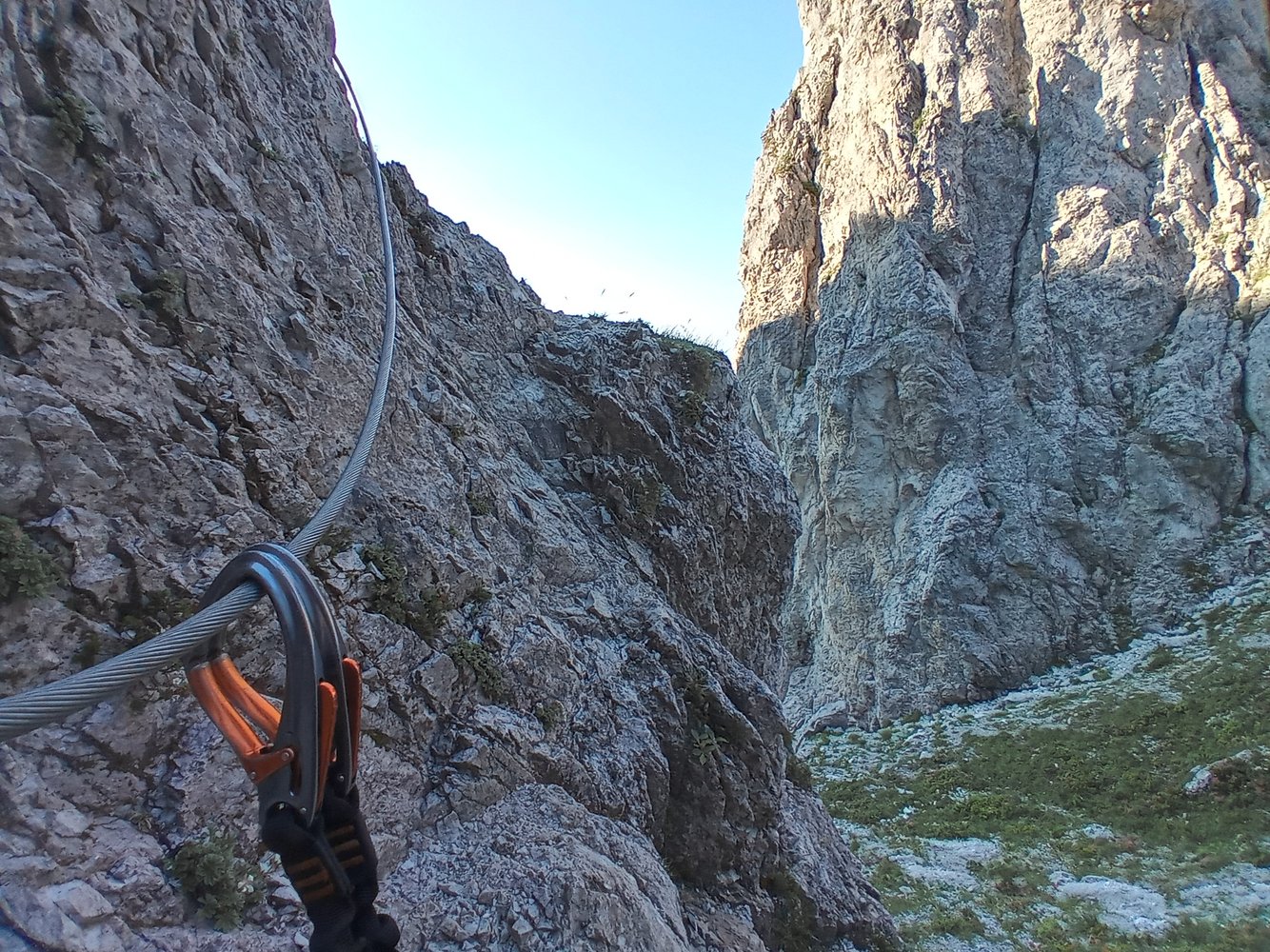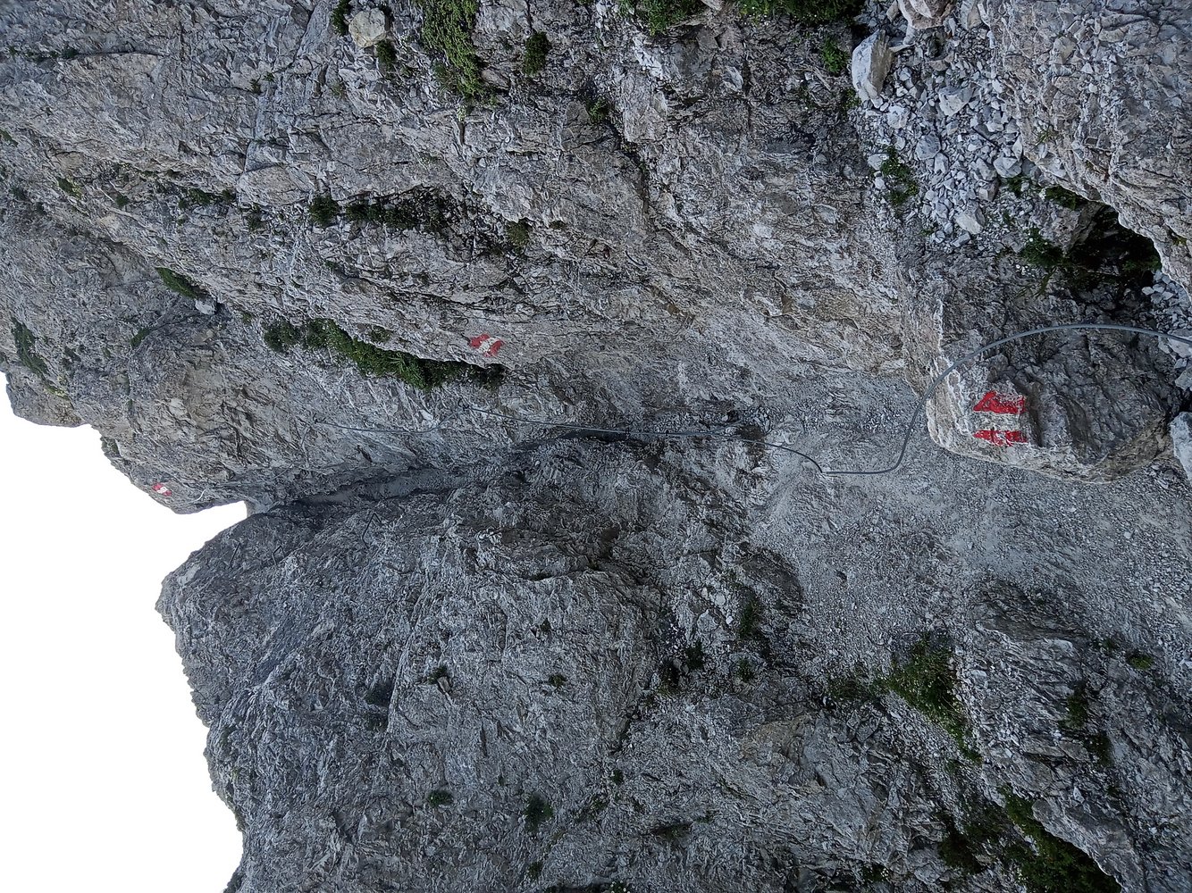 Sicherungsseil mit weiten Abständen zwischen den Verankerungen. An allen schwierigen Stellen ist eine Seilsicherung möglich.