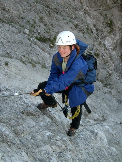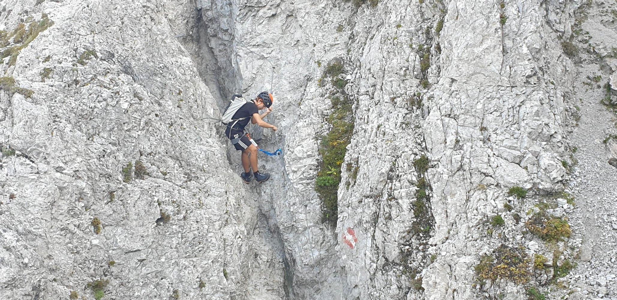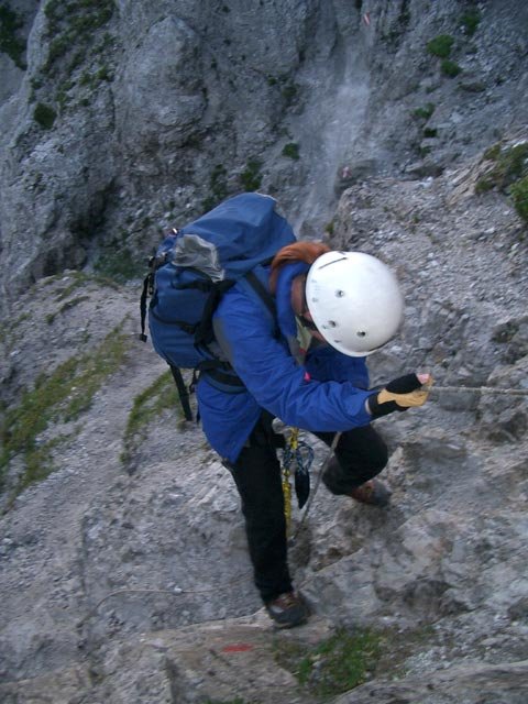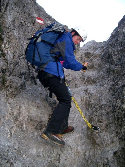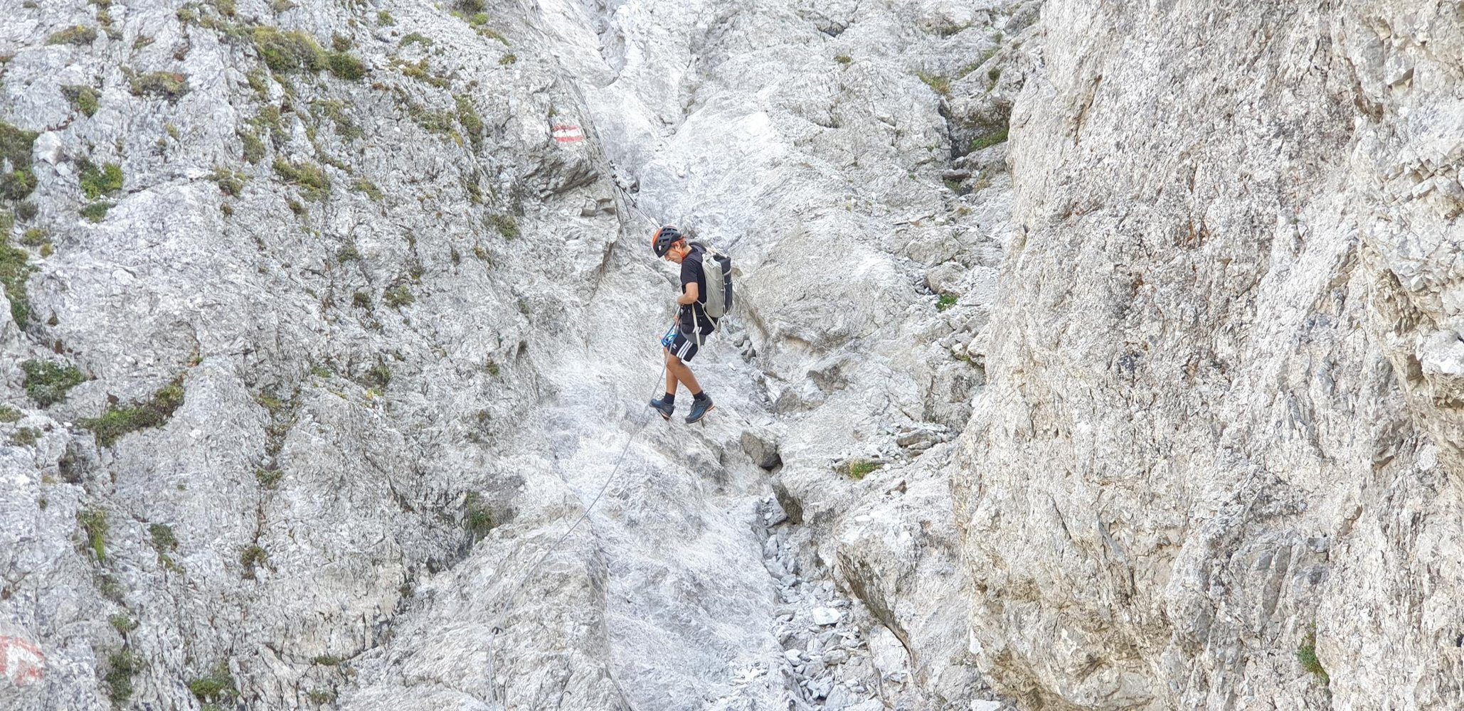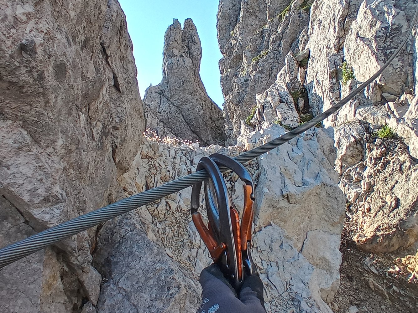 Sicherungsseil mit weiten Abständen zwischen den Verankerungen. An allen schwierigen Stellen ist eine Seilsicherung möglich.