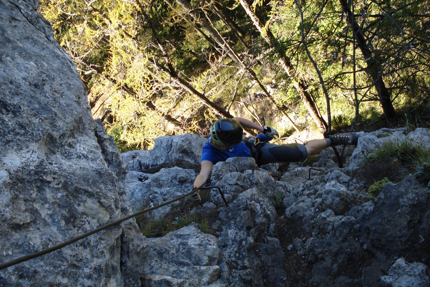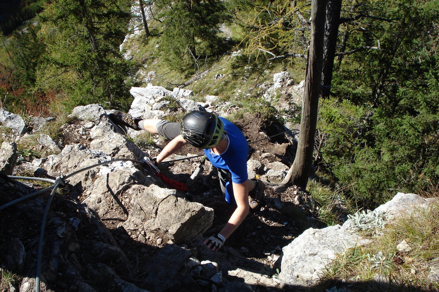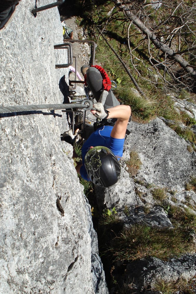 Mit Ausnahme des obersten Abschnitts, der umgangen werden kann, muss über den Klettersteig abgestiegen werden.