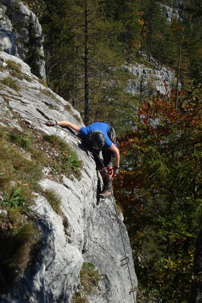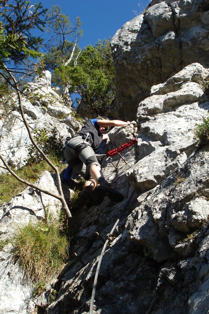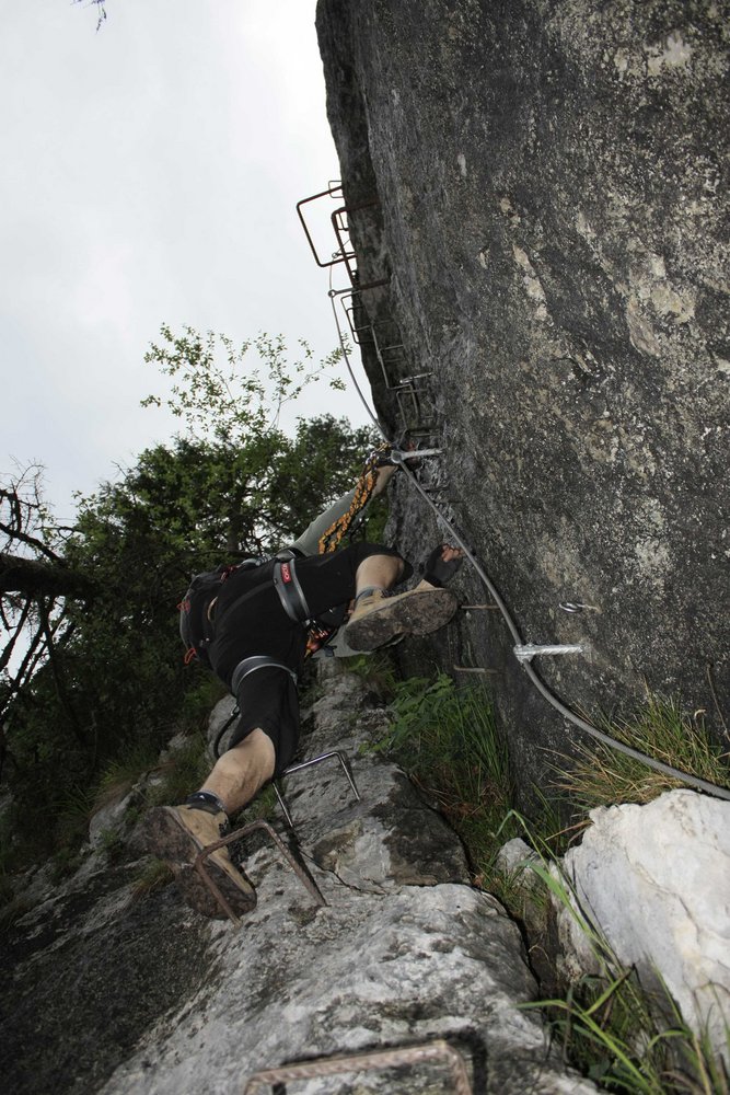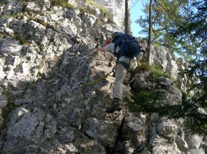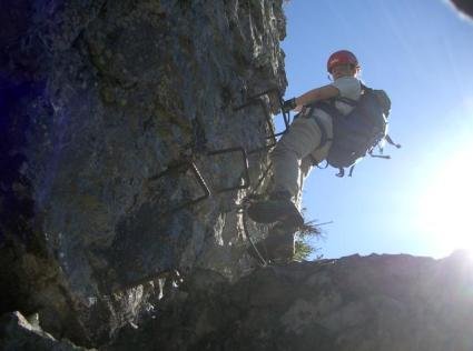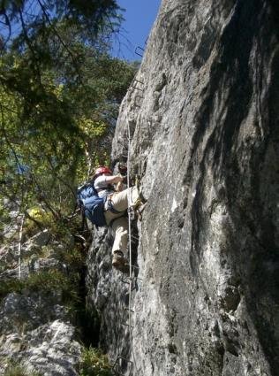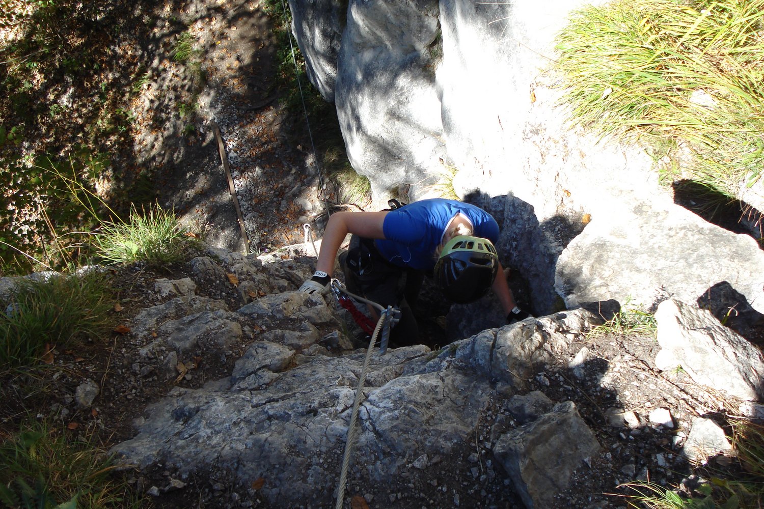 Mit Ausnahme des obersten Abschnitts, der umgangen werden kann, muss über den Klettersteig abgestiegen werden.