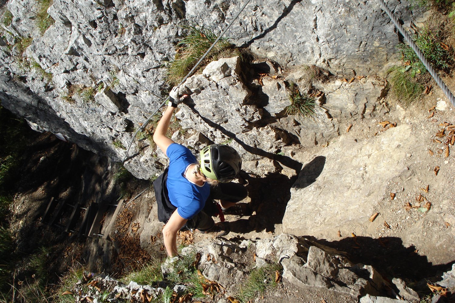 Komplette Klettersteigausrüstung, evtl. Klettersteighandschuhe und Sicherungsseil (min. 40 m).