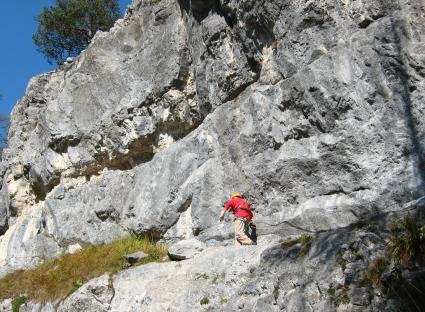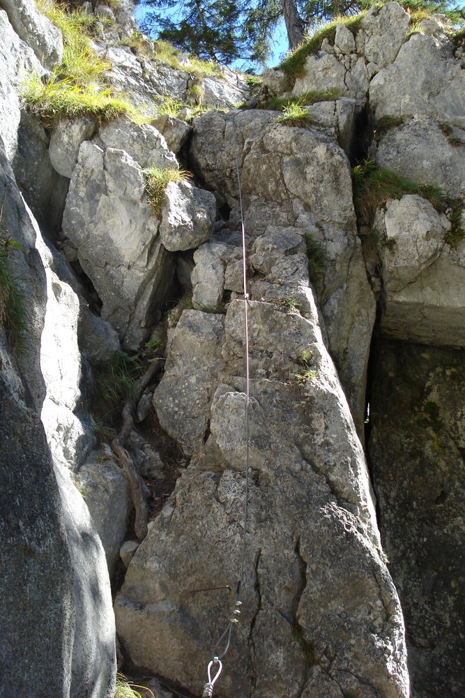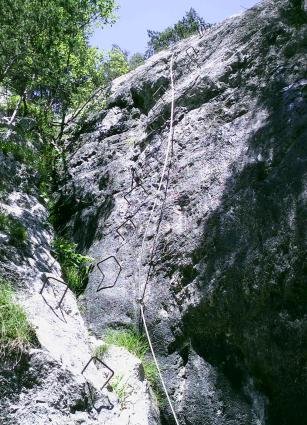 Nördlich der Straße, gegenüber der Bushaltestelle beginnt ein unmarkierter Steig. Diesen durch den steilen Wald zum ersten Felsaufbau (Inschrift, blauer Pfeil) hinauf. Unter den Felsen nach rechts den Steigspuren durch steiles Waldgelände folgen und eine mark., erdige, brüchige Rinne zu den Stahlseilen emporklettern.