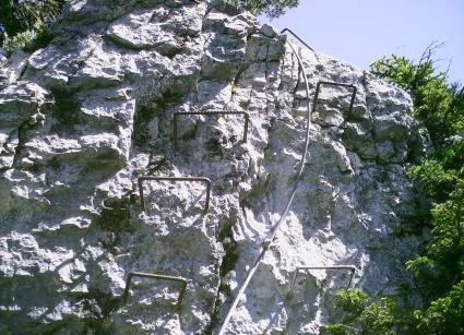 Dieser nette Sportklettersteig wurde von einem Outdooranbieter exklusiv für seine Kunden errichtet. Aufgrund der interessanten Einzelstellen und des tollen Tiefblicks auf die Salza mit ihren Wassersportlern hat sich die Existenz des Steigs jedoch bald herumgesprochen. Der Steig führt - leider etwas inhomogen und teilweise kompliziert - über die von vielen Waldzonen unterbrochenen Felsstufen an der Südwestseite des Mendlingsteins aufwärts.