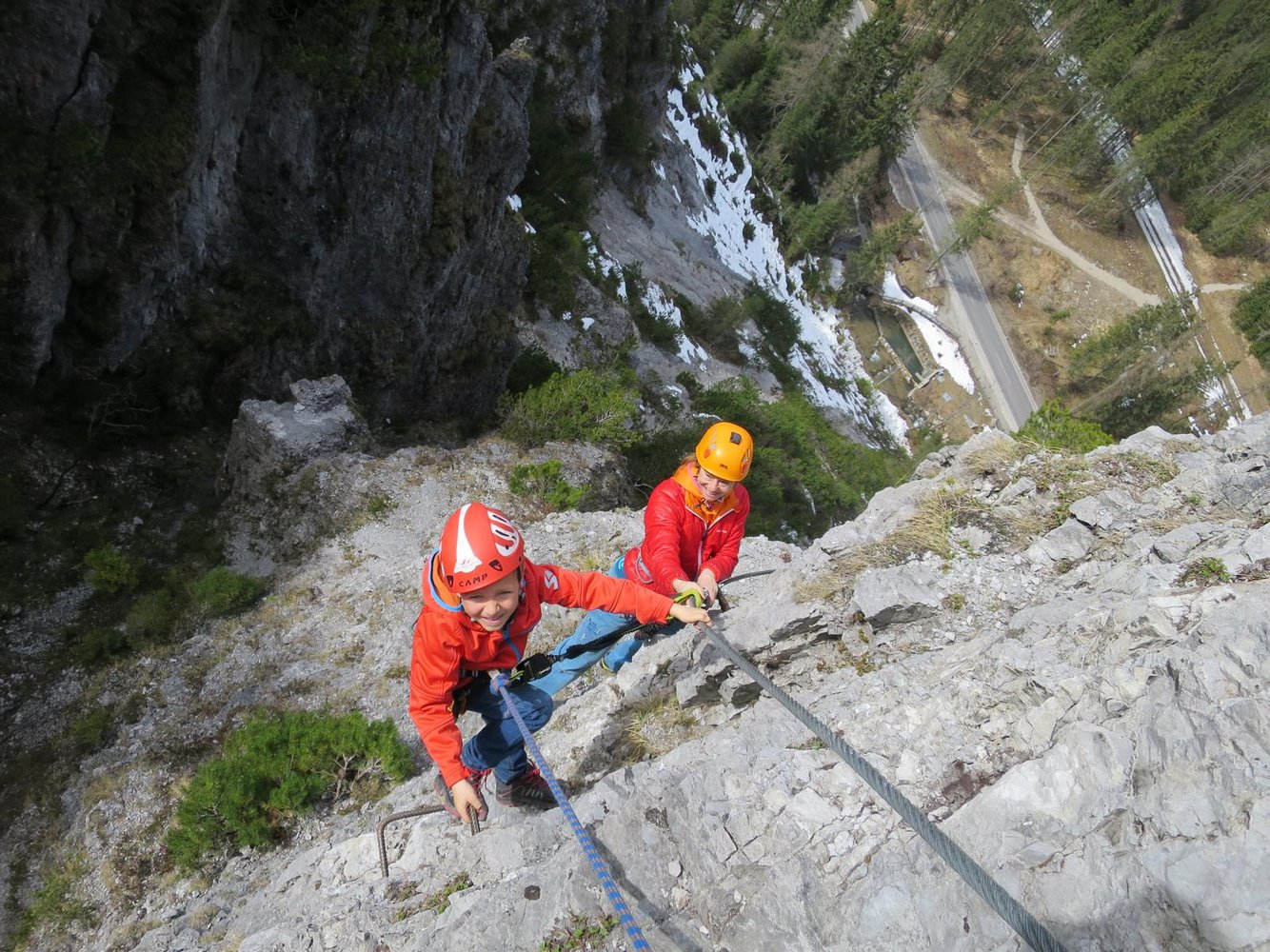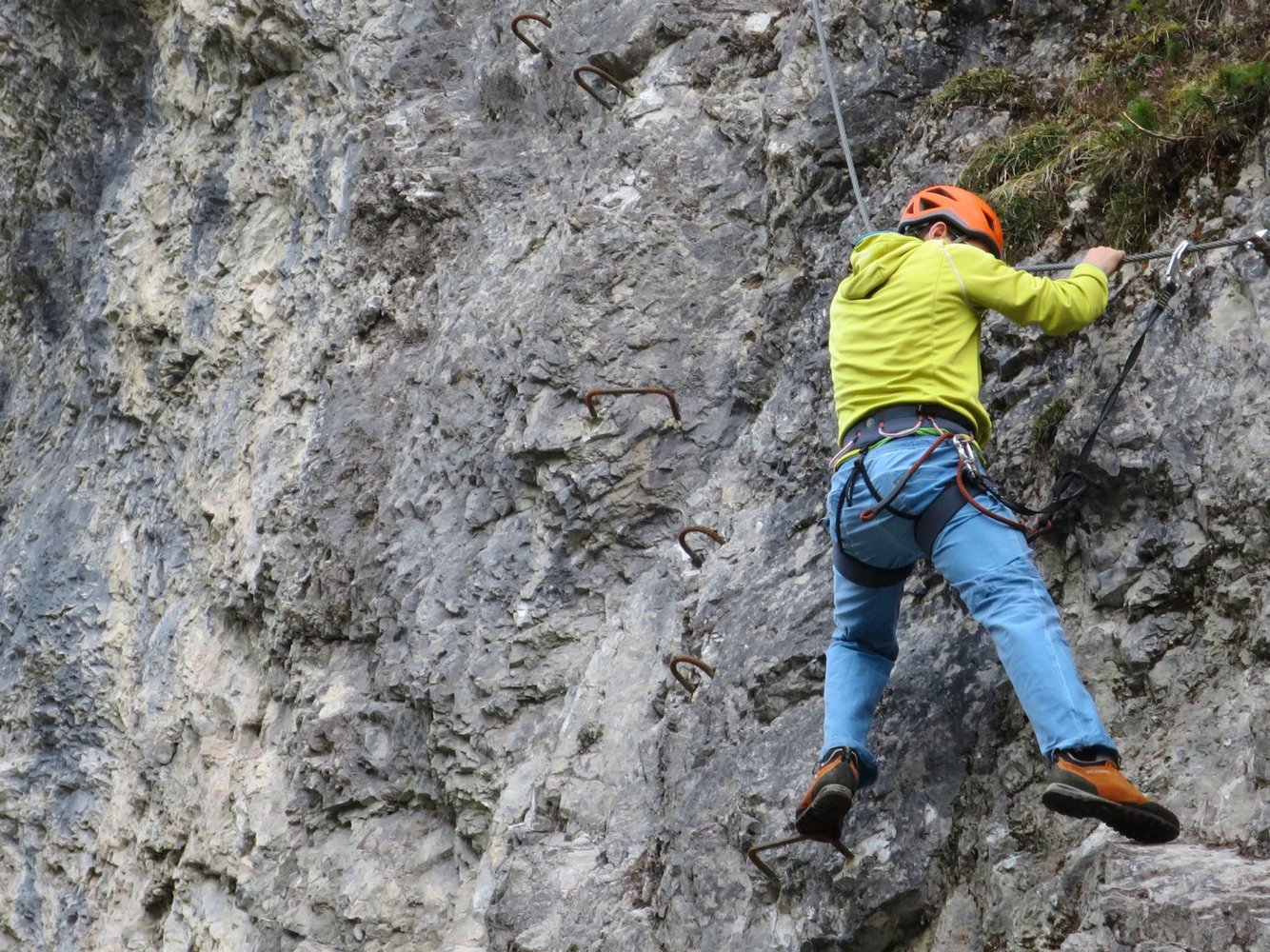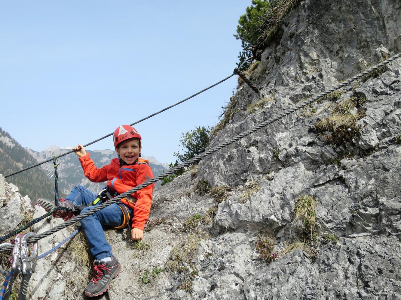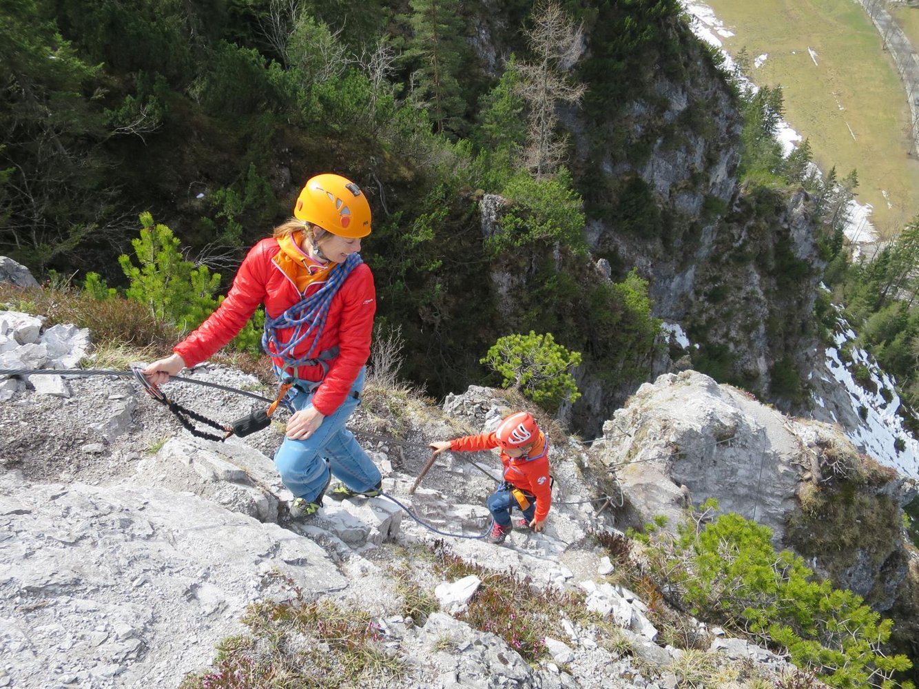Komplette Klettersteigausrüstung und Helm, evtl. Klettersteighandschuhe. Für schwächere Klettersteiggeher und Kinder ein Sicherungsseil.