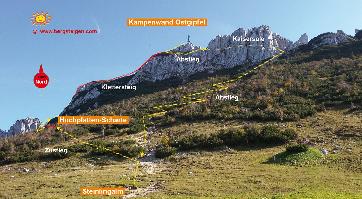 Von der Bergstation auf Weg und Forstraße anfangs kurz ansteigend in ca. 20 min bis kurz vor die Steinlingalm. Von dort auf dem steinigen Weg steil hinauf in Richtung Kampenwandkreuz. Bei den ersten Latschen zweigt man links in Richtung Hochplatte ab und folgt dem Pfad bis zur Hochplattenscharte. Auf der Südseite kurz versichert (A) hinunter und dann zum schon sichtbaren Grassattel aufsteigen. Auf der Südseite des Sattels zweig rechts ein Steig ab ("Sehr steiler Aufsteig auf eigenen Gefahr") ab. Auf diesem Steig tlw. steil durch Latschen hinauf zum Beginn des Stahlseils.