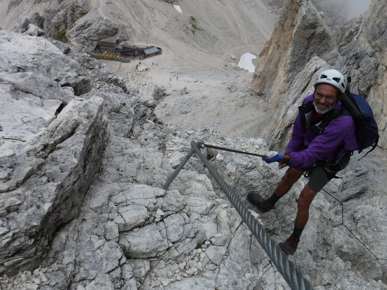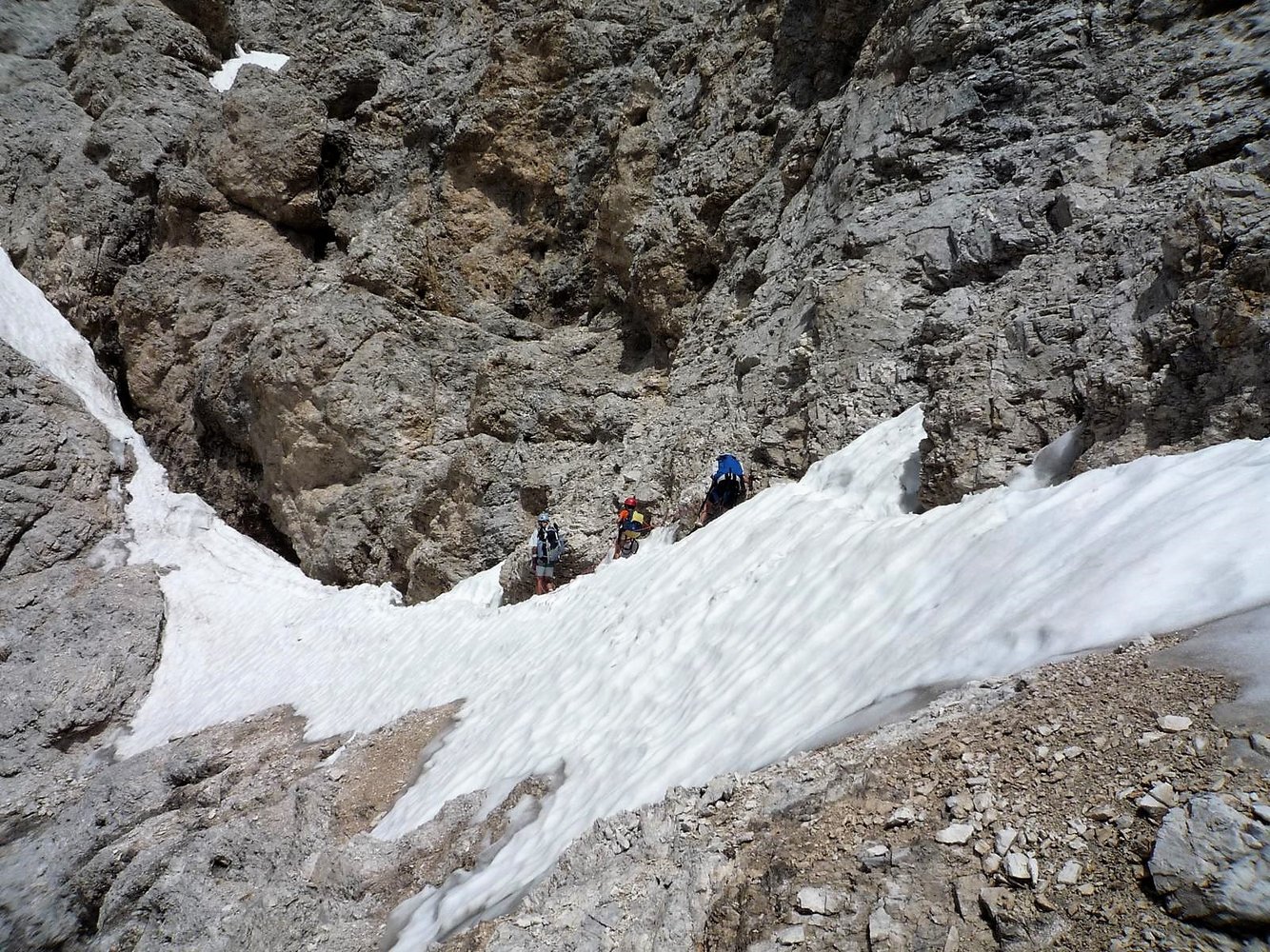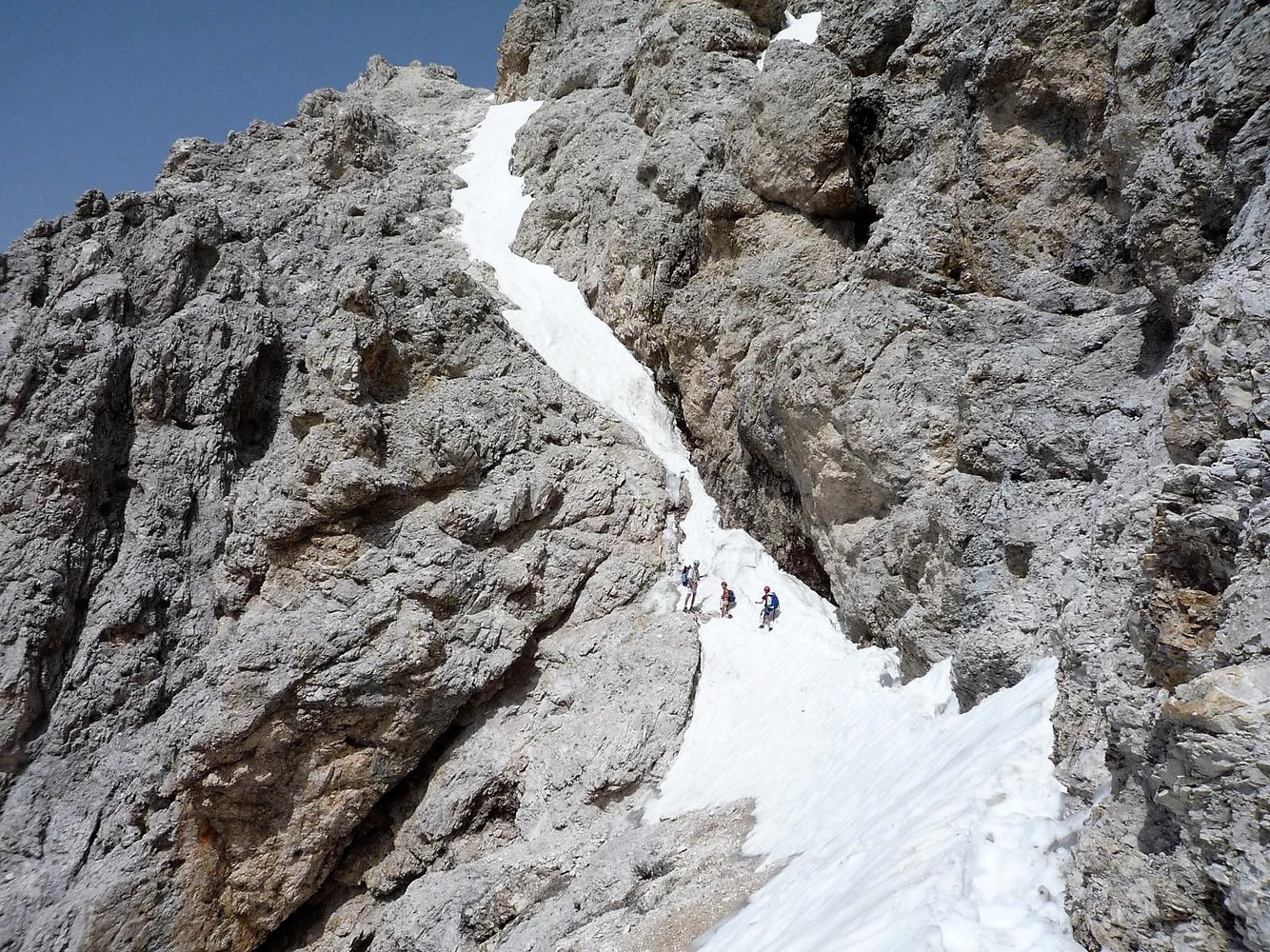 Eine schöne Runde nach dem Abstieg über den Ostanstieg: Im Antermoiatal über den Scalette Steig, welcher noch vor dem Antermoia See auf dem Weg 583 B rechts zum Passo Laussa (2700 m) führt. Dort weiter über den Passo Scalette (dort kurz versichert, A) zum Rifugio Gardeccia zurück (ca. 2 Std.). Talabstieg Gardeccia – Pera (Val di Fassa) ca. 1 Std..
