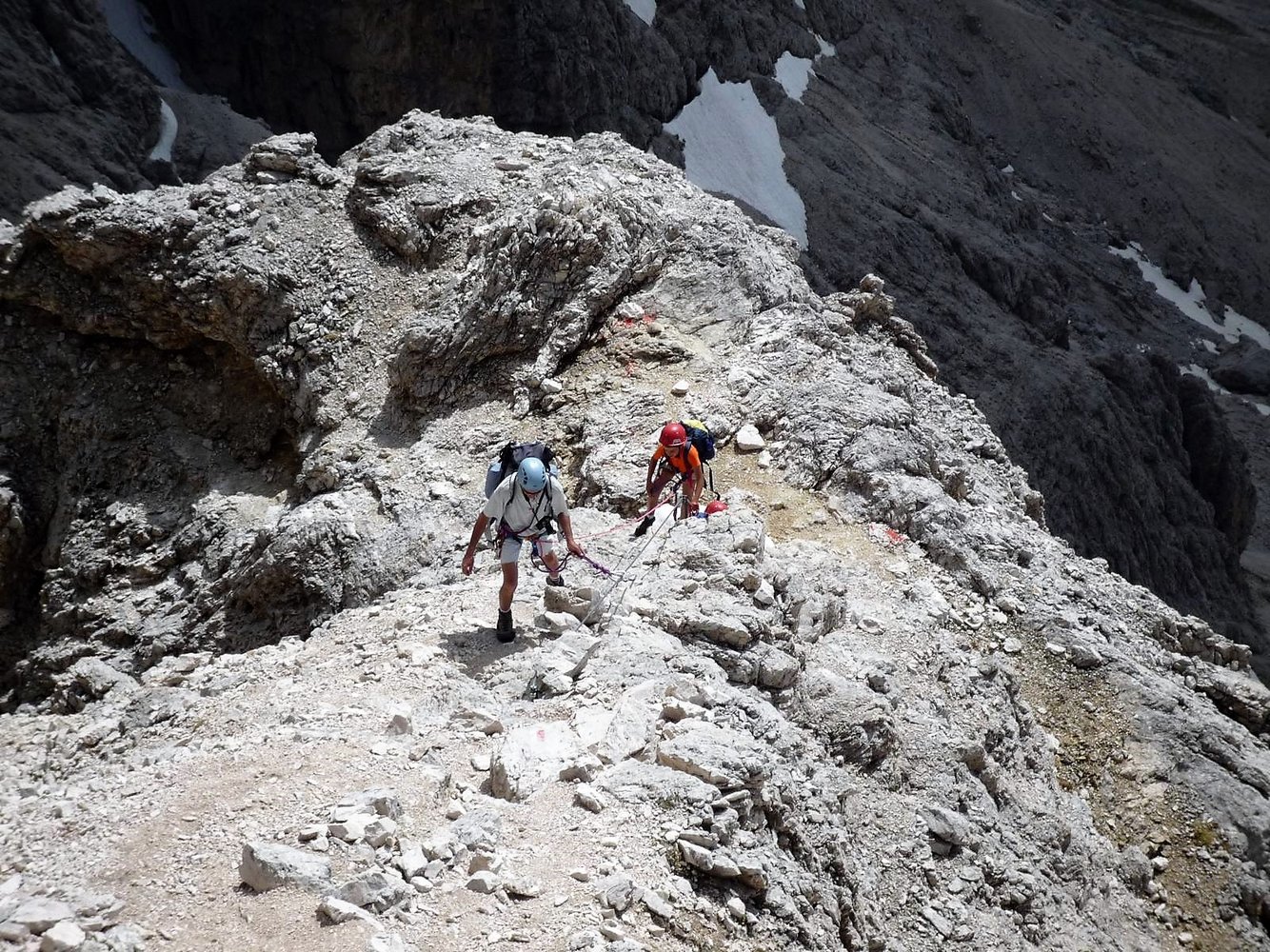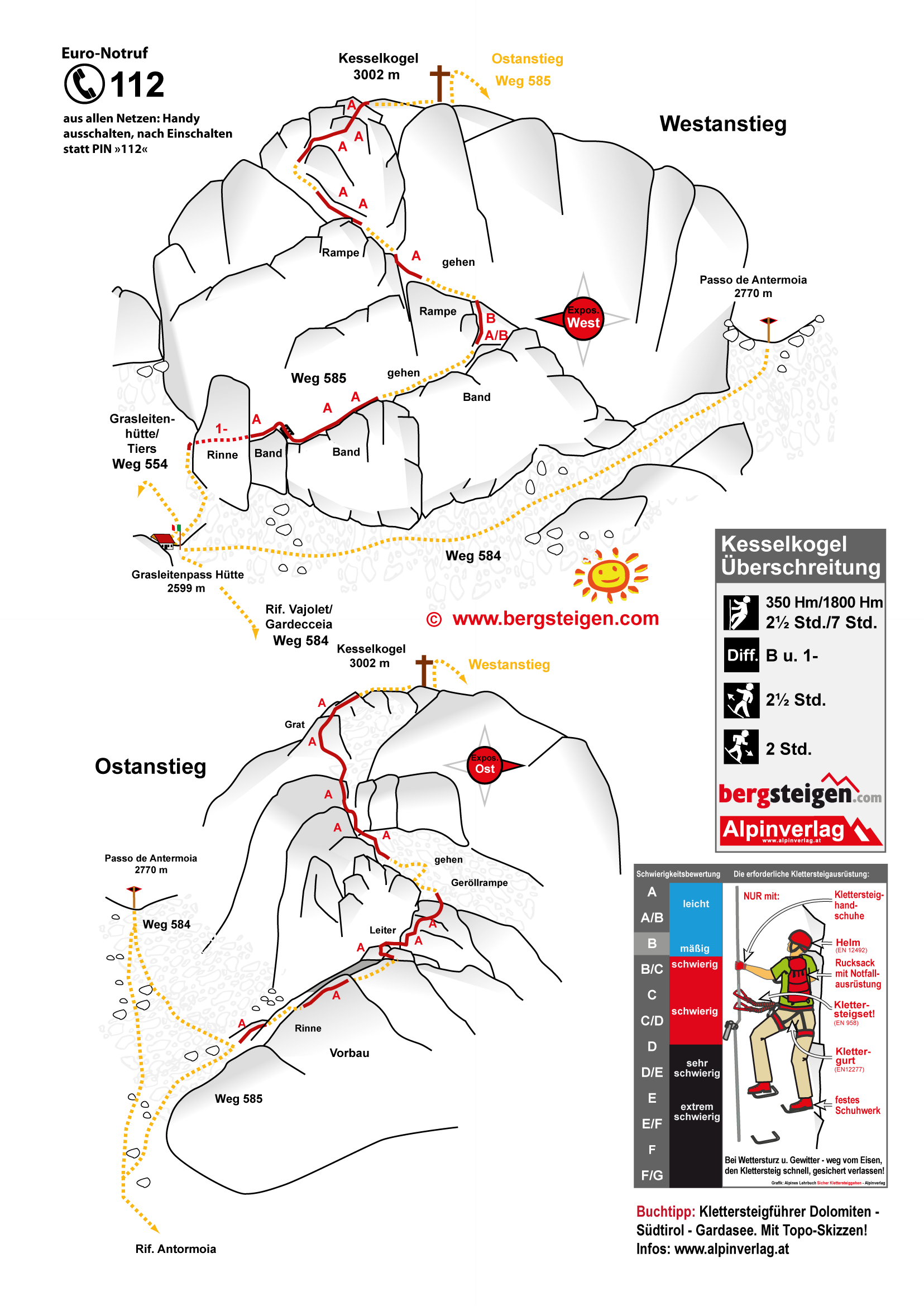 Westanstieg: Kurz in eine von einem Vorbau verdeckte Rinne queren, und durch diese zu einem Band aufwärts (Stellen 1-). Dem Band (A) zu einer Leiter folgen, über welche man (A) auf ein weiteres Band absteigt. Dort anfangs auf dem noch schmalen und versicherten (A u. A/B) Felsband leicht ansteigen, bis der Steig links über eine steile Felsstufe (A/B und B) zum nächsten Querband führt. Diesem linkshaltend, stellenweise versichert (A) bis kurz vor den Nordgrat folgen. Auf diesem rechts, gestuft (A) zum Gipfelgrat und auf dem Grat südlich zum höchsten Punkt. Ostanstieg (Abstieg): Auf dem Gipfelgrat noch ein kurzes Stück nach Süden, bis man auf die ersten Versicherungen trifft, die unschwierig (A) zur Ostwand leiten. Links einer Geröllrinne auf ein anfangs wieder schmales Band absteigen (A). Dem Band nach Norden, um ein Eck herum folgen (A) und auf der großen Schotterrampe auf einer Wegspur weiter absteigen, bis der Steig das Band nach links zu den Felsen verlässt. Weiter abwärts (seilversichert und zwei Leitern) zum Vorbau, der spaltartig vom Hauptfels getrennt ist. Den Vorbau, an dessen rechten Rand, anfangs im Gehgelände, dann versichert (A) weiter absteigen und nach rechts durch eine Rinne verlassen. Noch eine kurze versicherte Passage (A) und schon steht man im Antermoia-Tal.