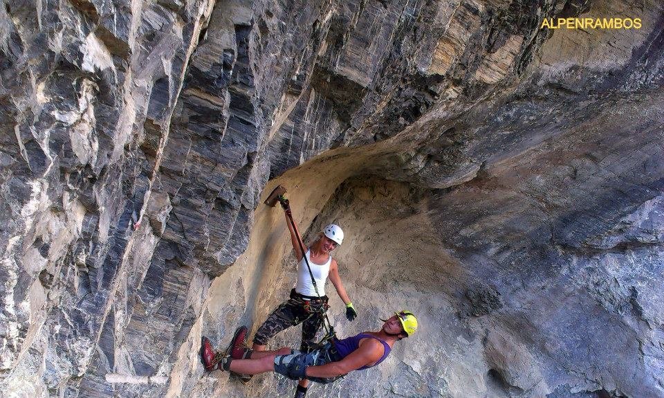 Nach links geht es durch den alten Stollen (Höhle) zur Einstiegsstelle des spektakulären Höhlensprints (E/F). Dieser ist auf über 20 Höhenmeter überhängend und nur für sehr gute und erfahrene Klettersteiggeher geeignet!